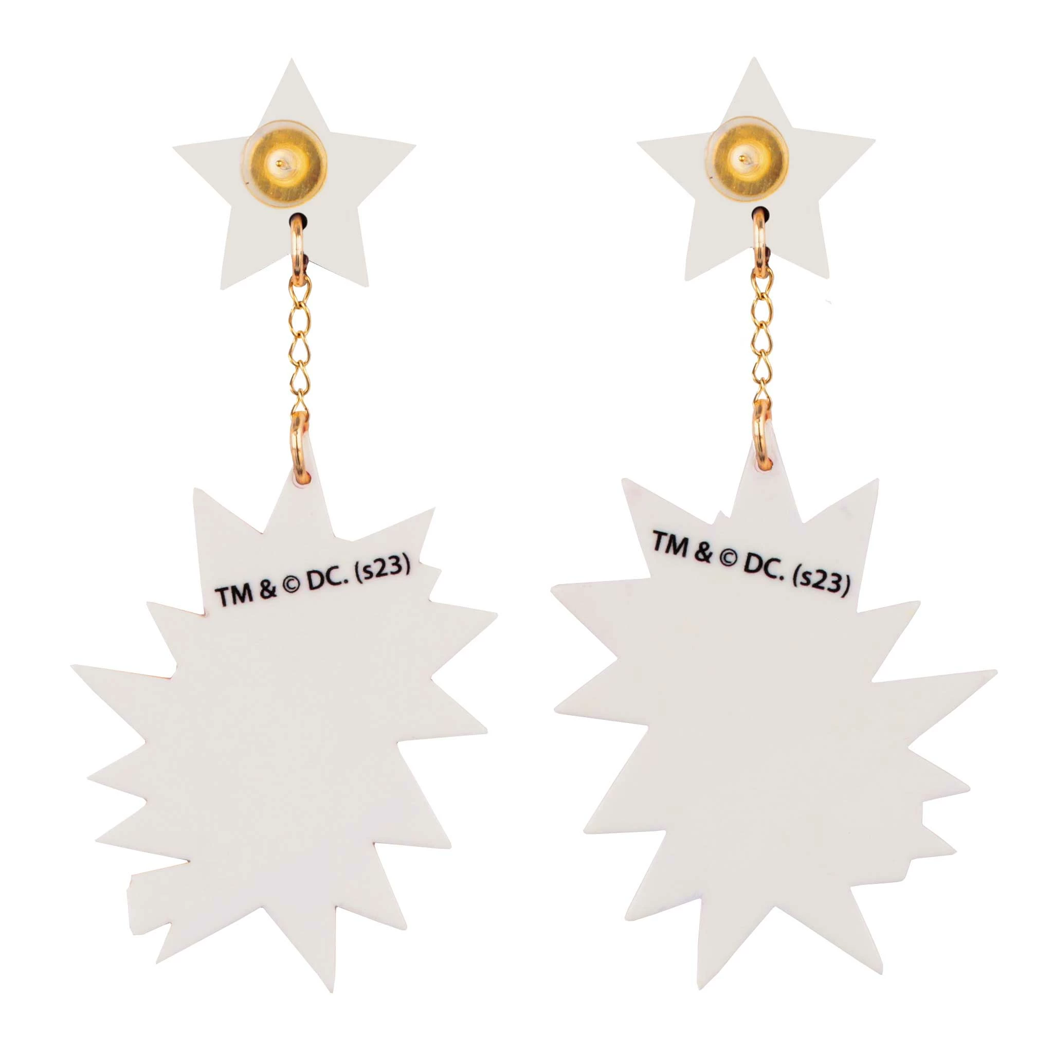 The ultimate comic book style, these high concept acrylic earrings are BLAM-tastic! BAM! POW! Each earring hangs from a contrasting star emblazoned with the Justice League logo, with a golden link chain drop and post fastening. Supplied in a Justice League branded gift box for ultimate impact!