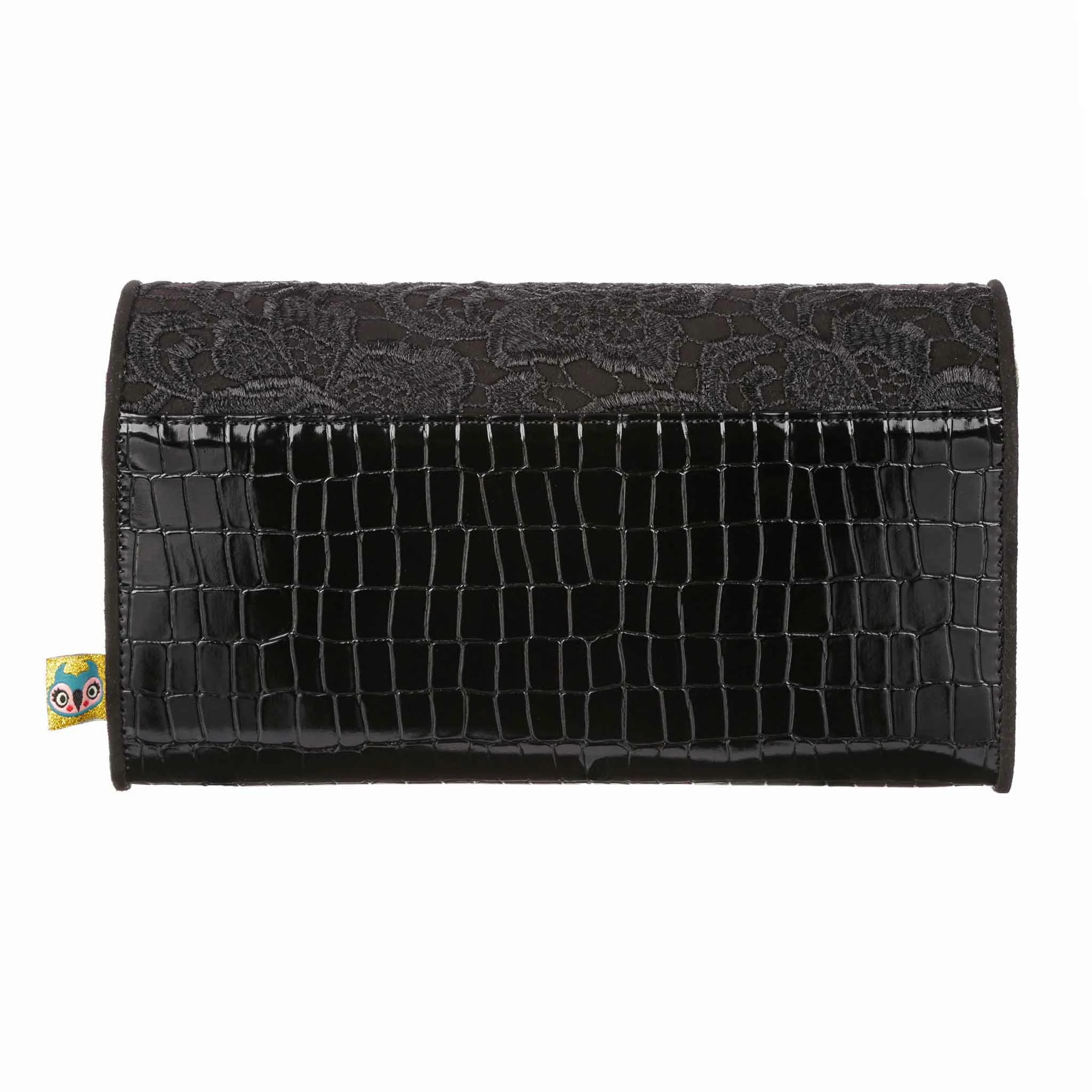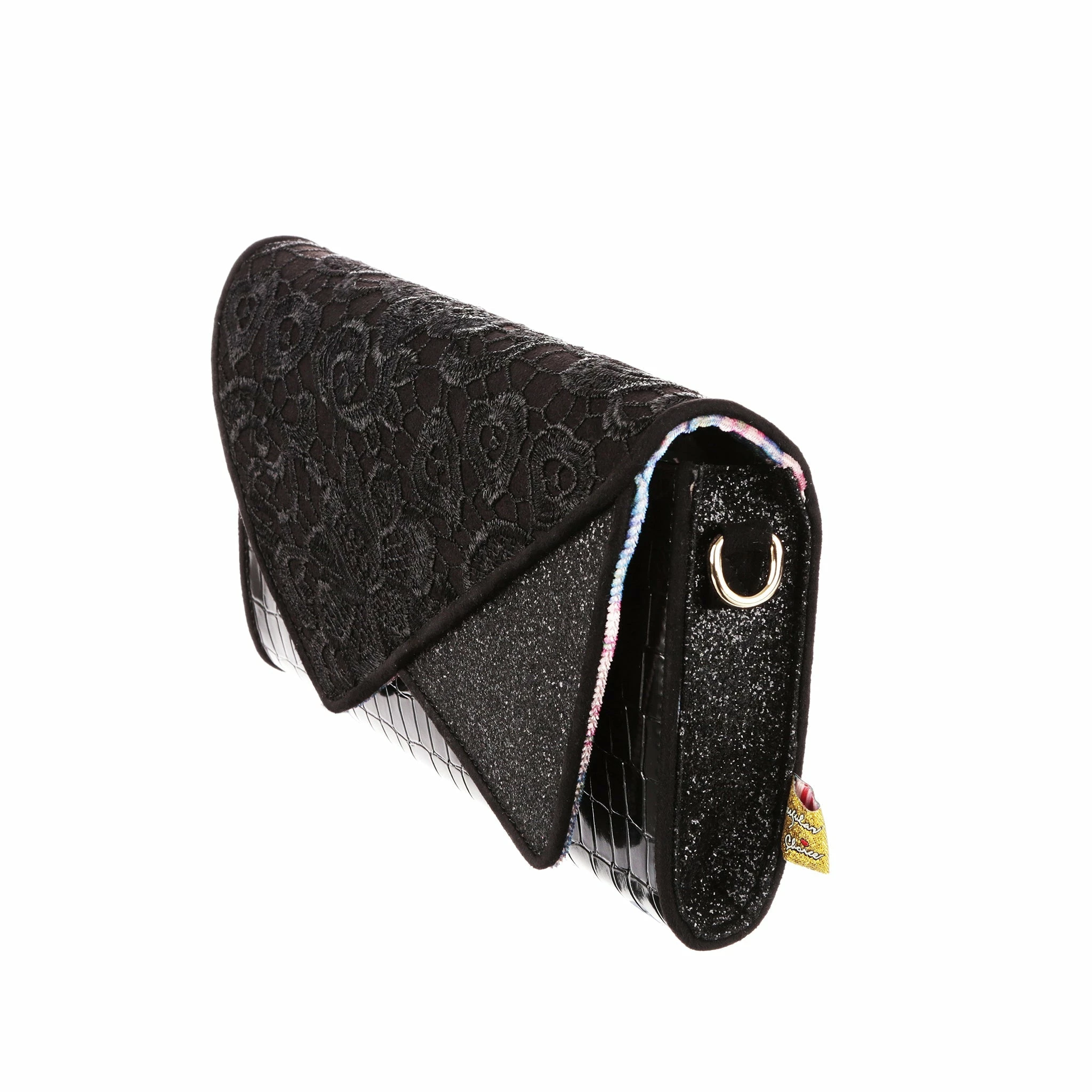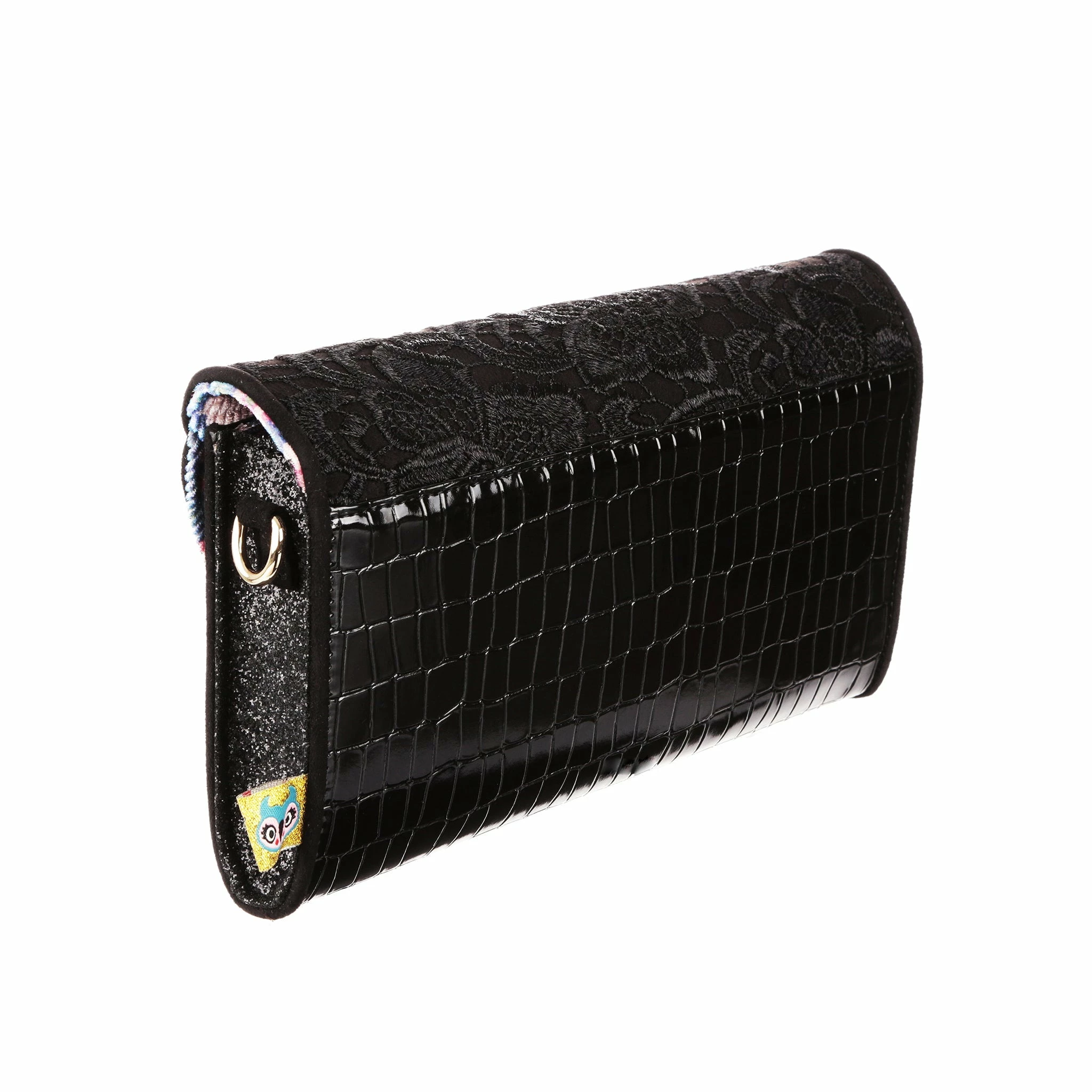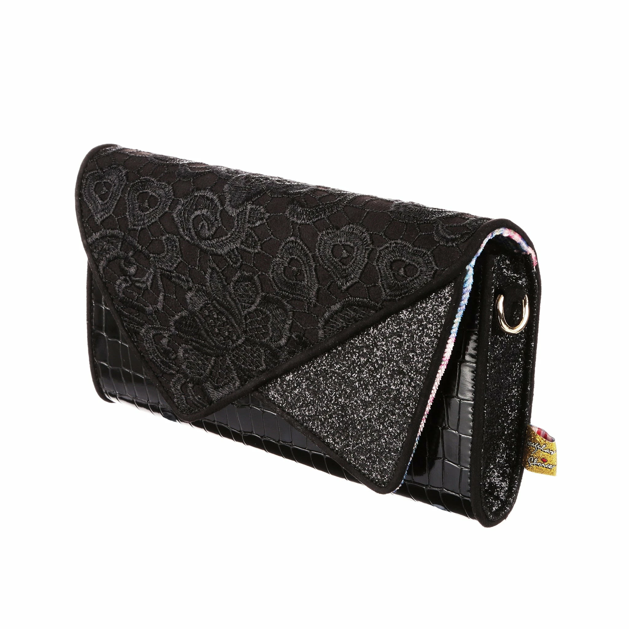 Slip this envelope clutch bag under your arm and its time to hit the town! Big enough to fit all the essentials, and some non-essentials, and with a removable strap this bag is sure to become a go to! A mixture of lace, shiny mock-croc fabric and sparkling glitter gives it an elegant feel, perfect for wherever the night takes you!