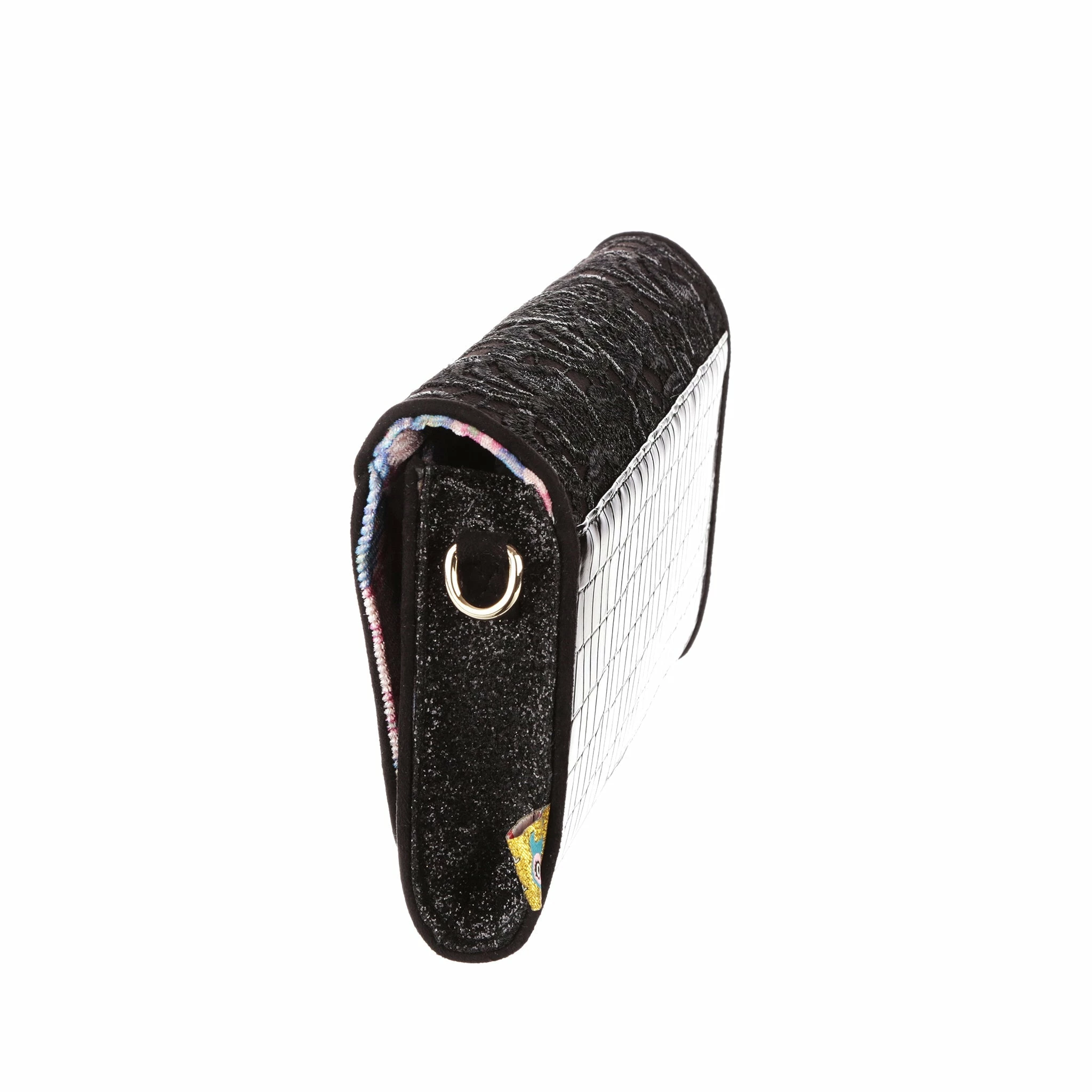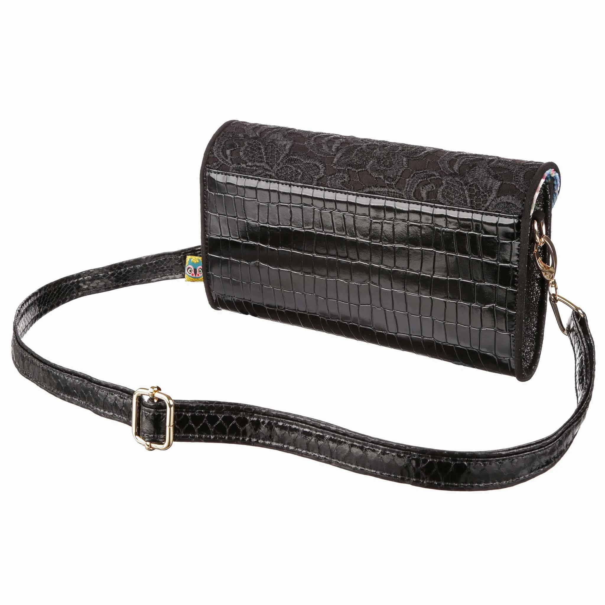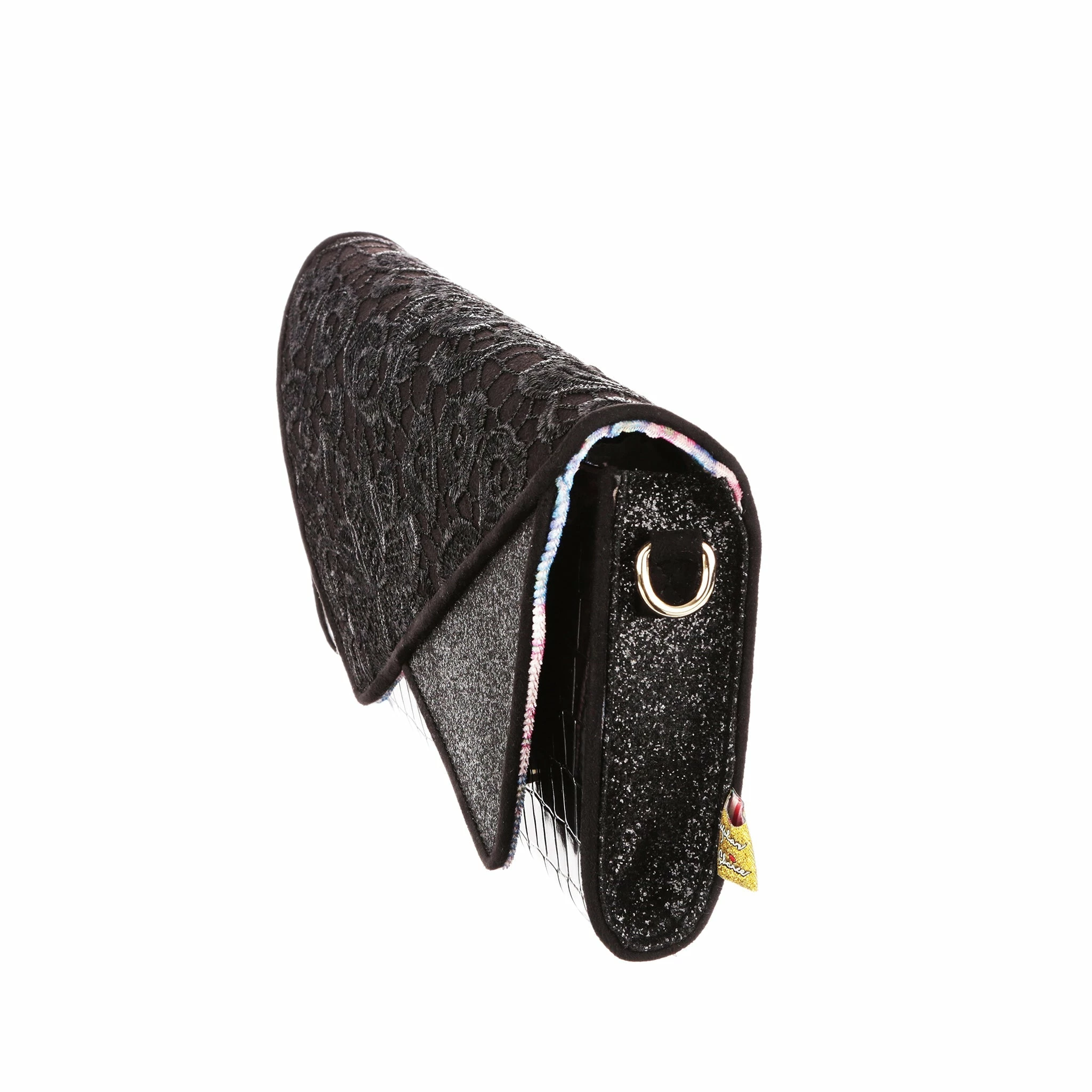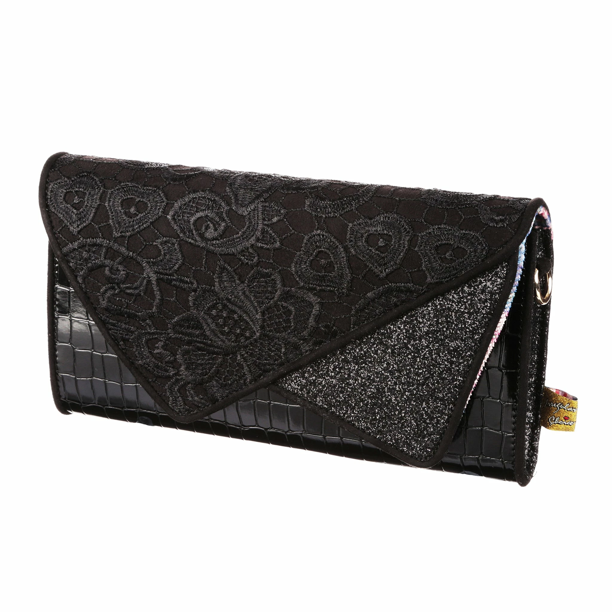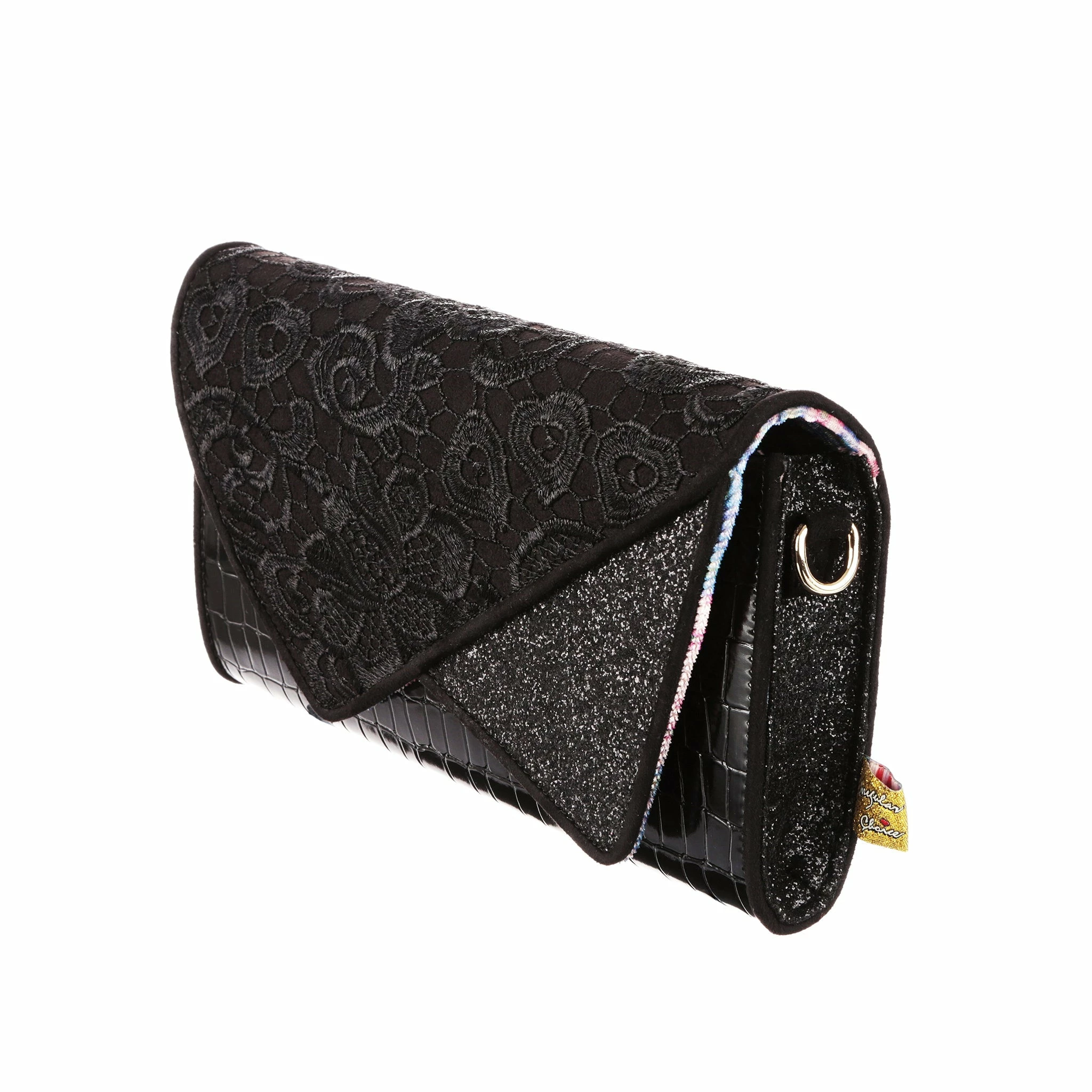 Slip this envelope clutch bag under your arm and its time to hit the town! Big enough to fit all the essentials, and some non-essentials, and with a removable strap this bag is sure to become a go to! A mixture of lace, shiny mock-croc fabric and sparkling glitter gives it an elegant feel, perfect for wherever the night takes you!