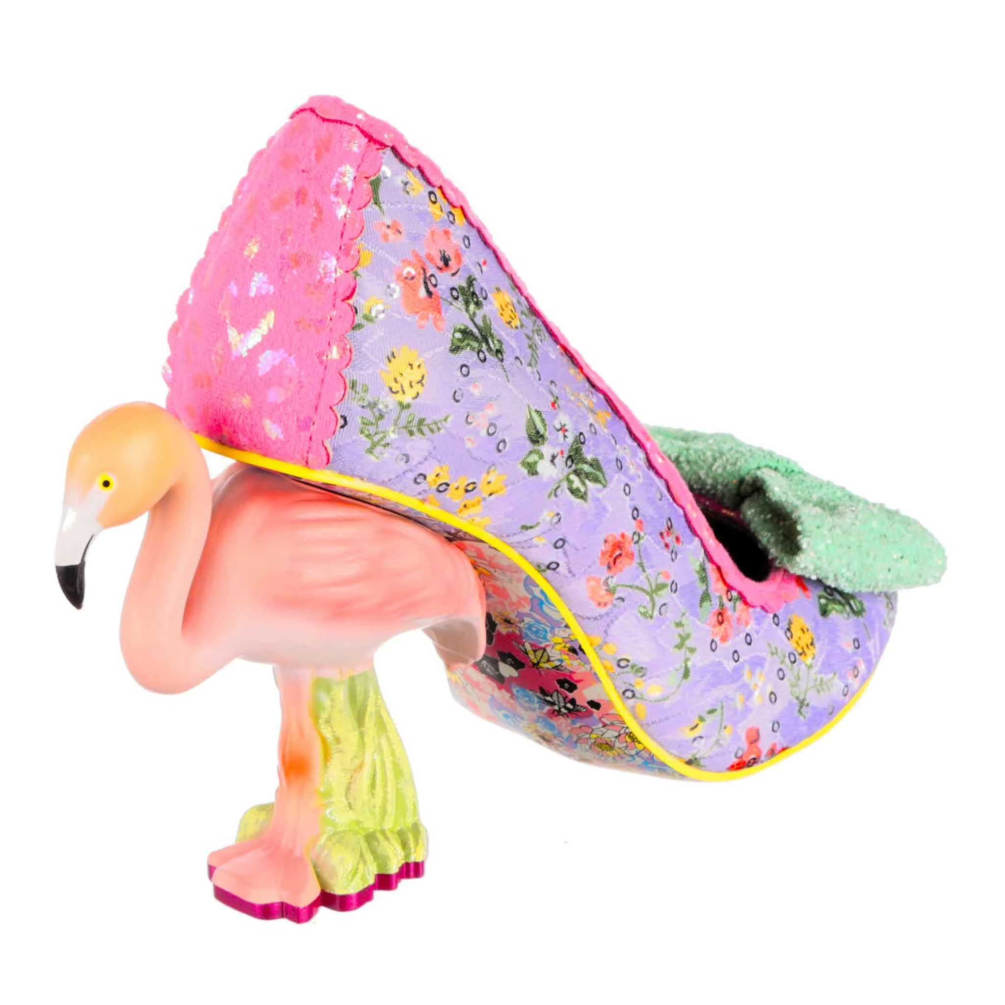 What the flock?! Flamingo heels are back, a fan favourite from 2016 have made a return after 7 years! The bird heel is paired with lilac and pink floral fabric, and contrasted with a mint green glitter bow, perfect for adding to your summer wardrobe!