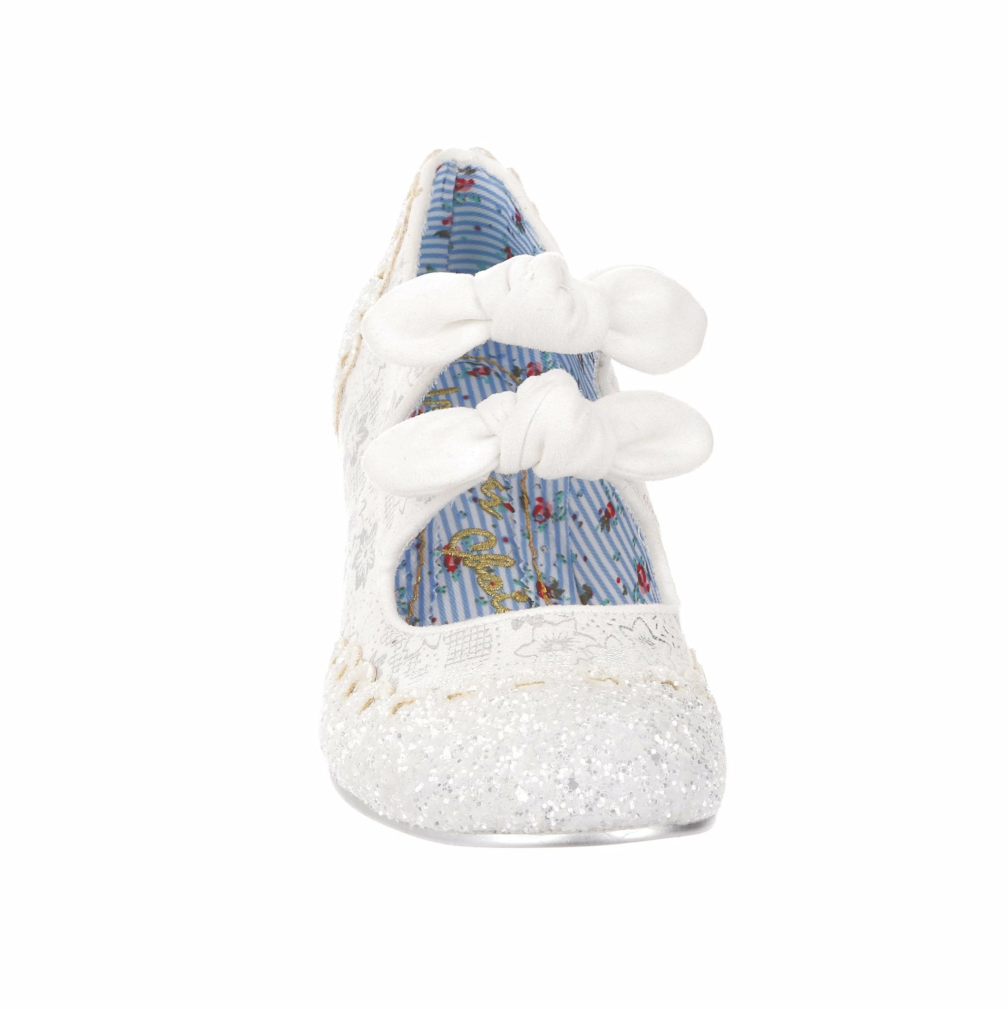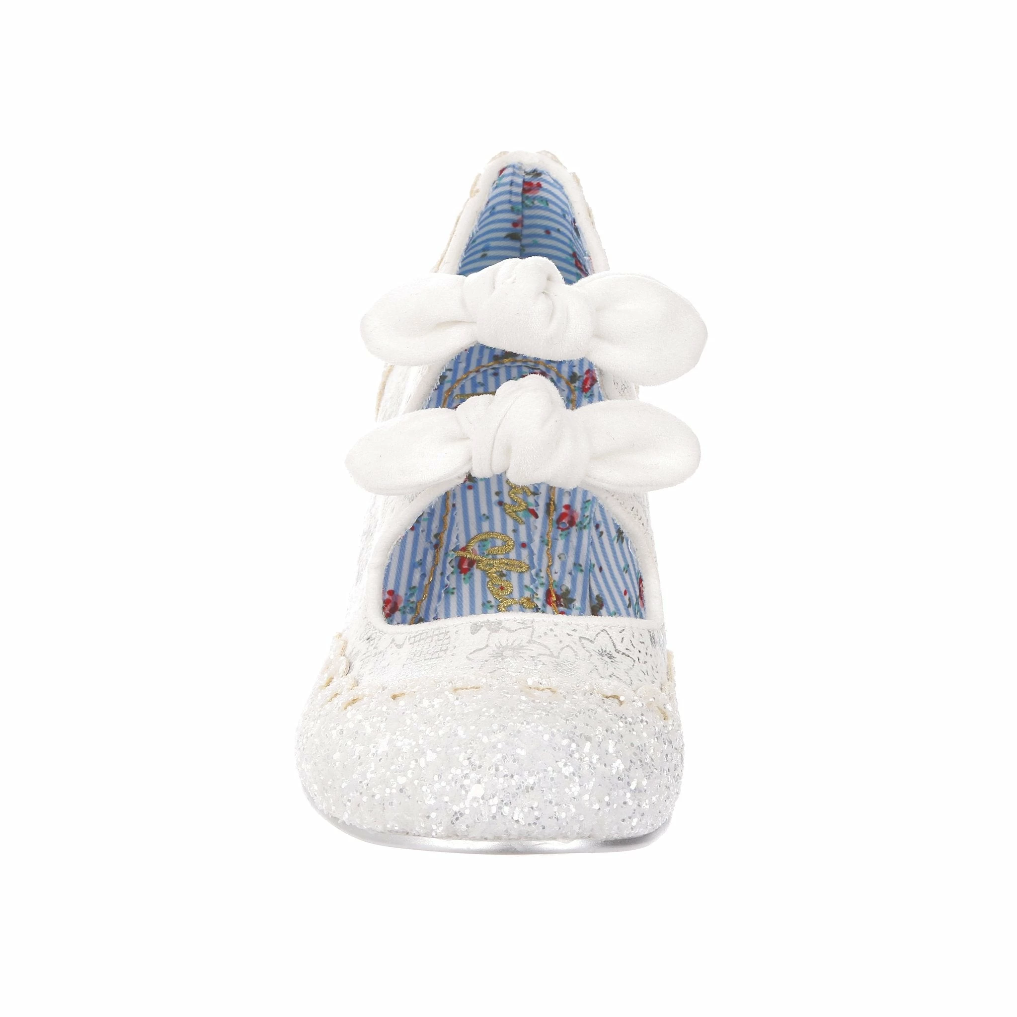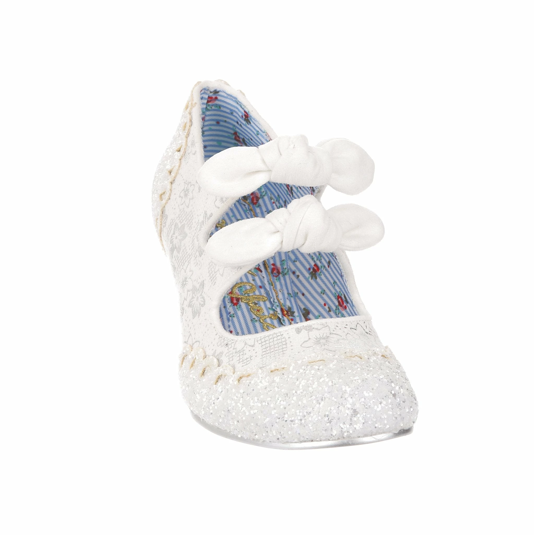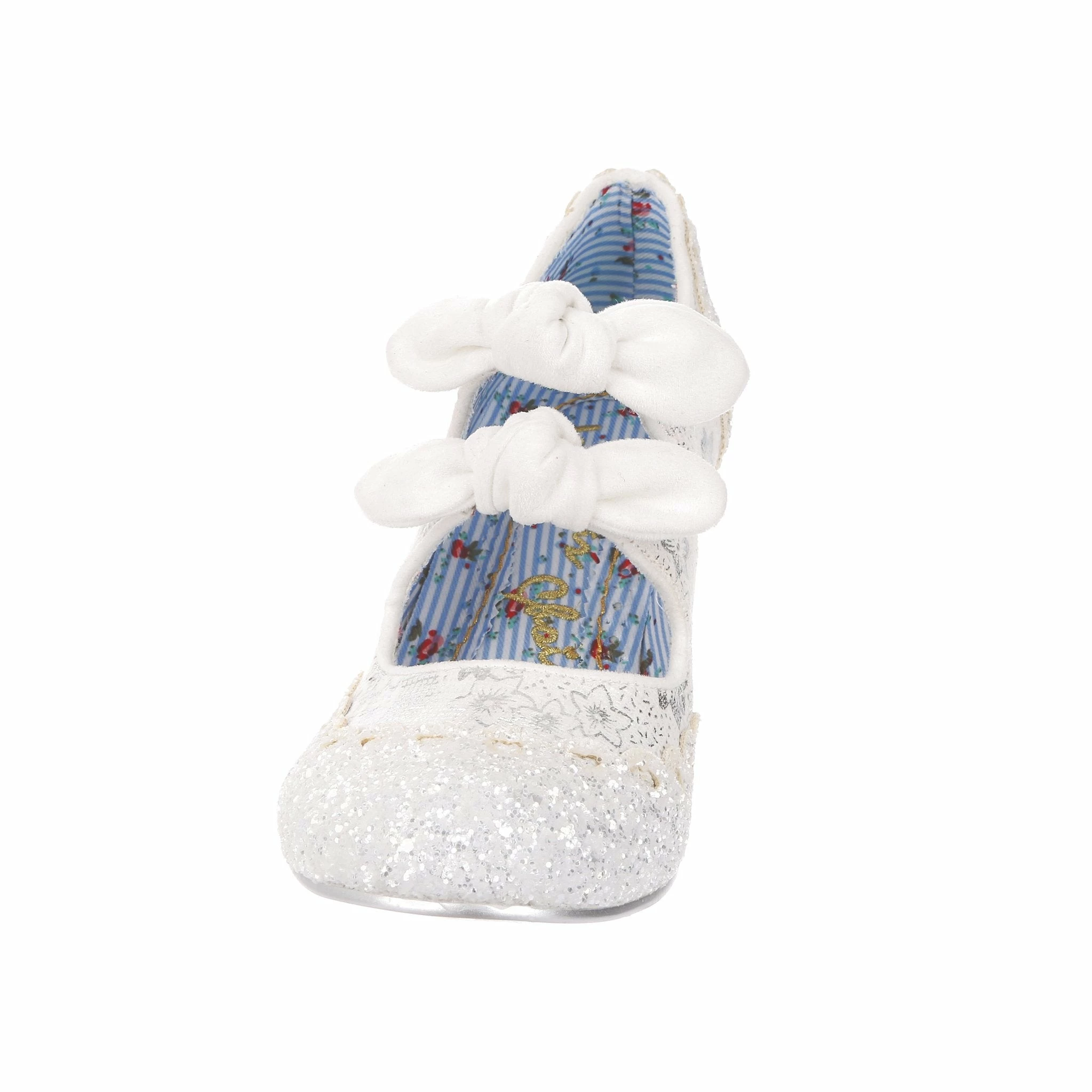 Aren’t these wedding shoe heaven?! Sparkle and shine with our iconic Calendulas that have been reimagined for your bridal dreams! With a subtle white and silver floral and stunning white glitter toe, with antiqued cut out hearts for added romance! Finished with twin bows on the straps that hides elastic sides to make it easy to slip these beauties on. Choose these as your happily ever after!