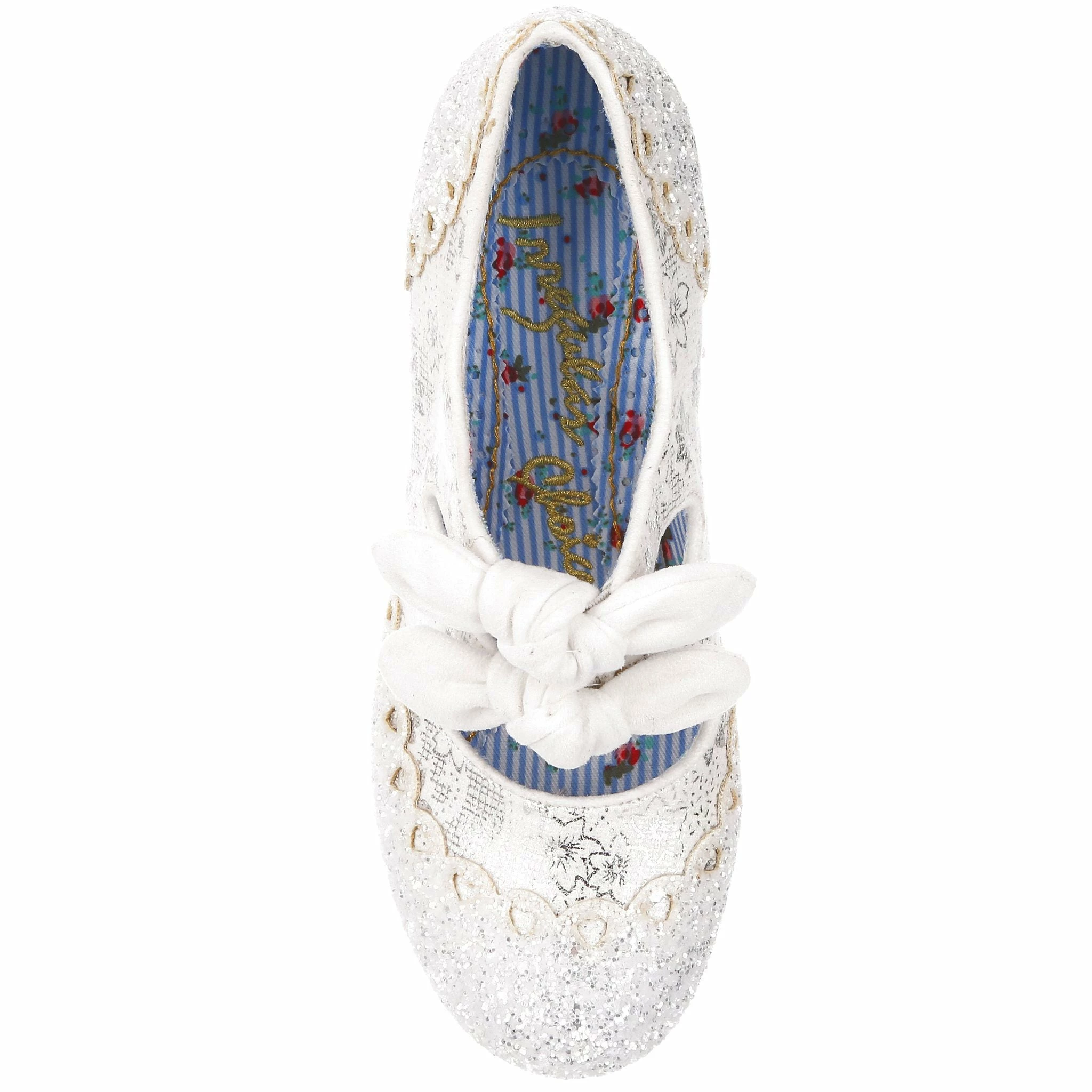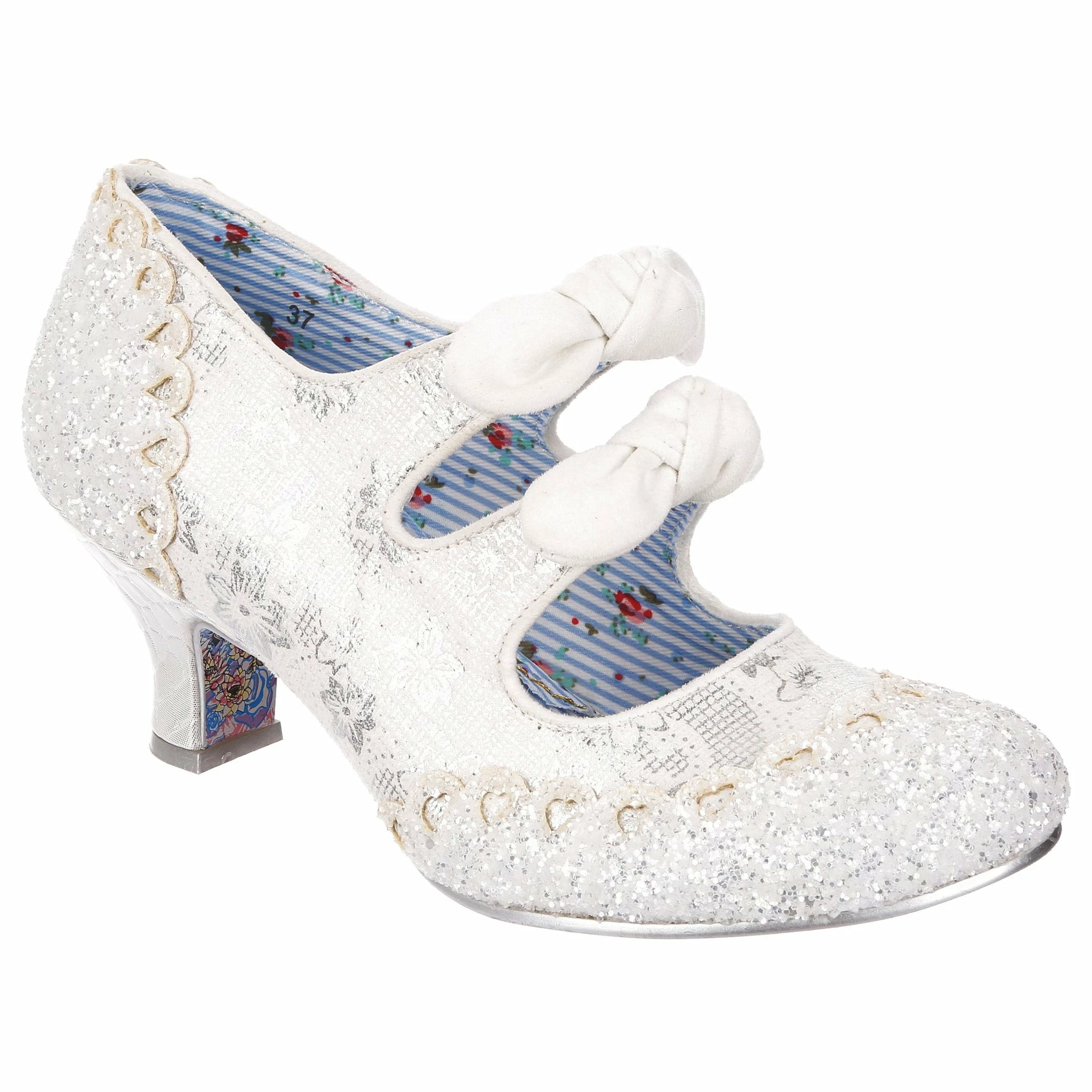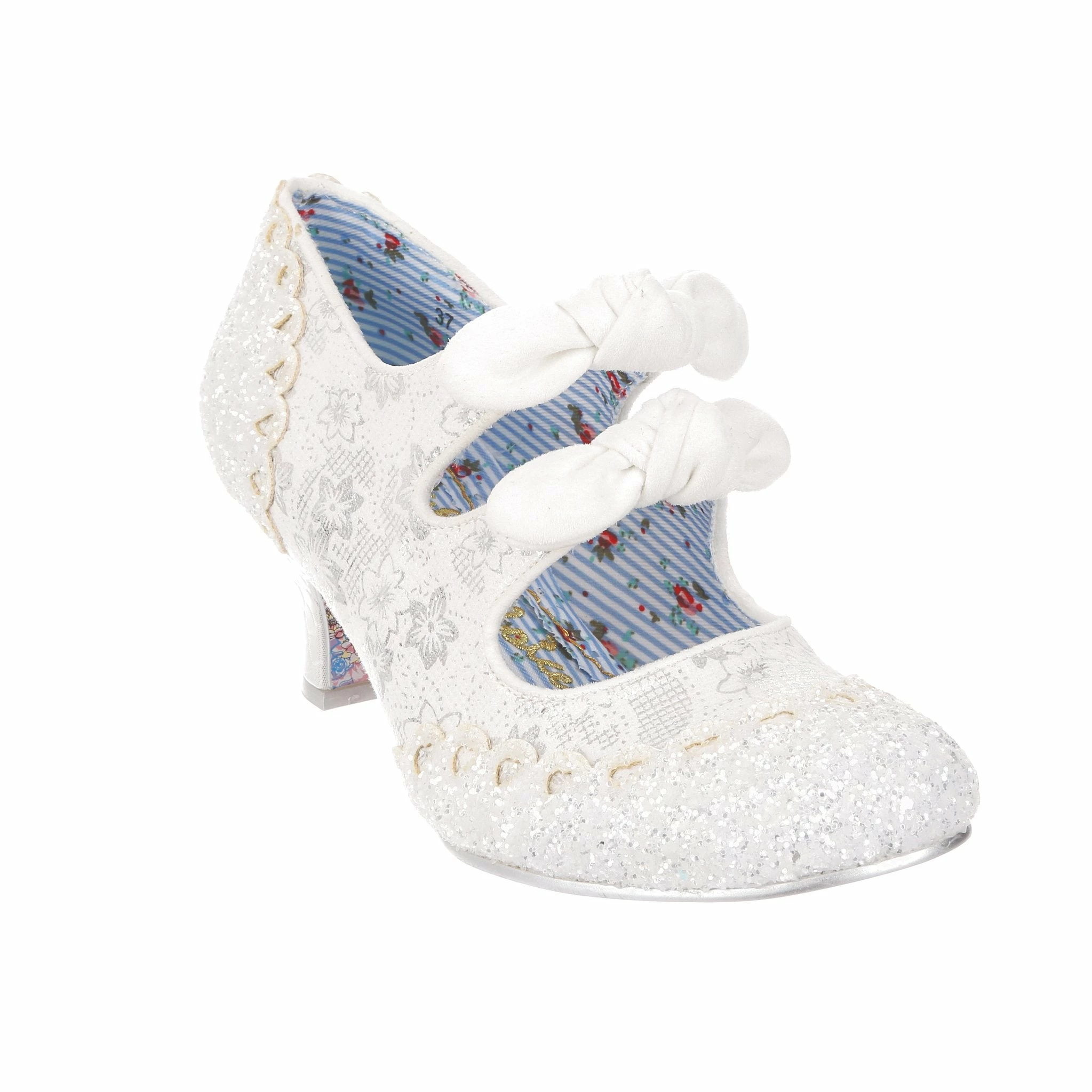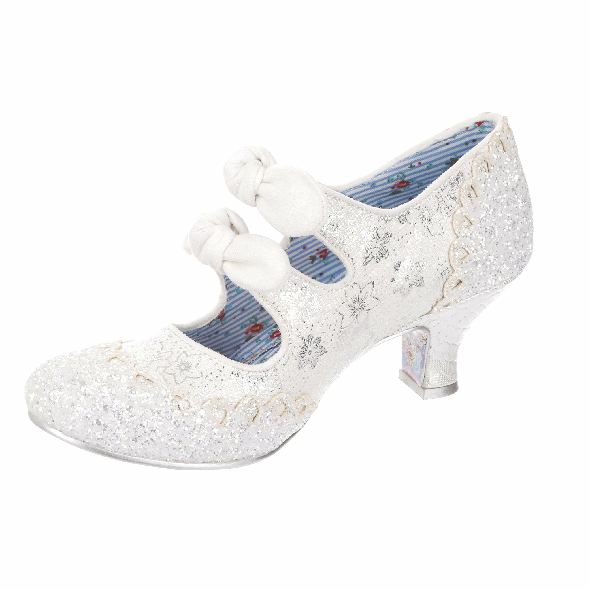Aren’t these wedding shoe heaven?! Sparkle and shine with our iconic Calendulas that have been reimagined for your bridal dreams! With a subtle white and silver floral and stunning white glitter toe, with antiqued cut out hearts for added romance! Finished with twin bows on the straps that hides elastic sides to make it easy to slip these beauties on. Choose these as your happily ever after!