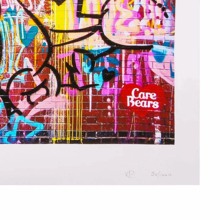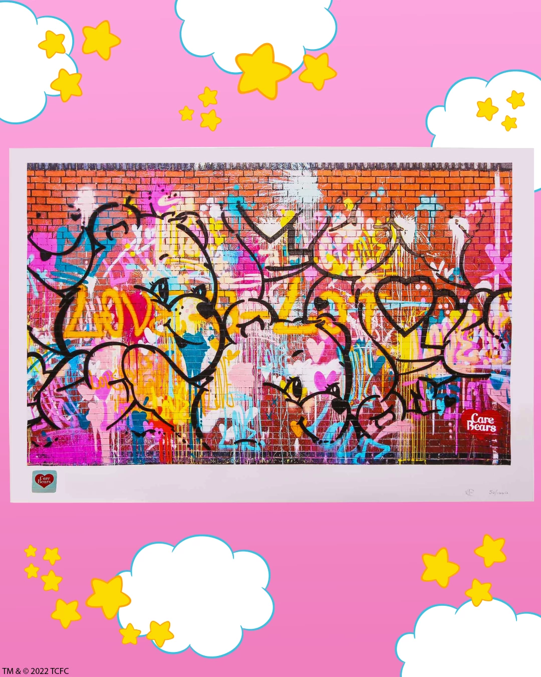 Grab a piece of Care Bears artwork for your home! Street art professionals MurWalls have created this stunning print with a limited edition of 1000 pieces, from this run we have prints numbered 1-100, each print is numbered, embossed with MurWalls logo, and has the official Care Bears hologram. Giclée Fine Art prints onto 285g Platinum Etching stock, hand rolled in a postal tube for delivery.
