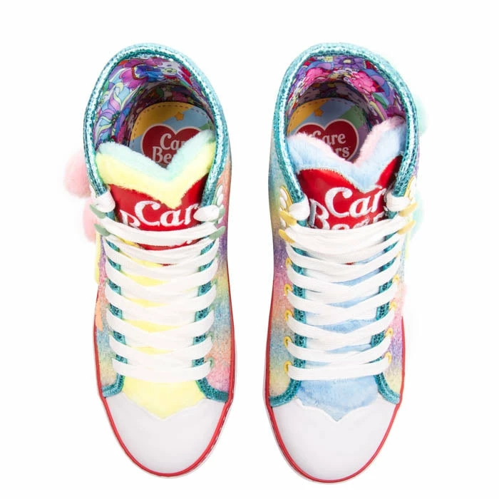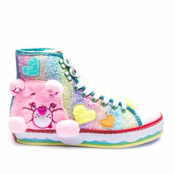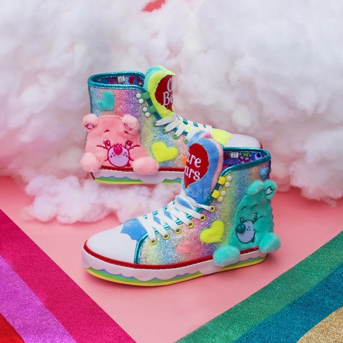 Keep calm and shine on in a pair of these cute and adorable trainers! An appliqué Cheer Bear and Wish Bear made from the softest faux fur sit atop a glittering pastel rainbow upper. The soft padded tongue is made from colourful faux fur and features the Care Bear logo on the top.
