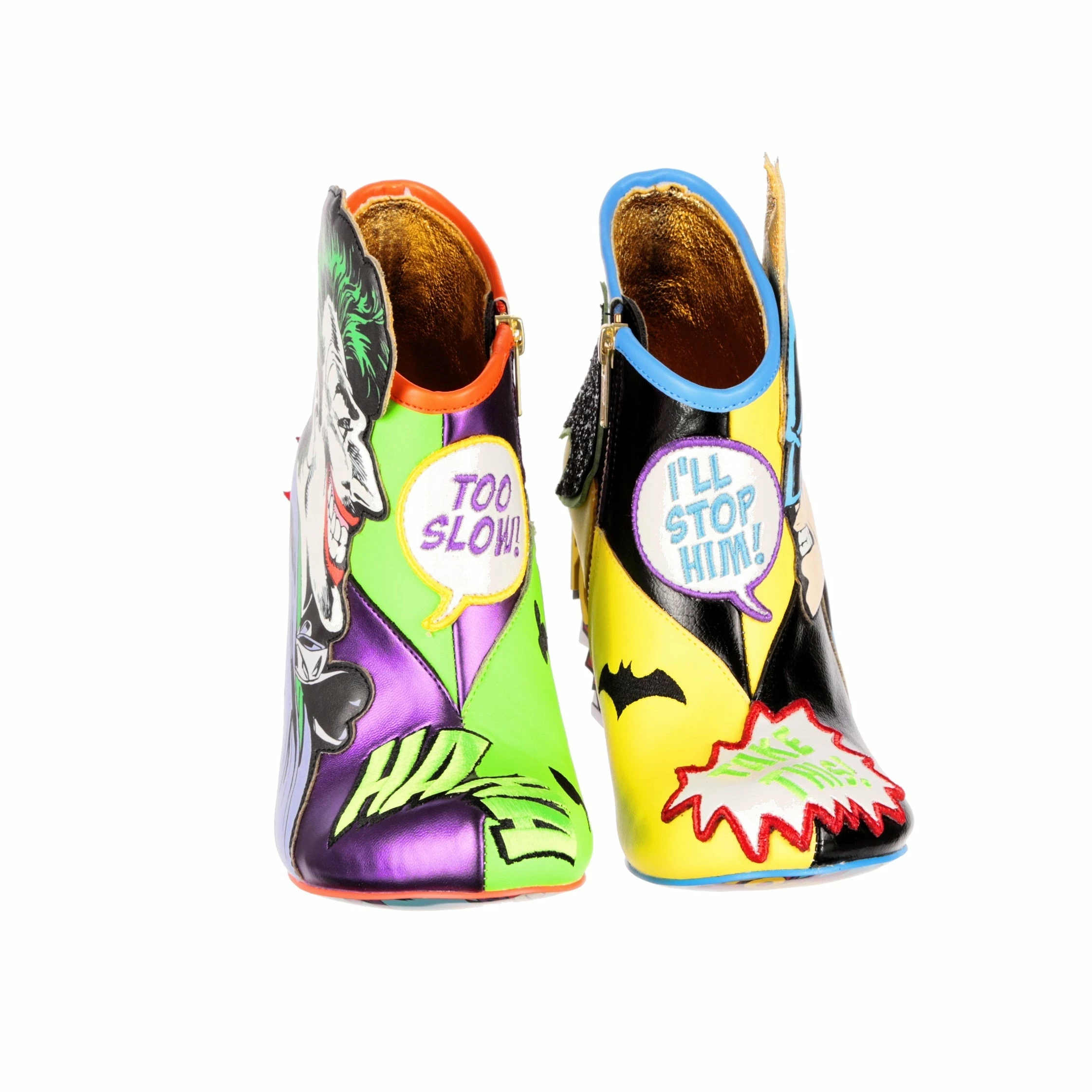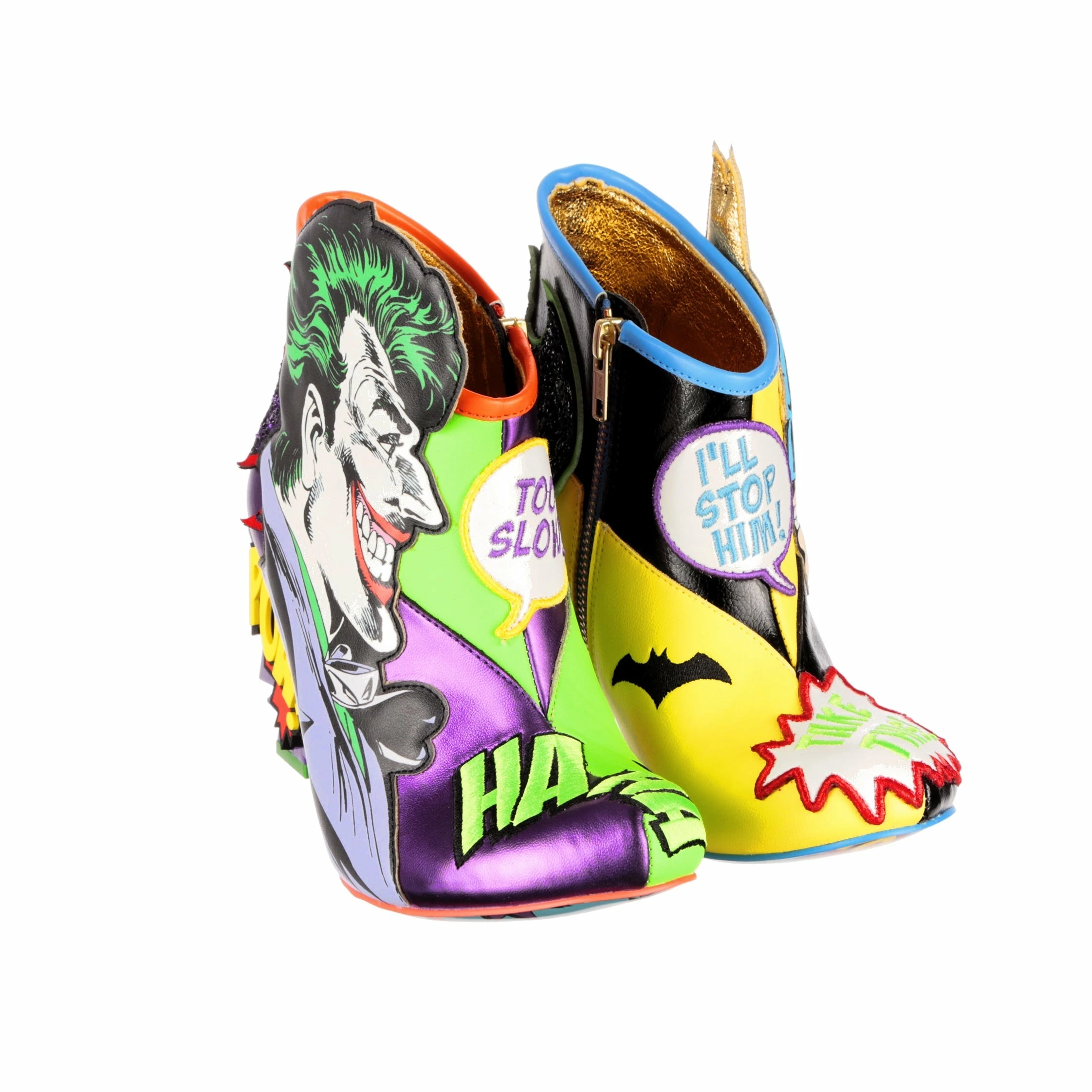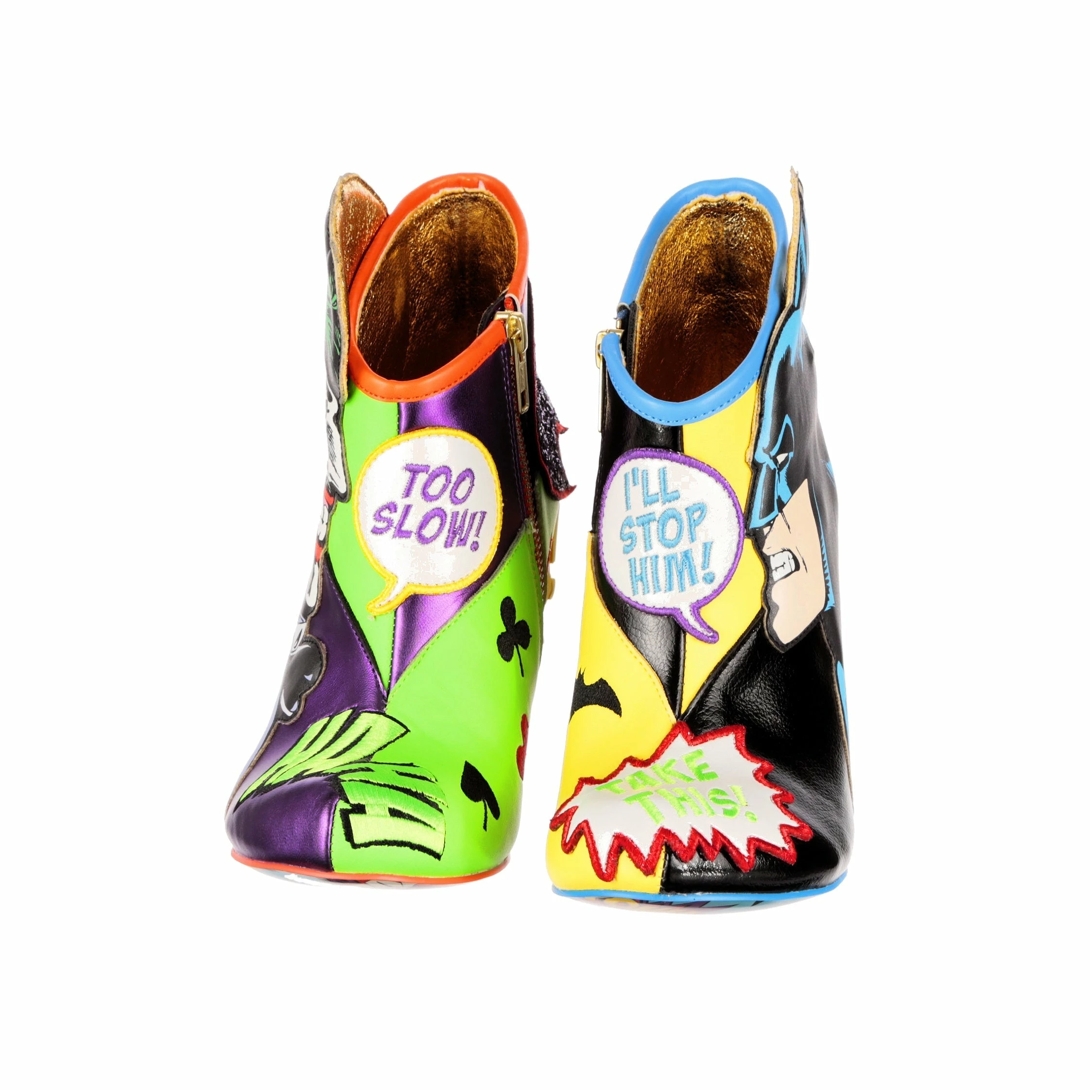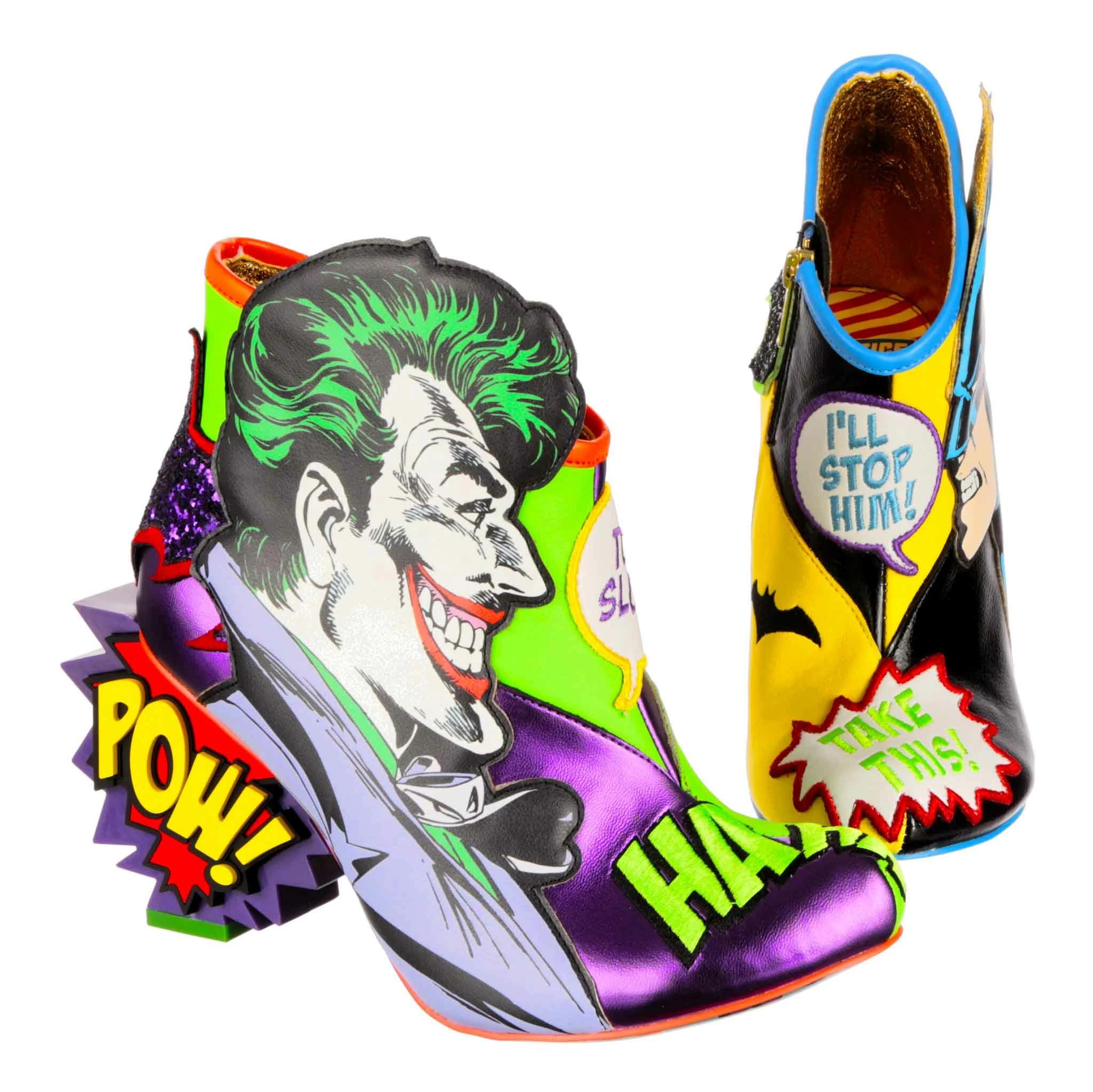 These mismatched high heel boots feature everyone’s favourite arch enemies, Batman and The Joker! Each foot is dedicated to one character, with graphic appliques of Batman and The Joker and their opposing colours, sat atop comic book style BAM! POW! concept heels. These beautiful zip up boots are a must for any fan of Batman and The Joker!