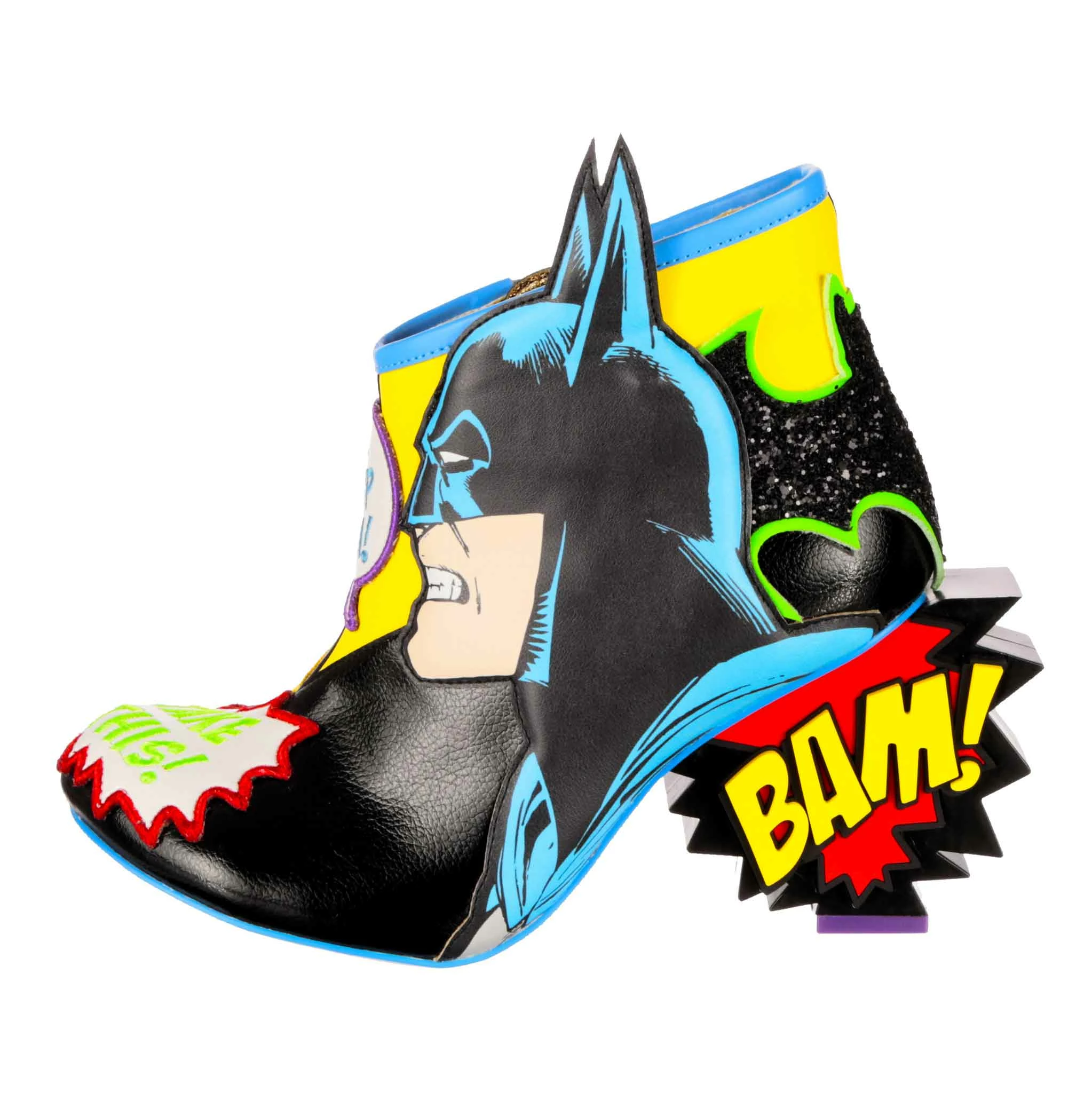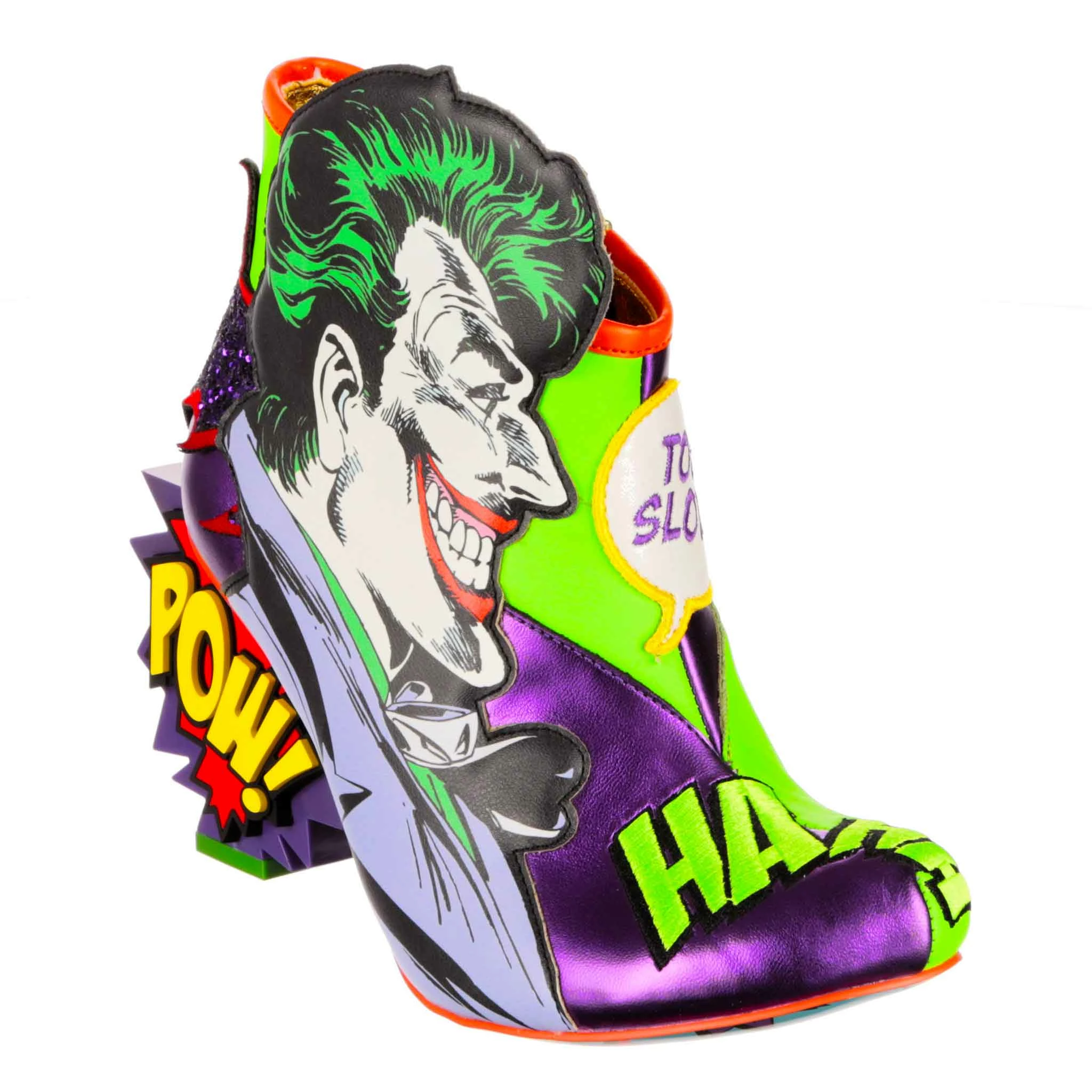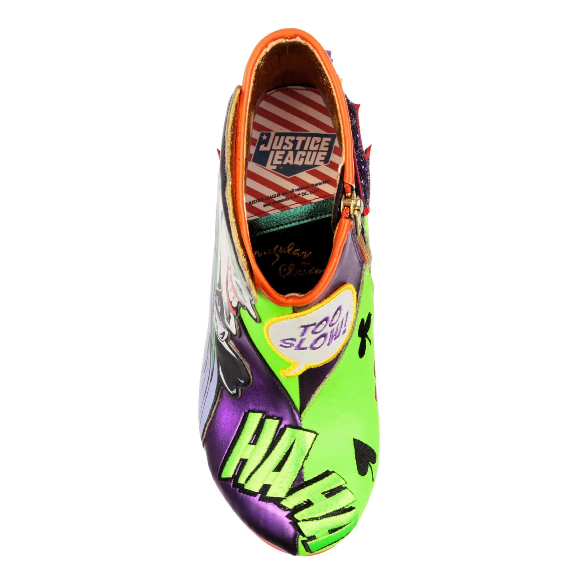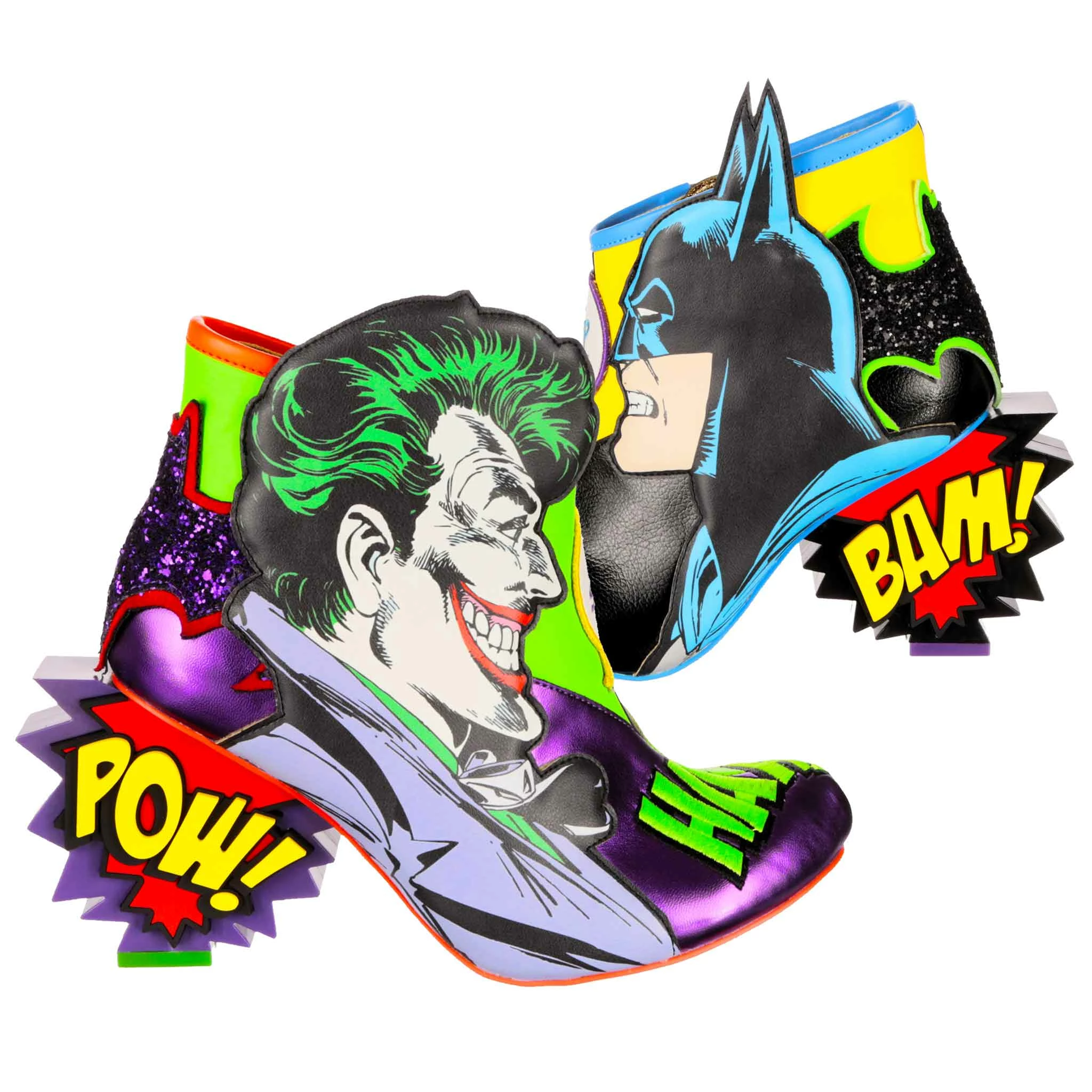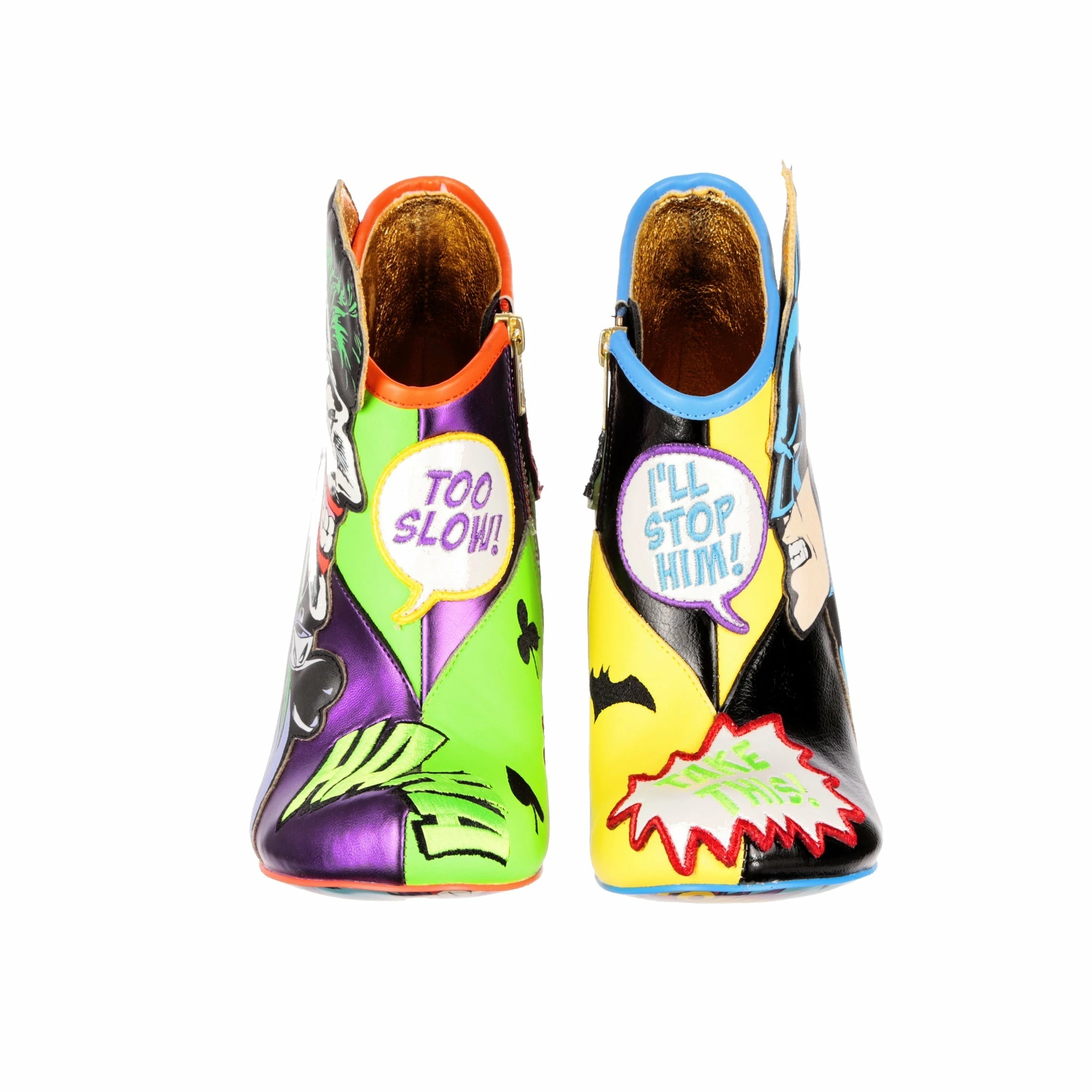 These mismatched high heel boots feature everyone’s favourite arch enemies, Batman and The Joker! Each foot is dedicated to one character, with graphic appliques of Batman and The Joker and their opposing colours, sat atop comic book style BAM! POW! concept heels. These beautiful zip up boots are a must for any fan of Batman and The Joker!