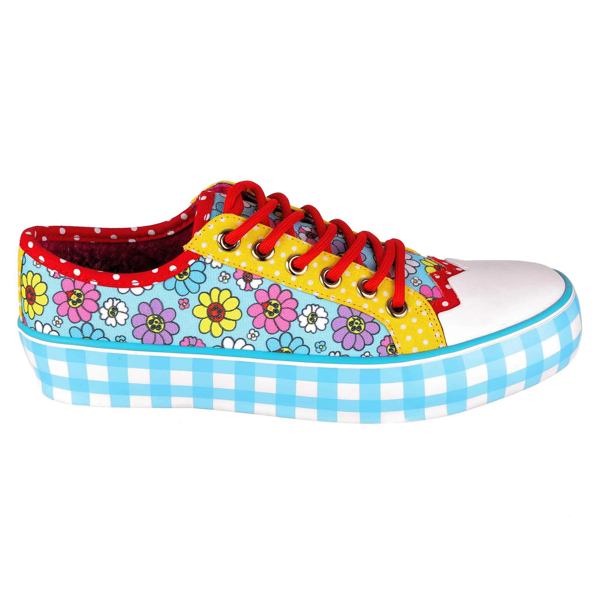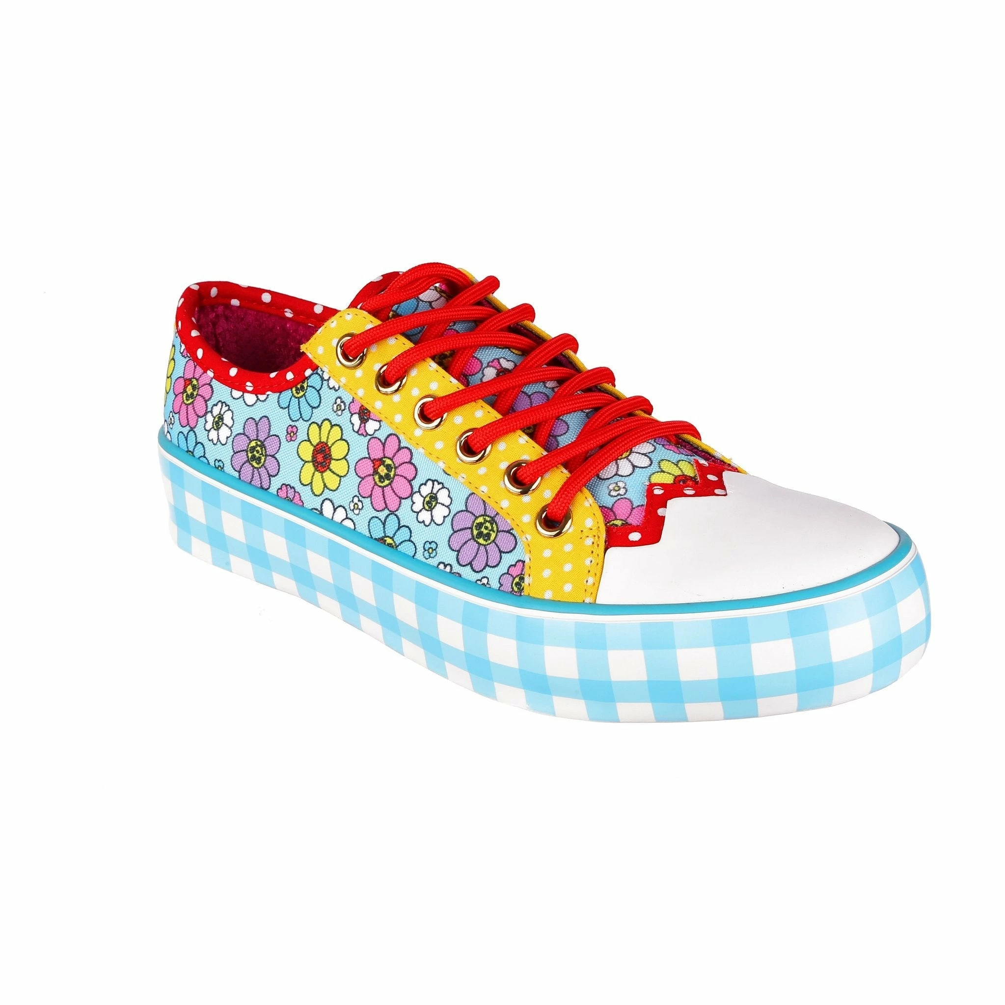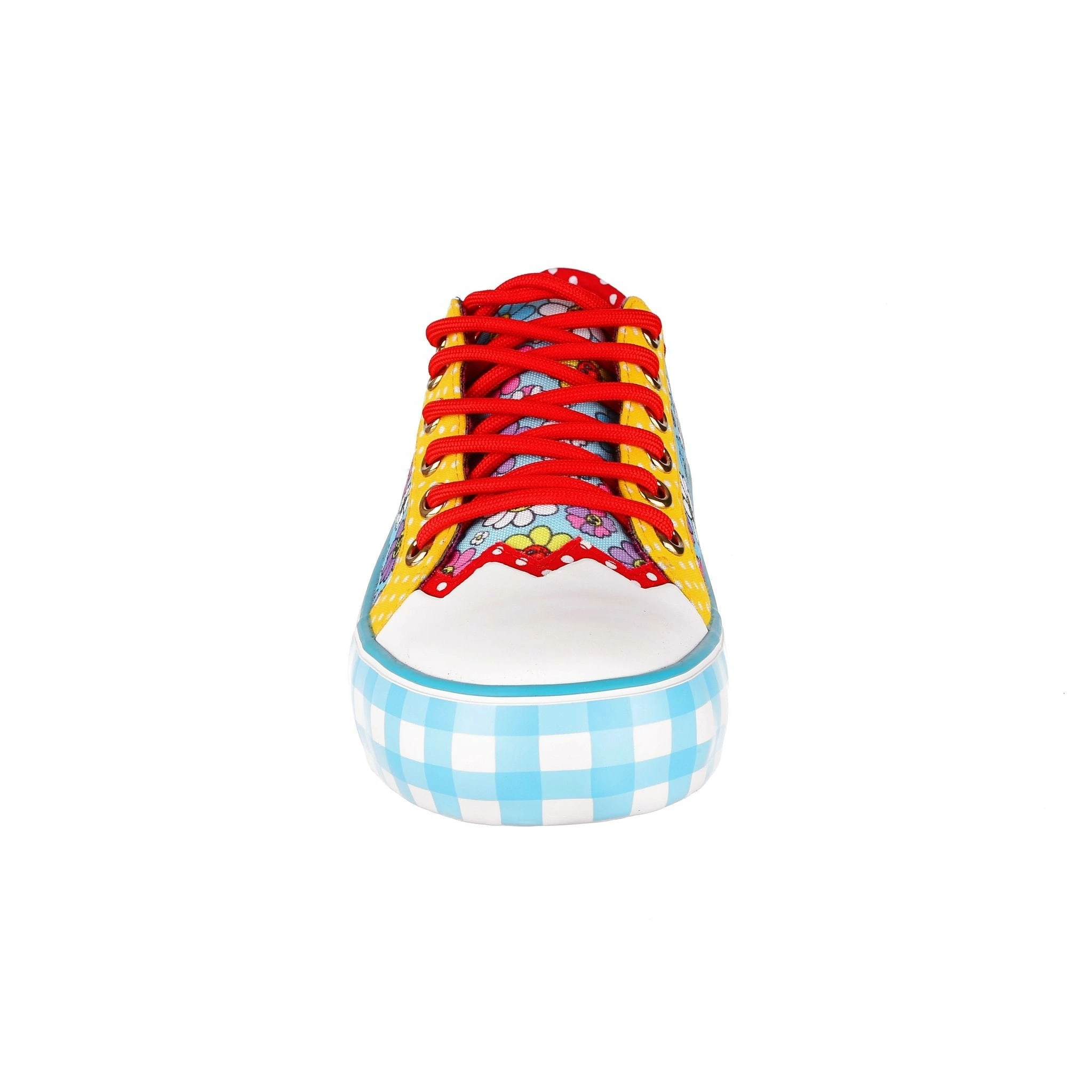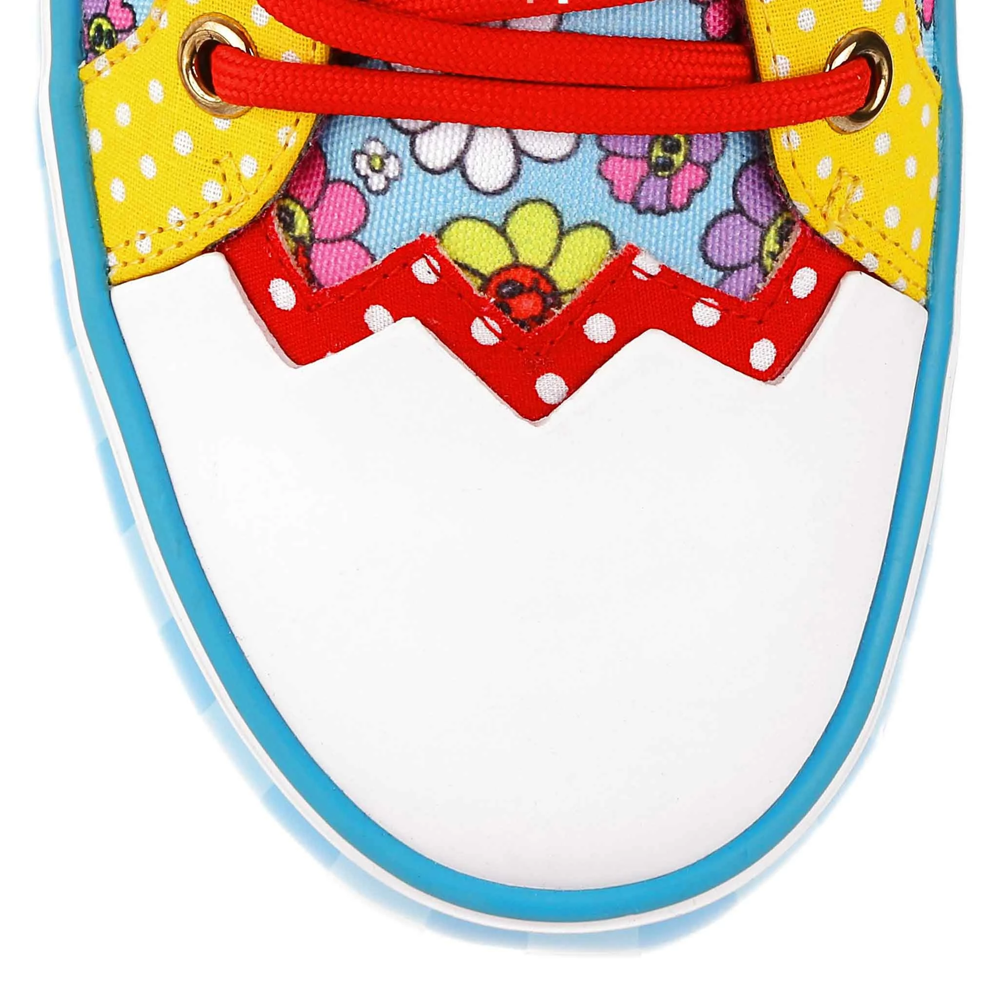 Say daisy do to these bold lace-ups! Cover yourself in flowers with these blue low-top trainers printed with seemingly sweet colourful daisies, but if you look a bit closer you’ll see they have three eyes and fangs!! With red and yellow polka dot piping, chevron edging and red laces, and finished with blue gingham vulcanised rubber sole. Be careful with these evil cuties!