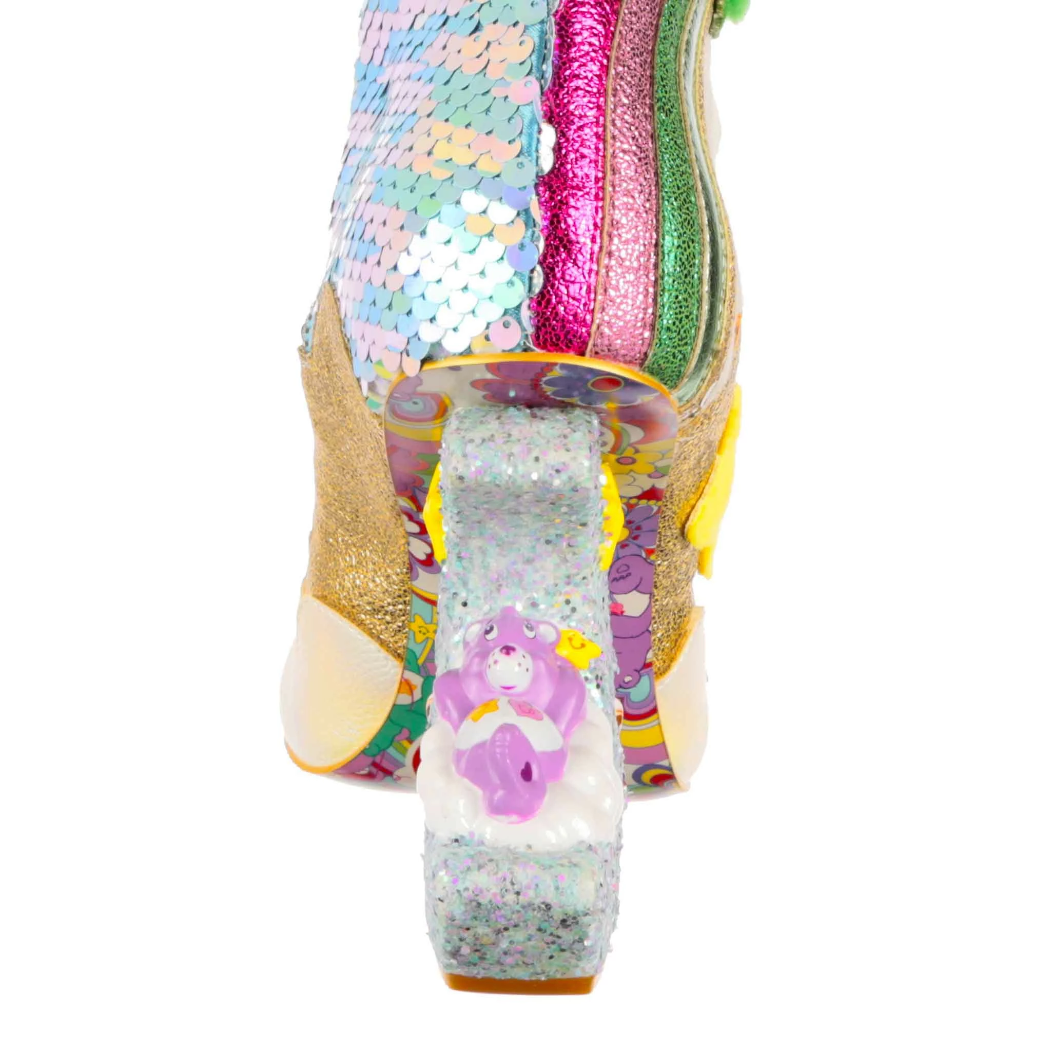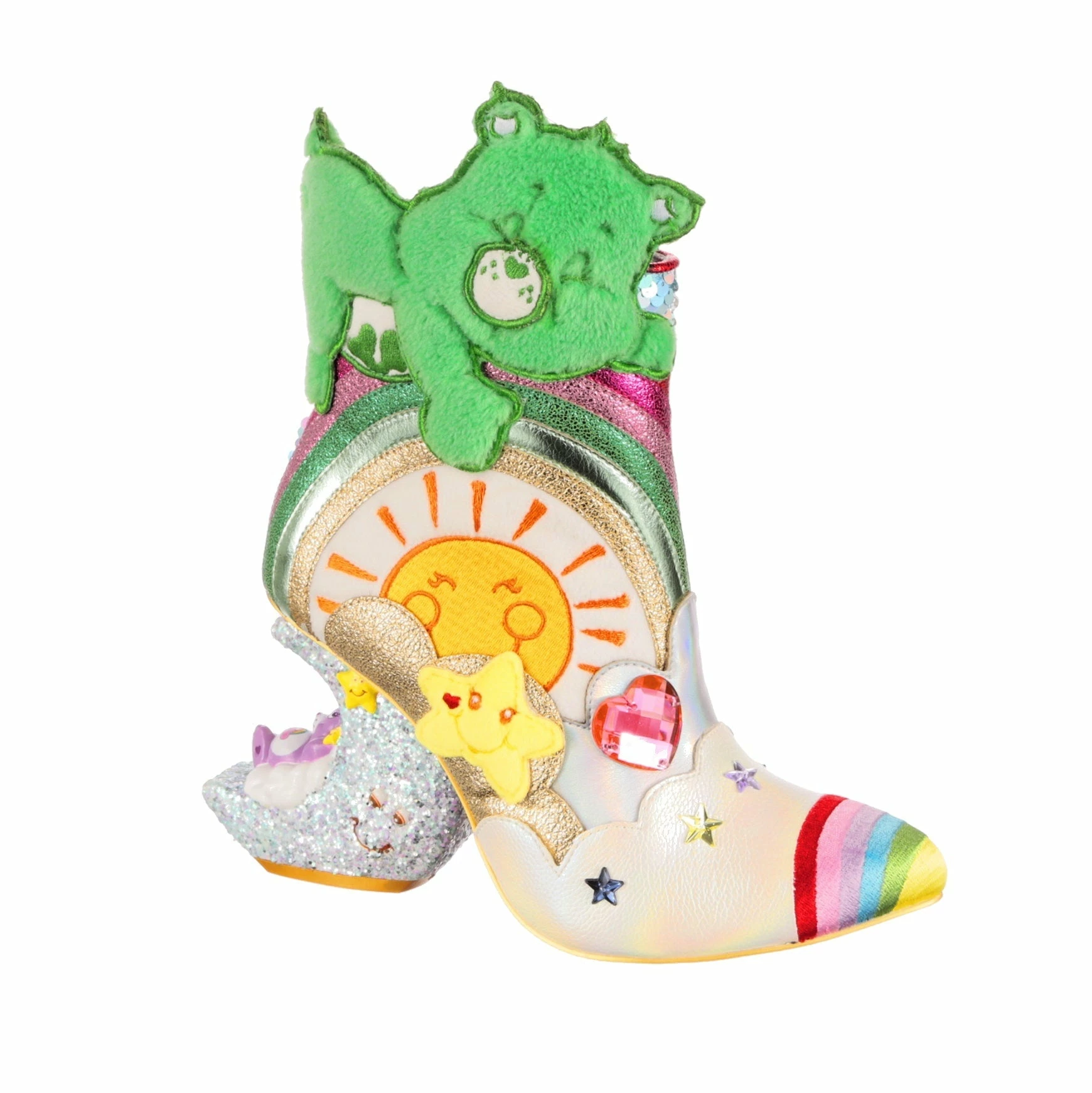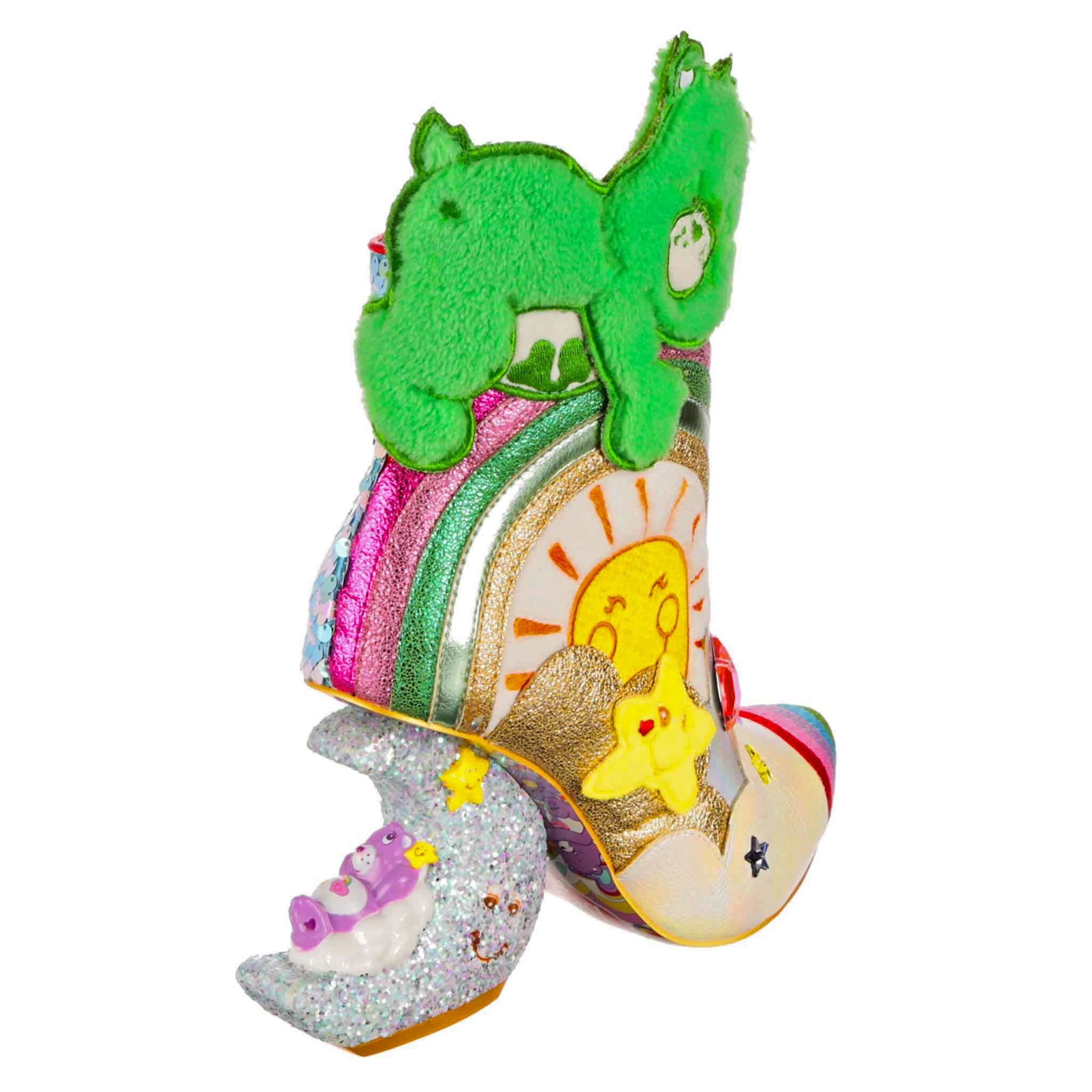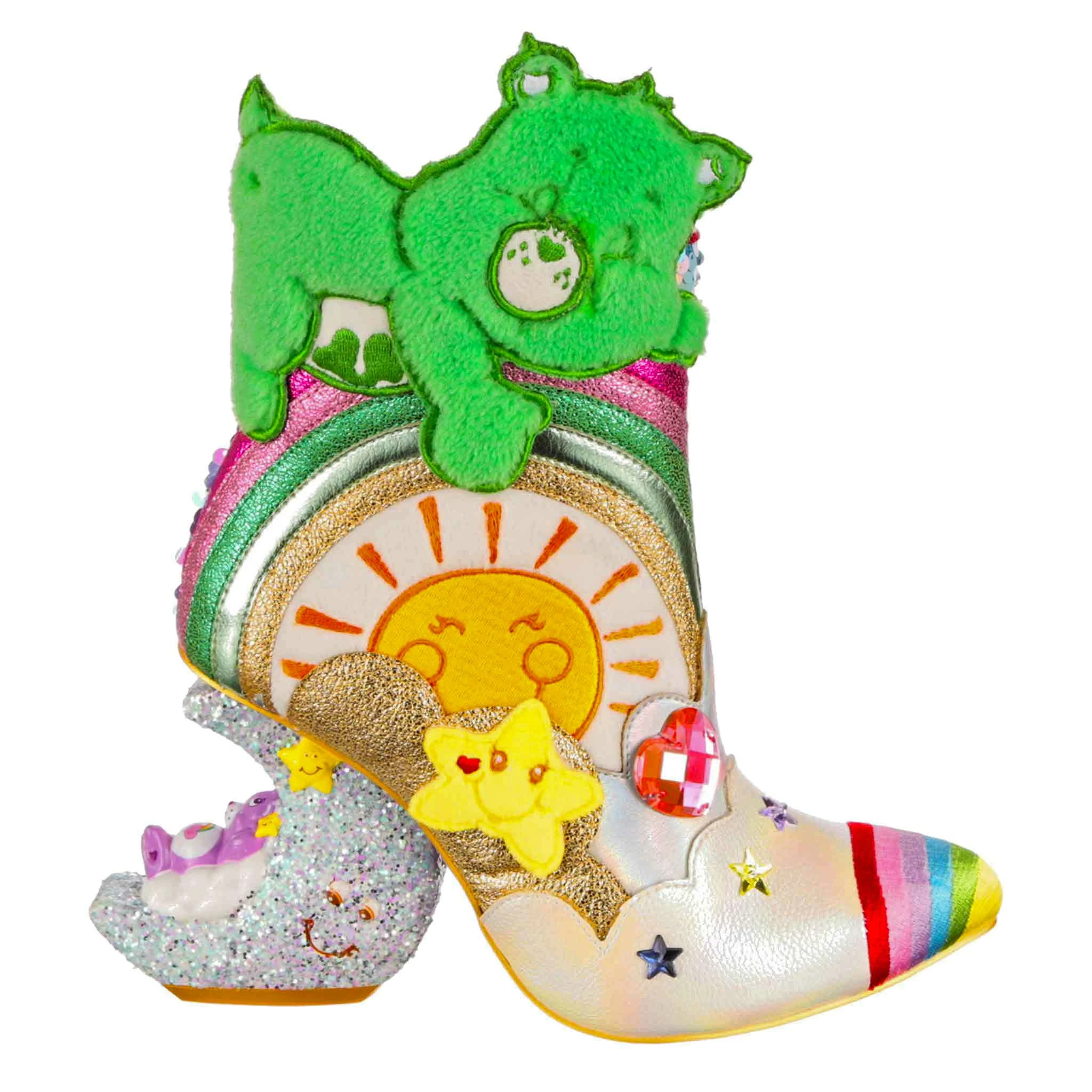 Keep calm and snooze on in a pair of these dreamy Care Bear boots! Featuring a very sleepy Good Luck Bear snoozing on top of a glitter rainbow. A happy embroidered sun, metallic clouds, sequins and 3D star-shaped creatures sit atop a sparkling crescent moon shaped concept heel – with very sleepy Best Friend Bear having a nap on the moon.