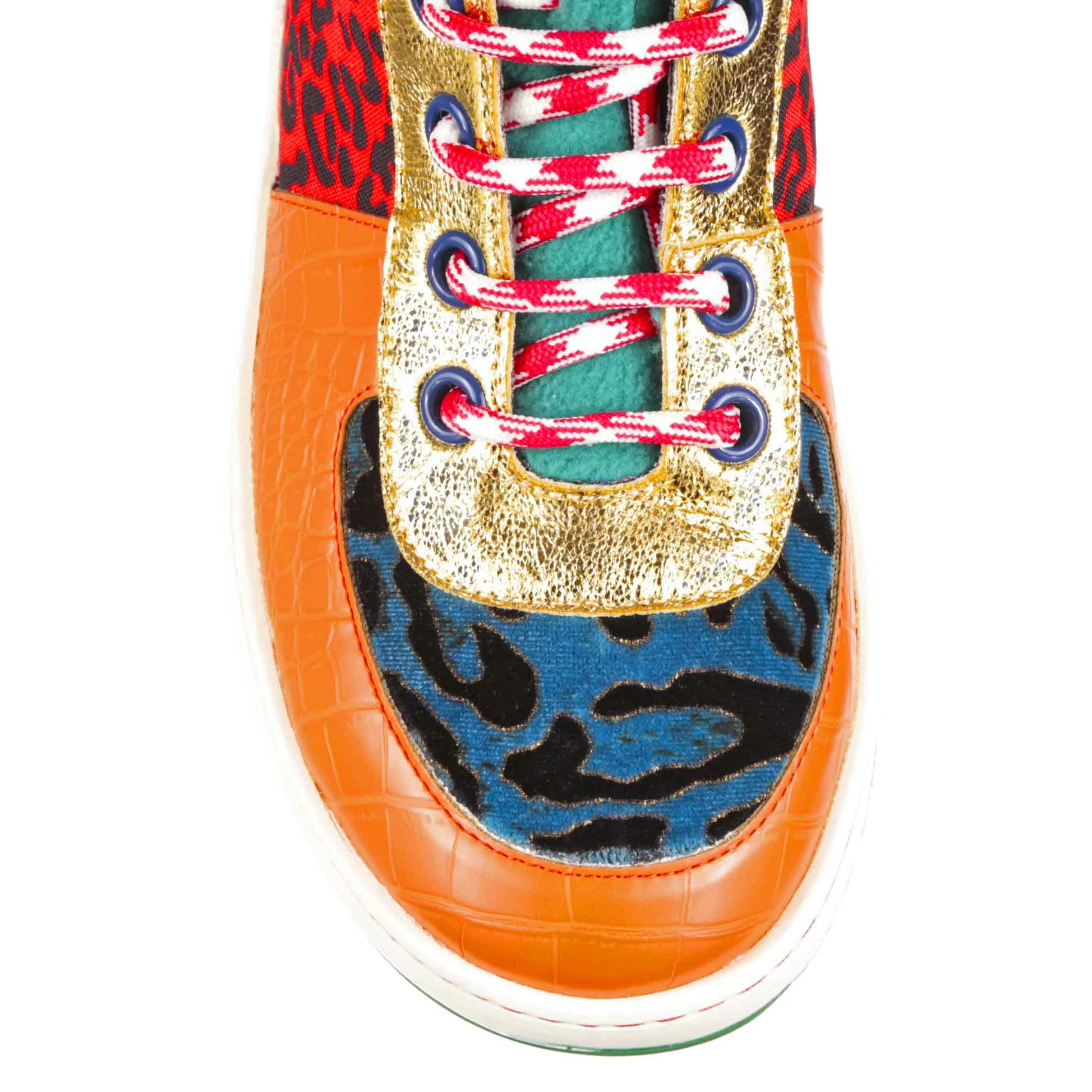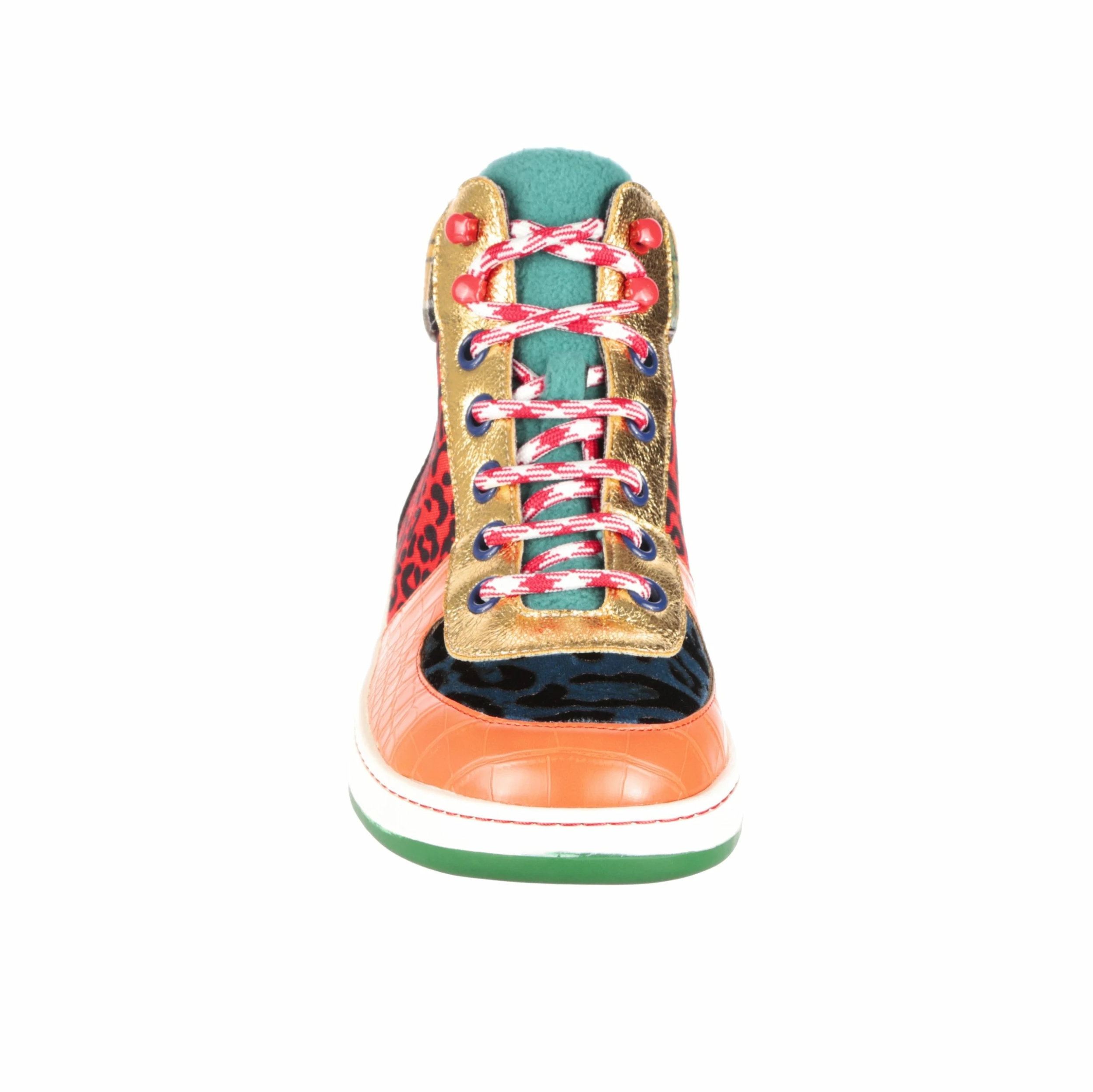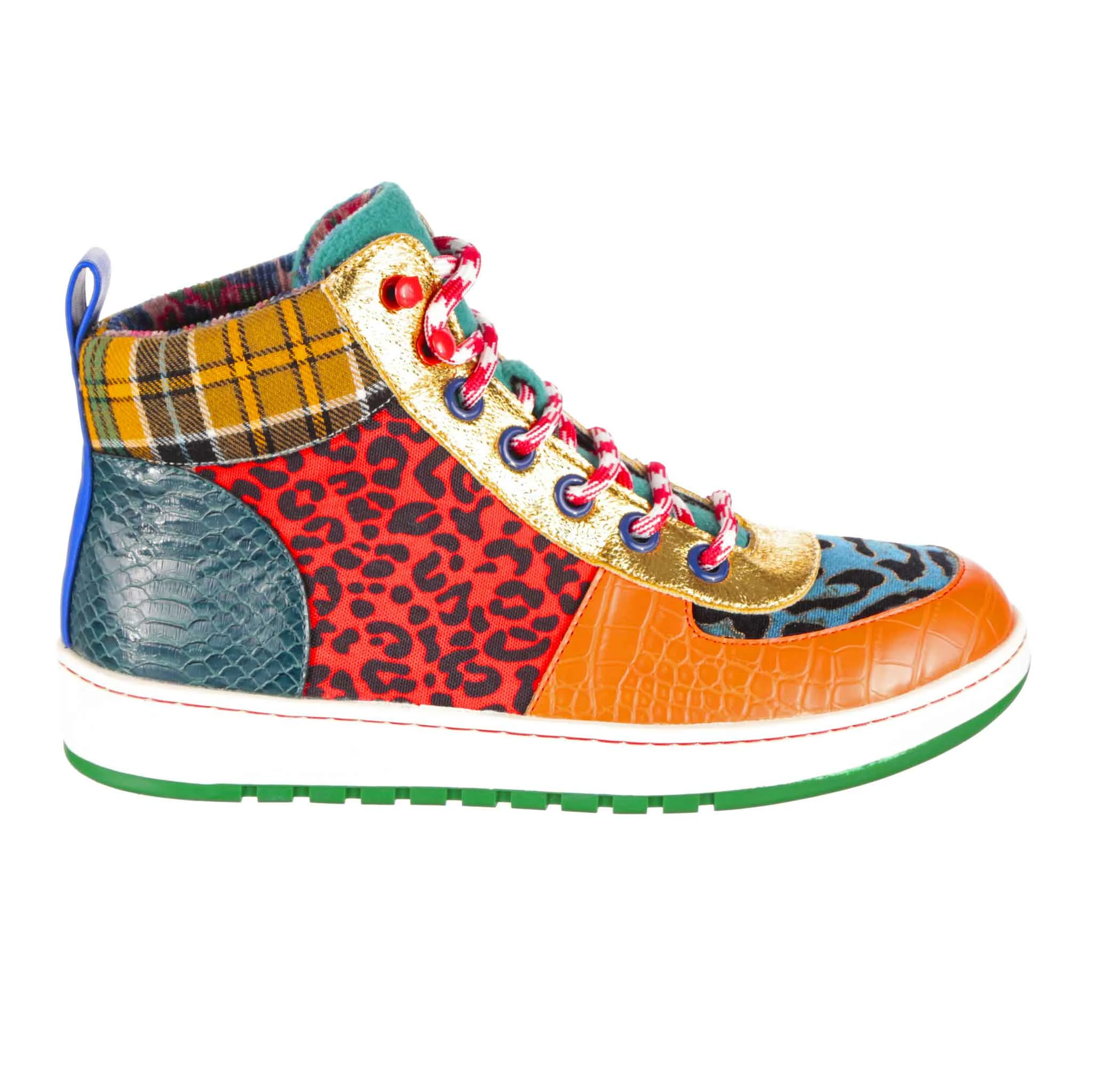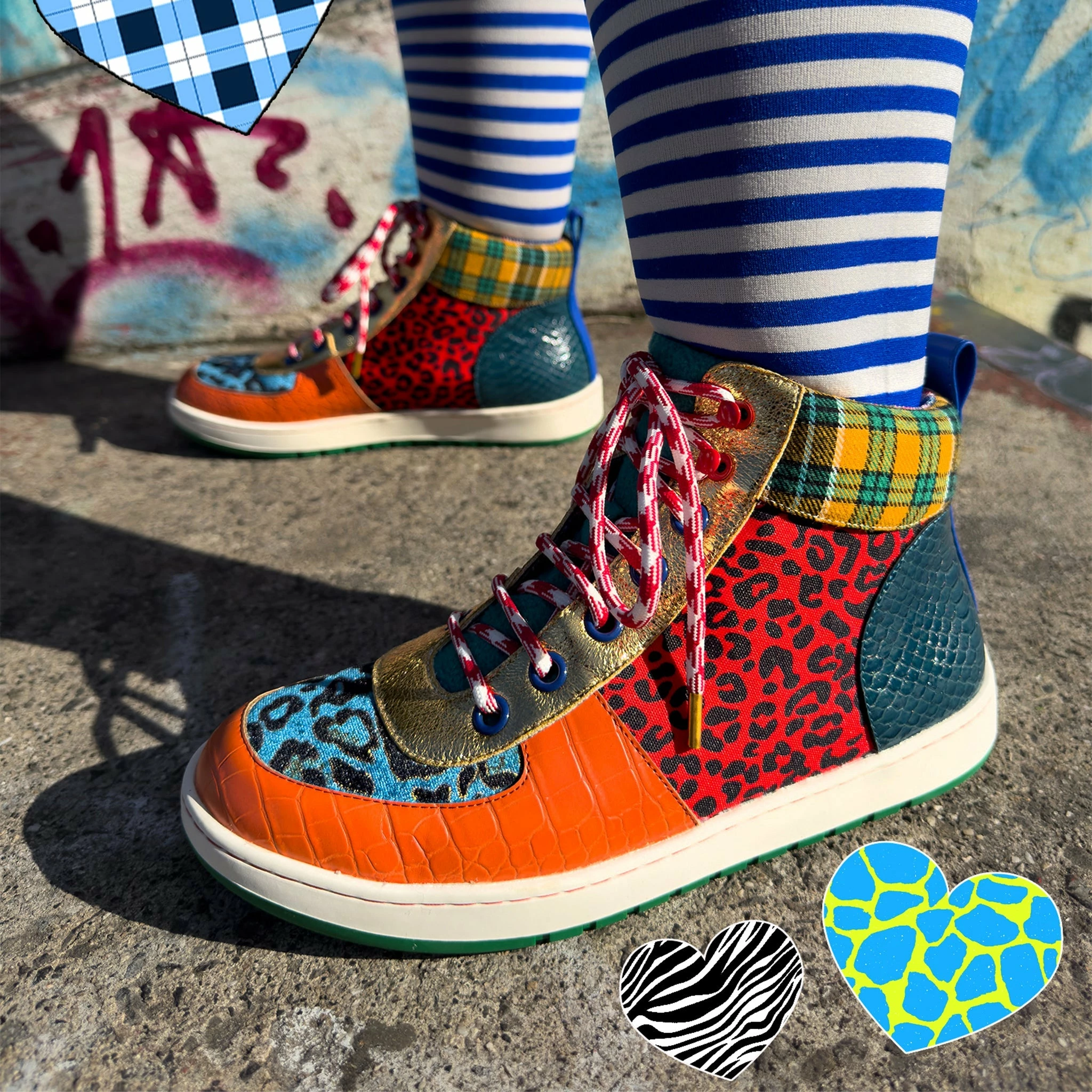These lace ups are patchwork perfection! Stand out from the crowd in these bright and colourful high top trainers, in a mix of leopard, tartan and mock reptile fabrics no one will miss you! Add to your wardrobe today!