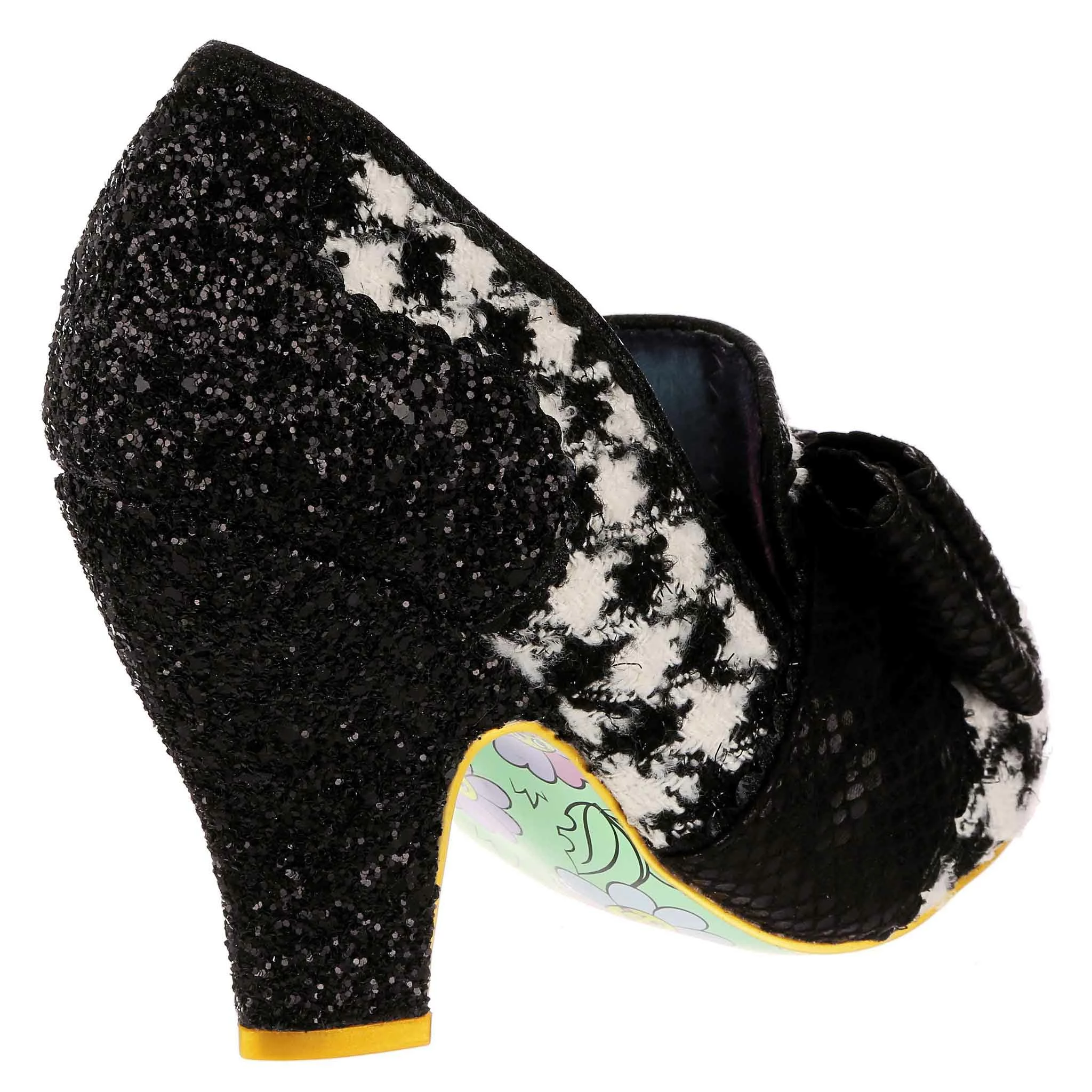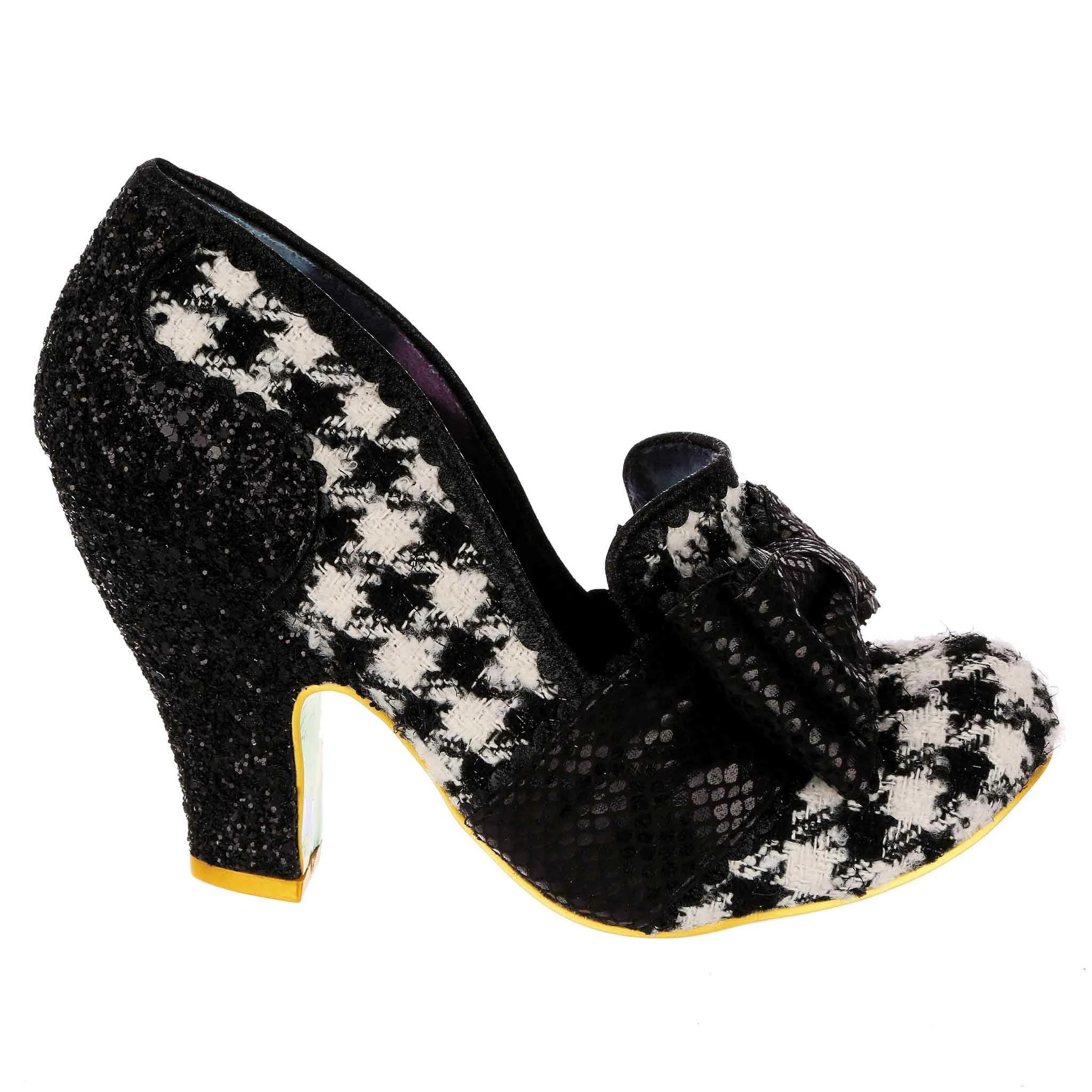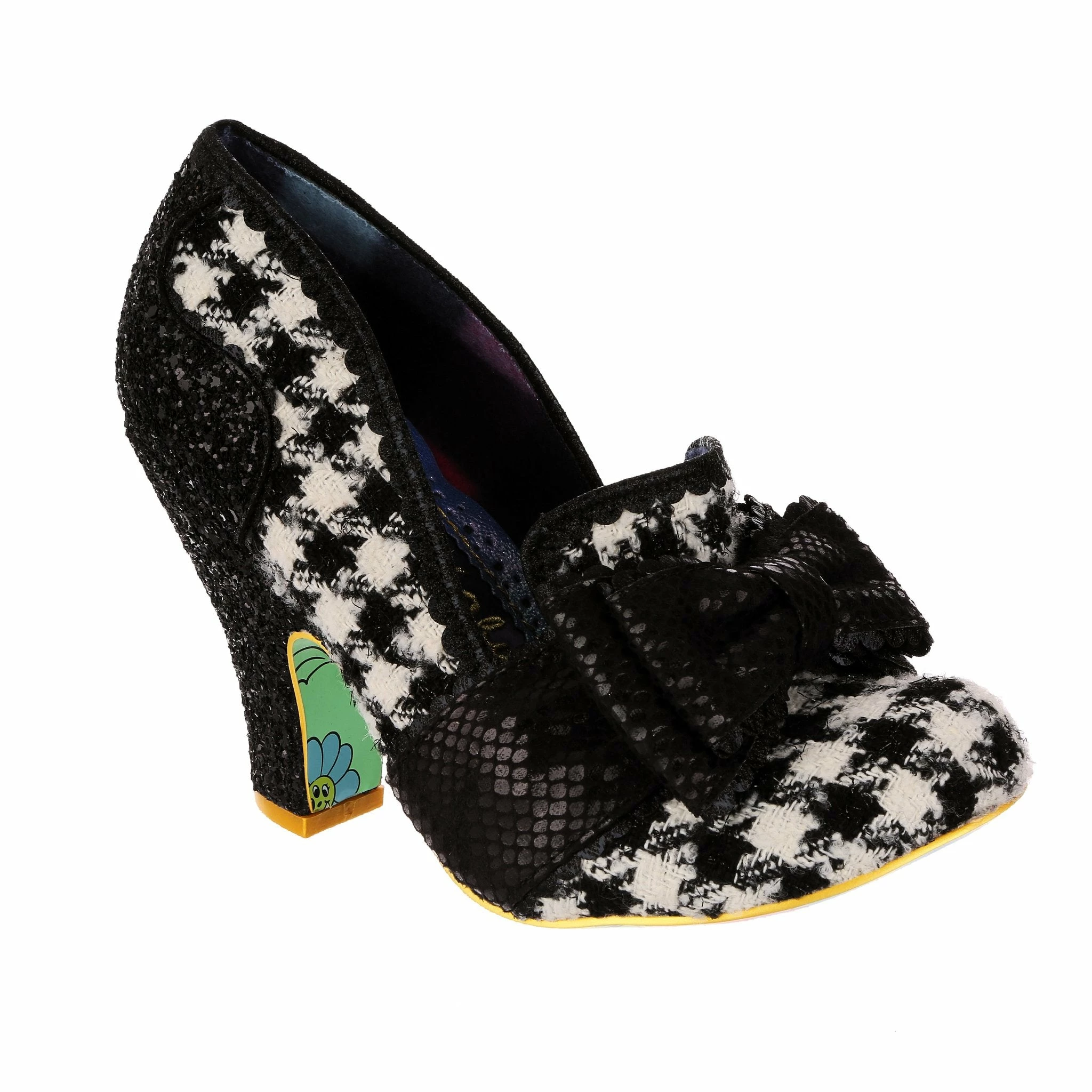 Sophisticated and stylish, these super cute pumps have your name on them! A fabulous and classy monochrome houndstooth is matched with stunning black glitter texture on the heel and sumptuous matching metallic reptile print on the statement toe bow, making these interesting, fun, but also wearable and chic!