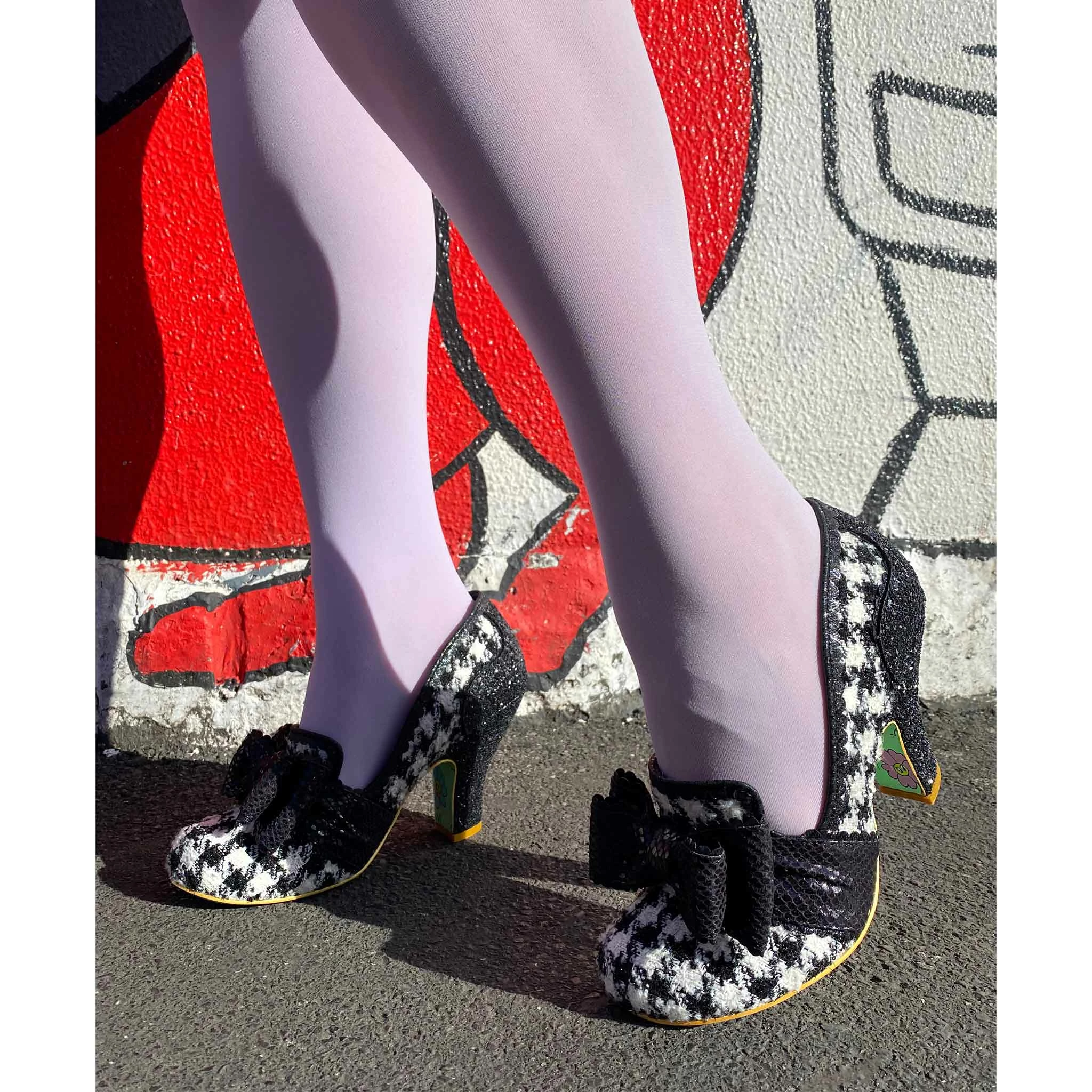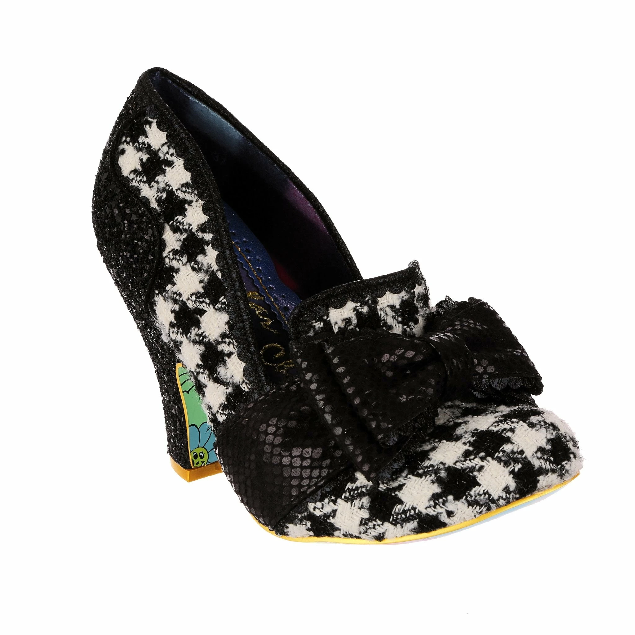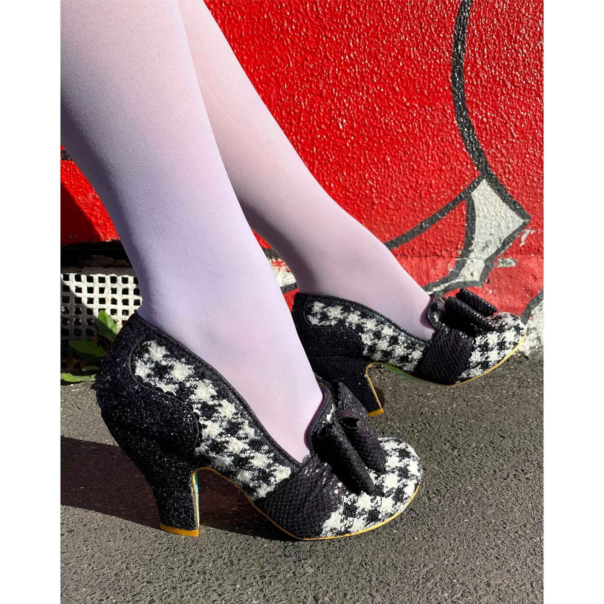 Sophisticated and stylish, these super cute pumps have your name on them! A fabulous and classy monochrome houndstooth is matched with stunning black glitter texture on the heel and sumptuous matching metallic reptile print on the statement toe bow, making these interesting, fun, but also wearable and chic!
