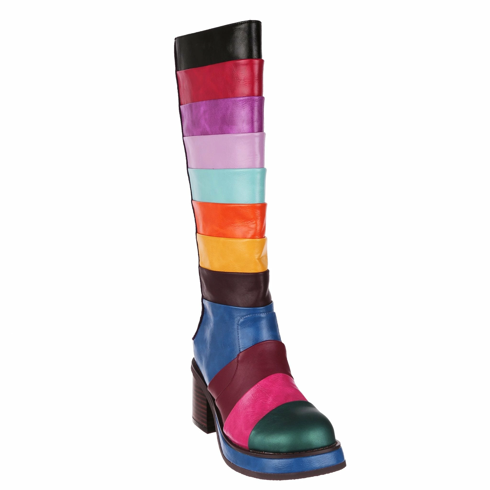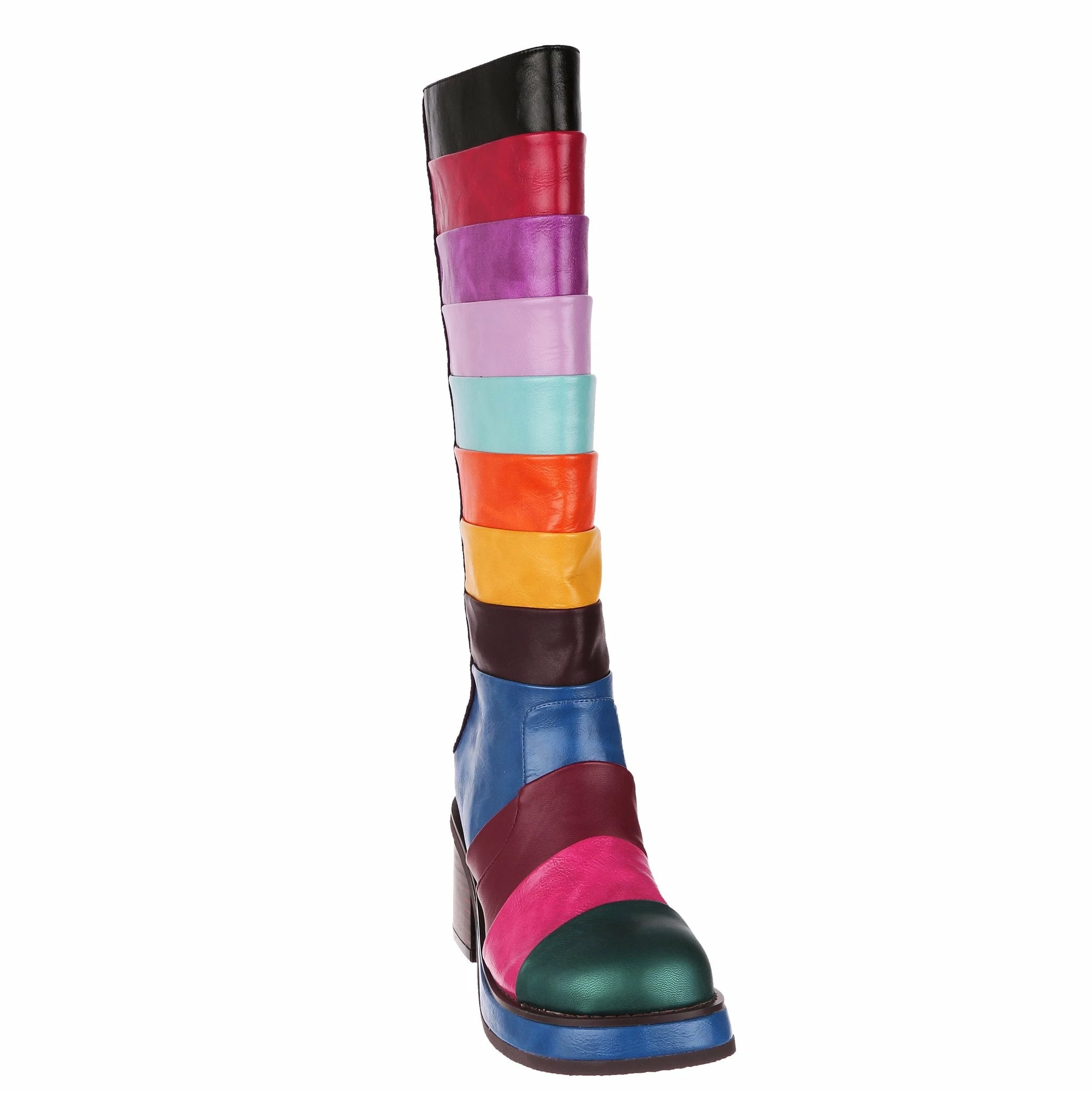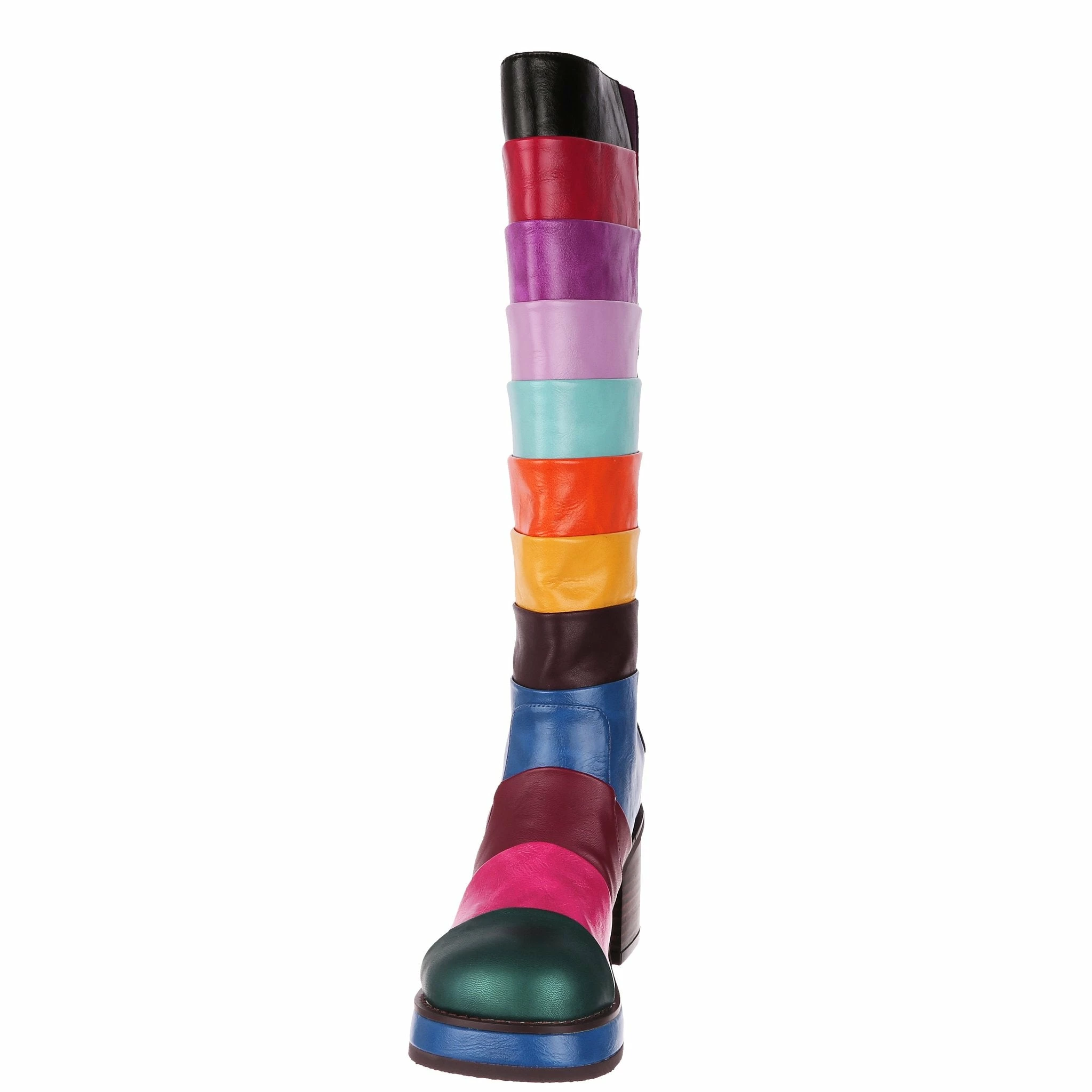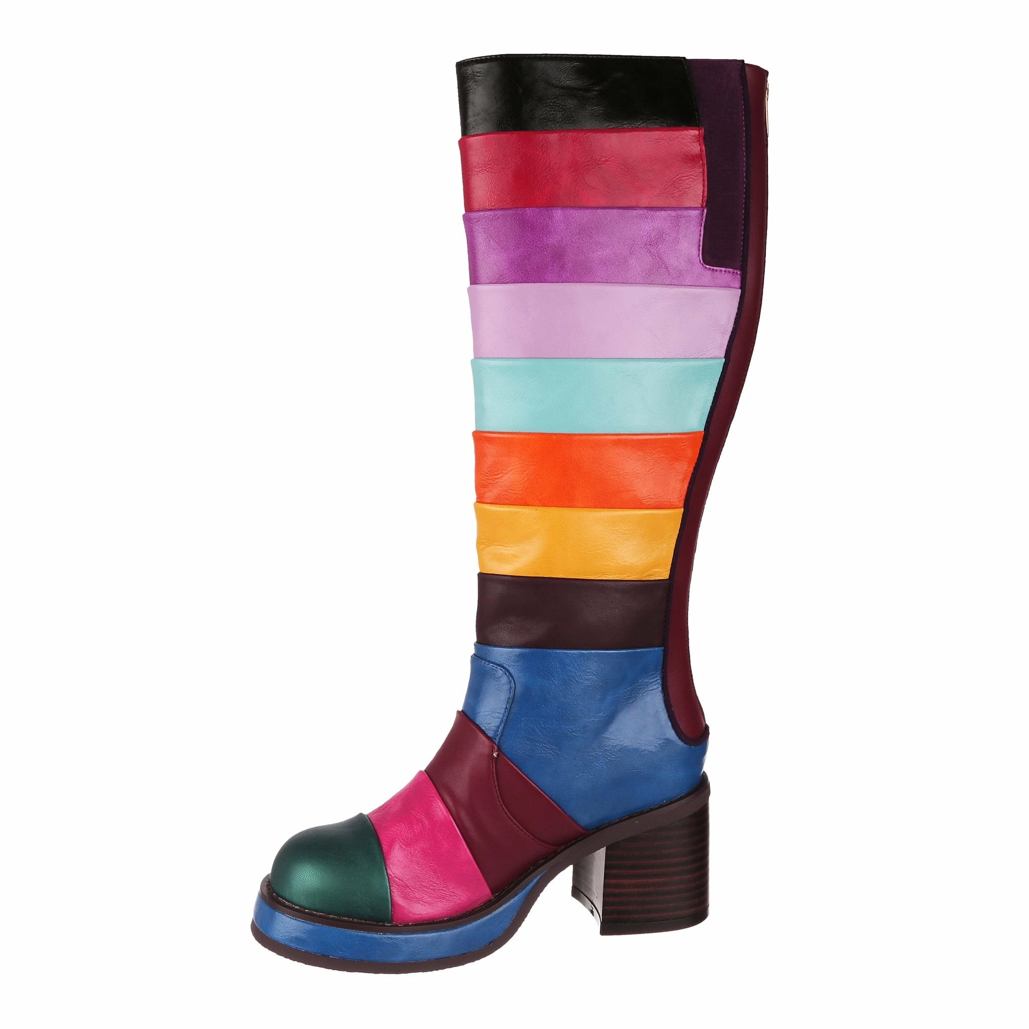 Did someone say statement boots? Get ready to zip up the most dreamy rainbow patchwork beauties you ever did see! With a chunky and wearable heel, elastic for a bit of extra give in the calf, striking squared toe and fabulous tall calf height, these boots are the perfect way to elevate any outfit!