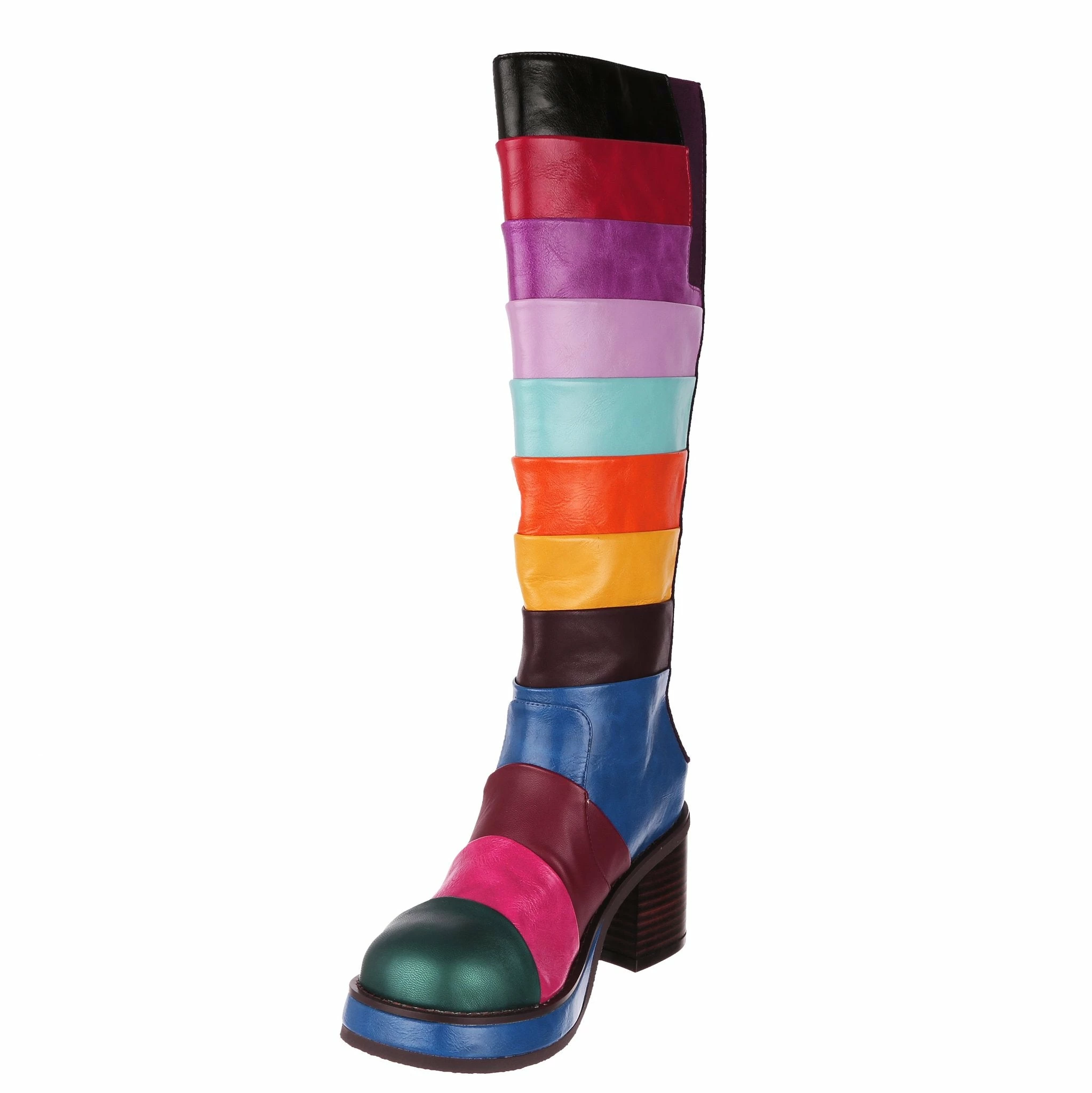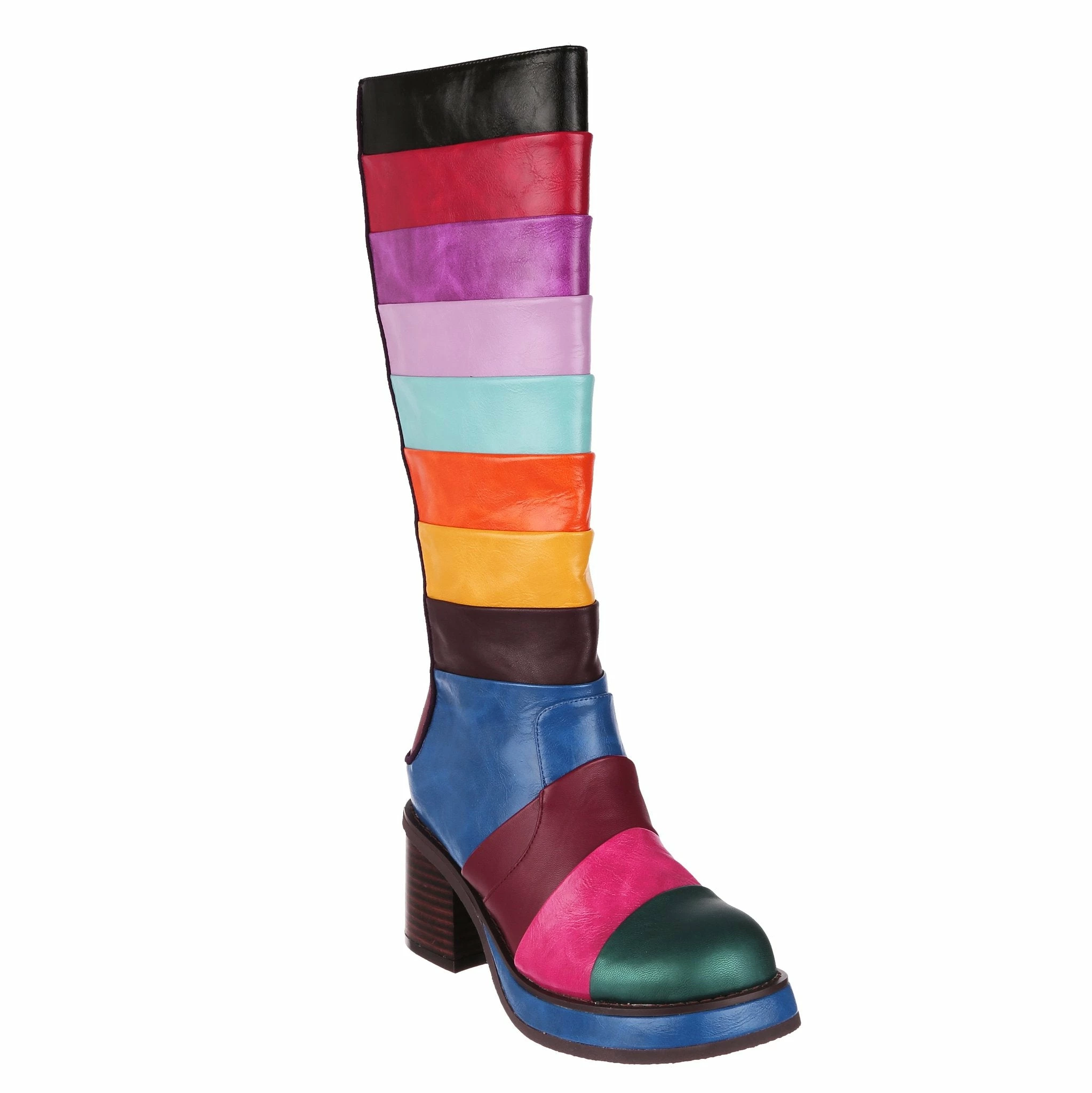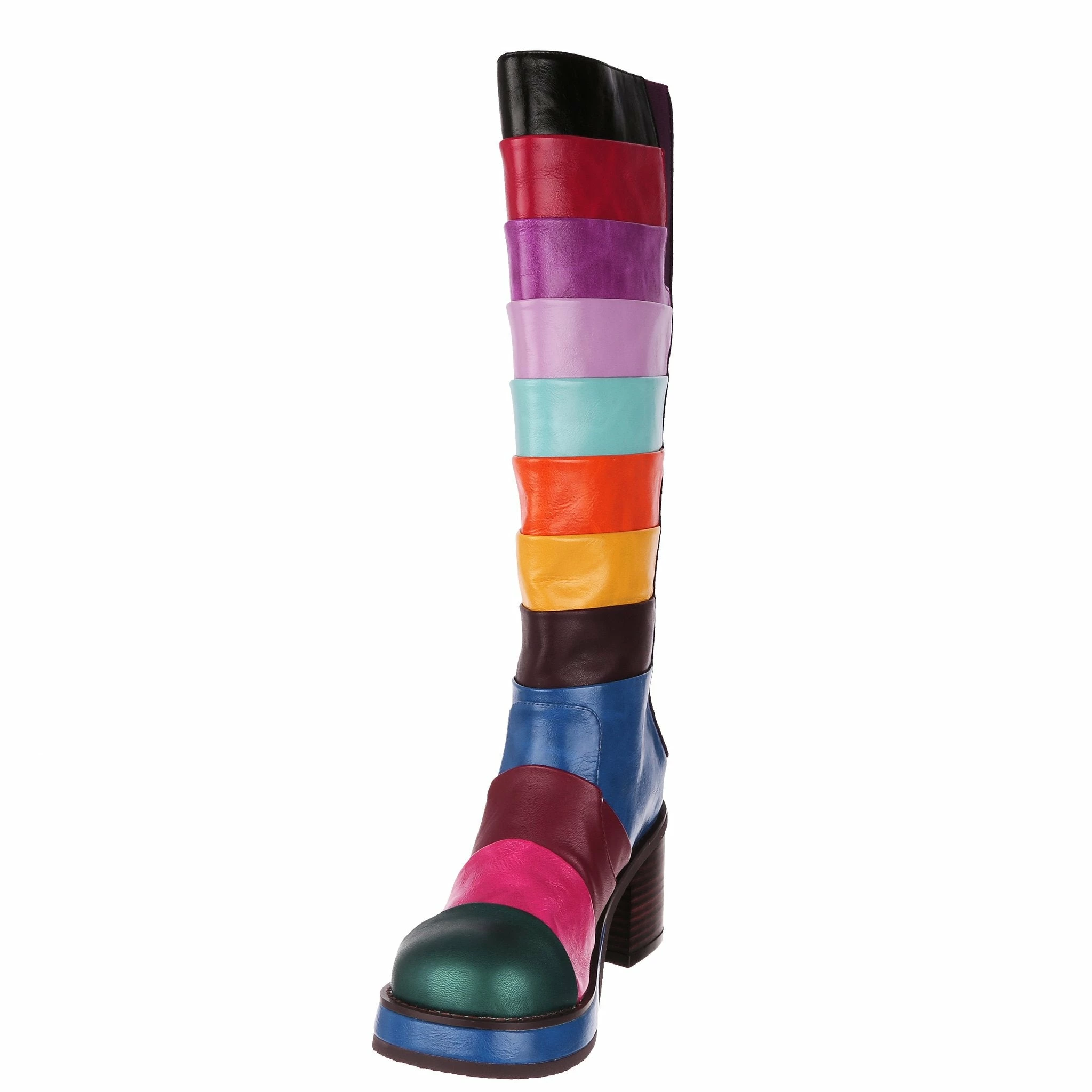 Did someone say statement boots? Get ready to zip up the most dreamy rainbow patchwork beauties you ever did see! With a chunky and wearable heel, elastic for a bit of extra give in the calf, striking squared toe and fabulous tall calf height, these boots are the perfect way to elevate any outfit!