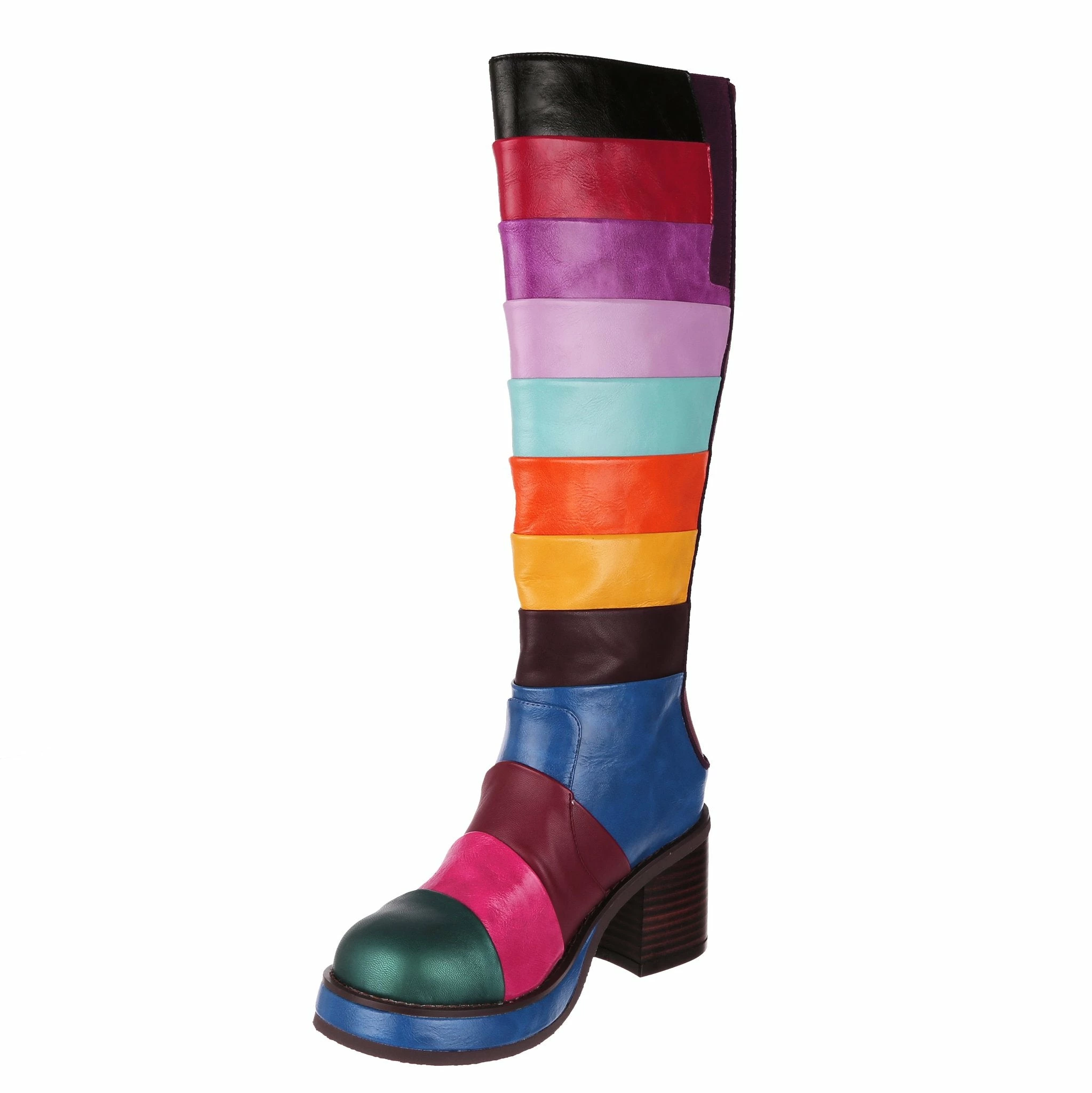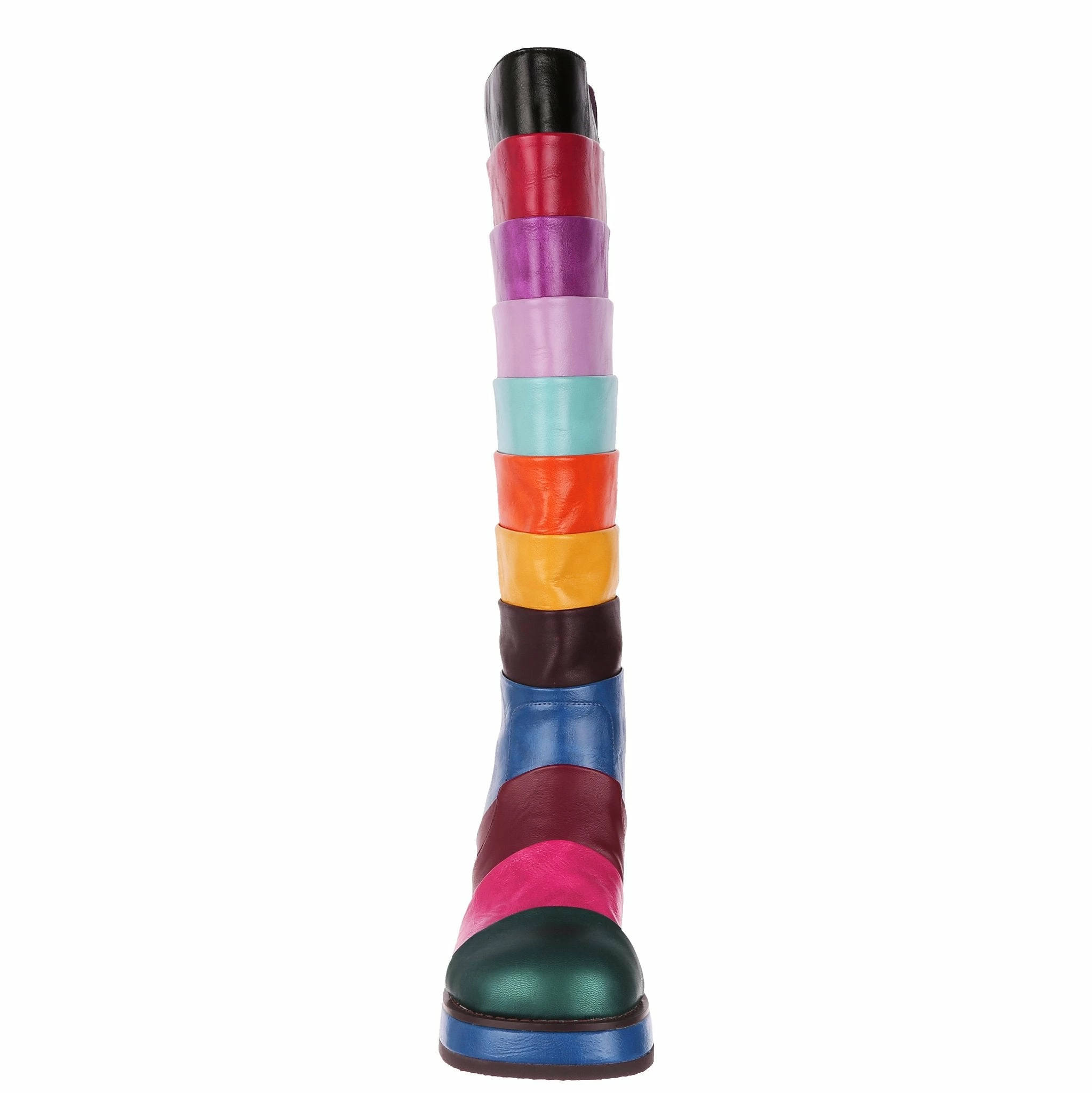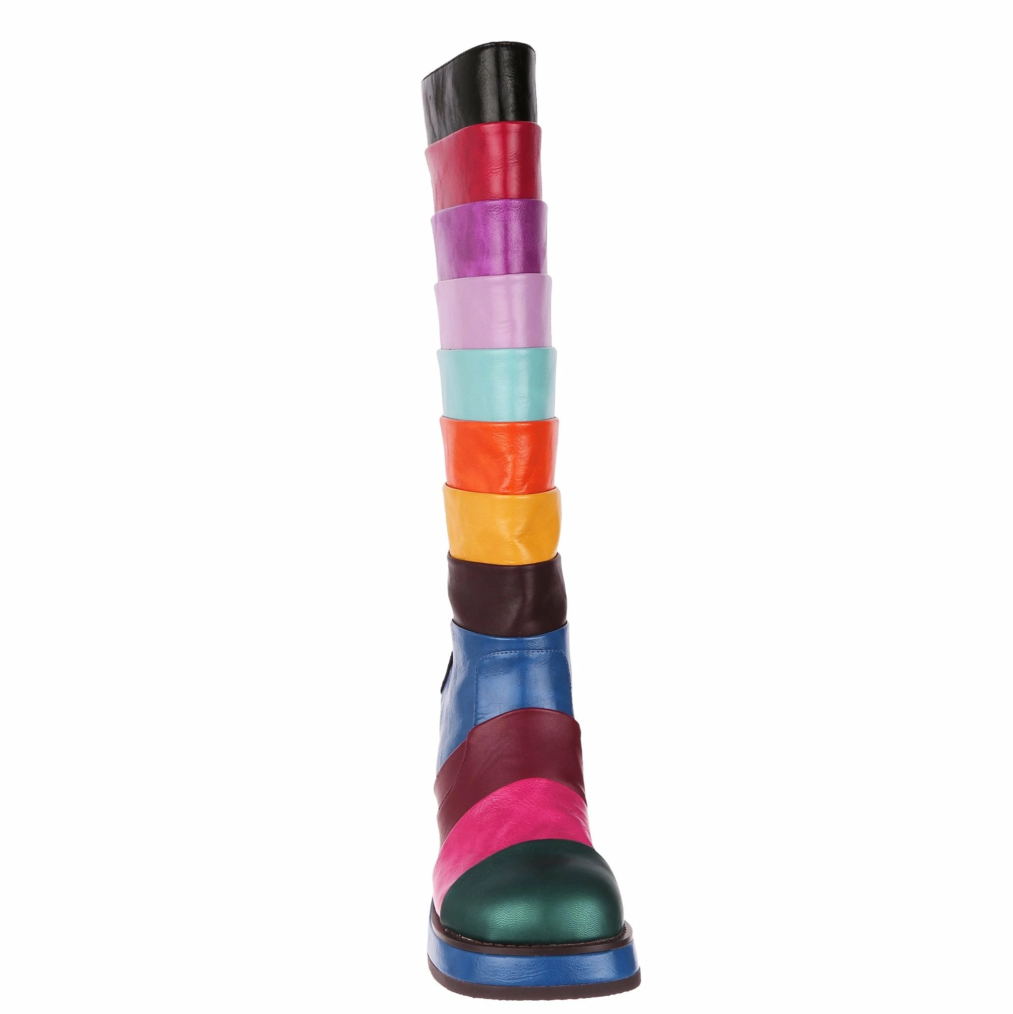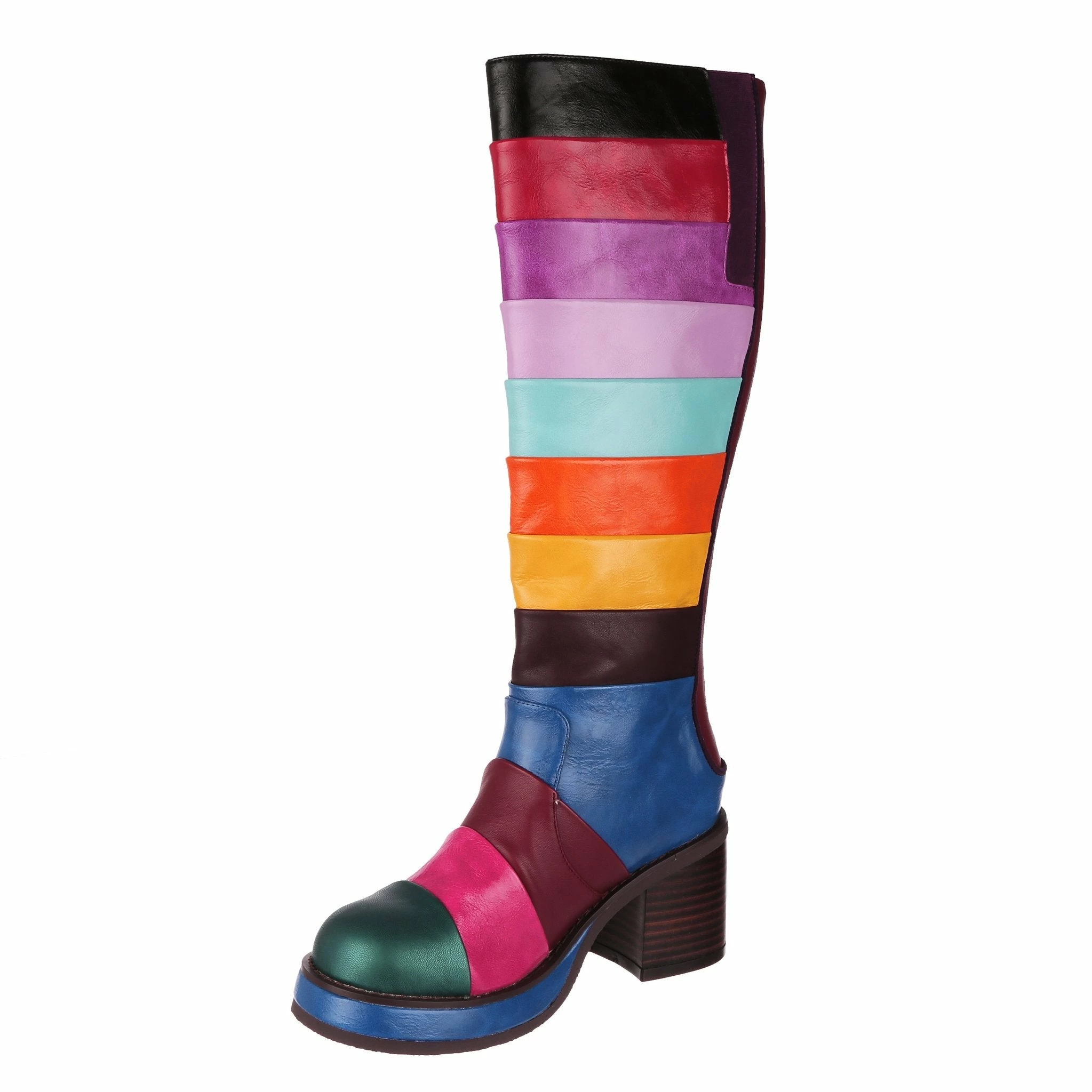 Did someone say statement boots? Get ready to zip up the most dreamy rainbow patchwork beauties you ever did see! With a chunky and wearable heel, elastic for a bit of extra give in the calf, striking squared toe and fabulous tall calf height, these boots are the perfect way to elevate any outfit!