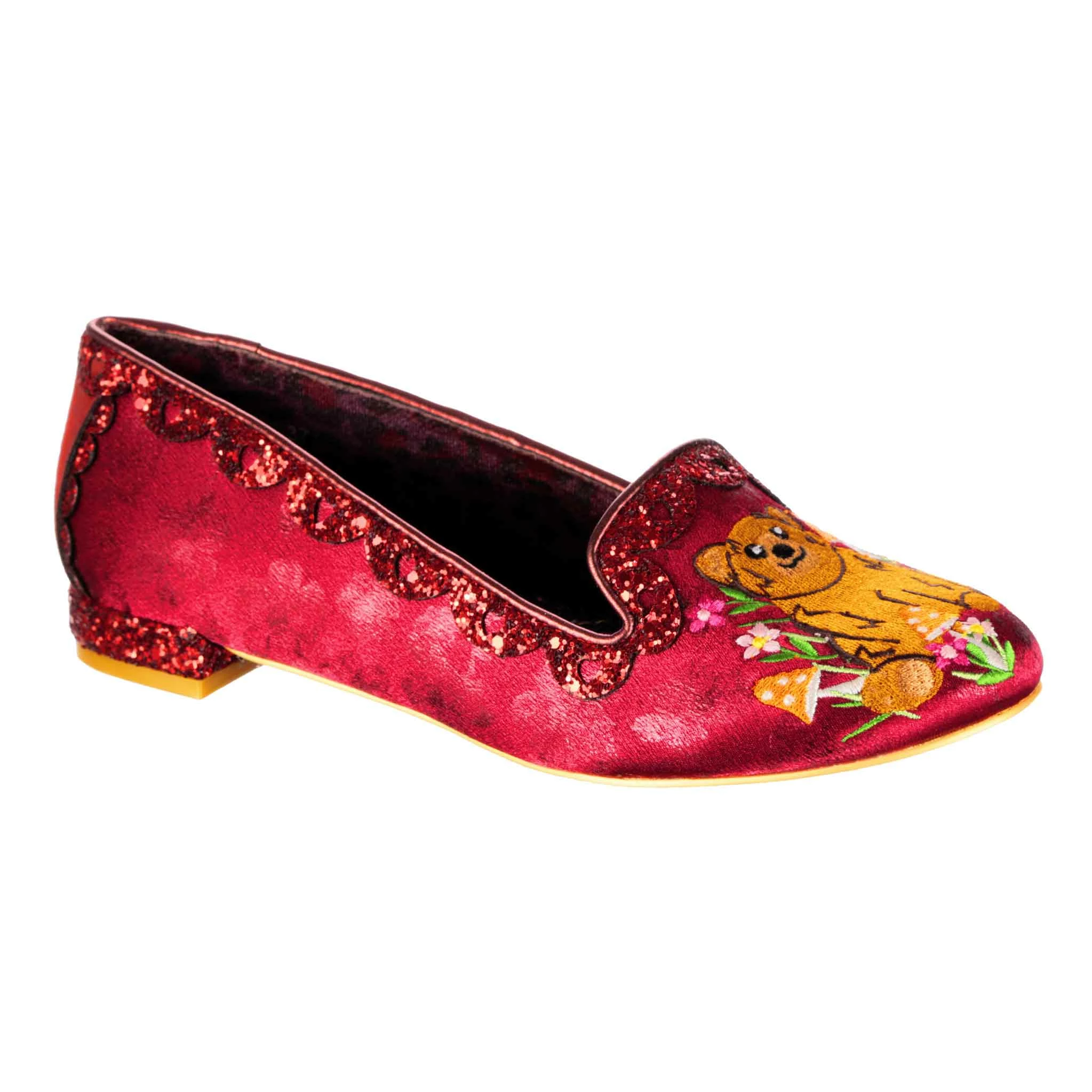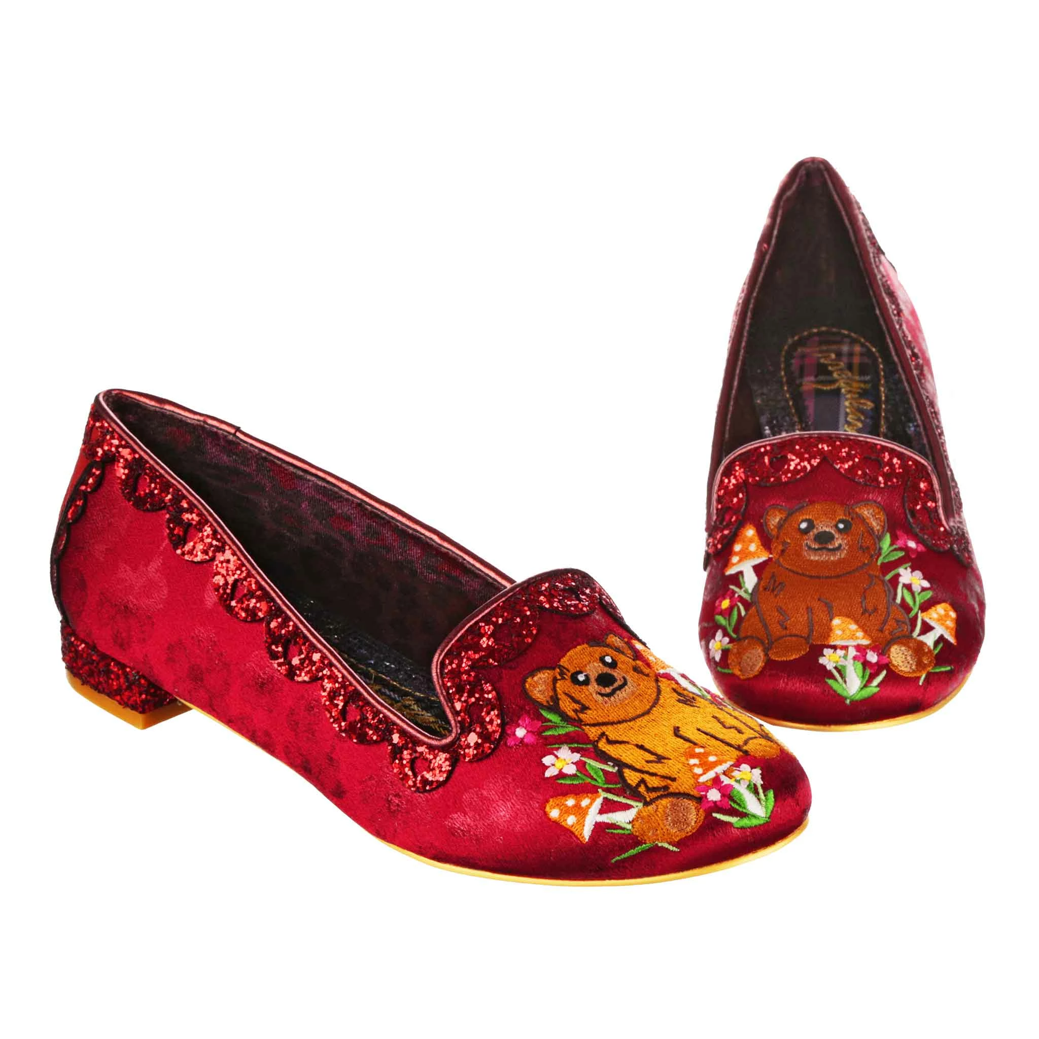 These are the bear neccesities! These silky red slip on pumps are decorated with an adorable embroidered bear on the toe and a small 1cm red glitter block heel, to add a bit of glitz to these flats. So don’t be grizzly, grab them today!