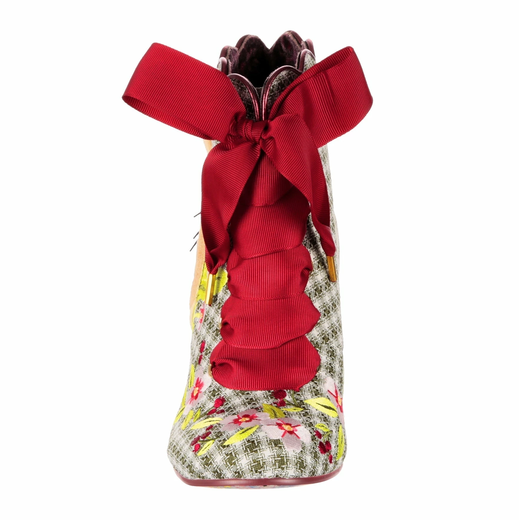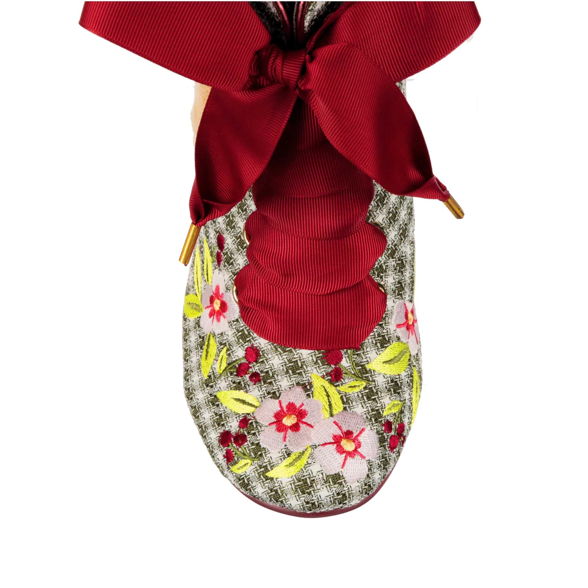 Hop into these adorable mid heel boots! Green and white gingham woven fabric is embroidered with perfect flowers and a cute fluffy bunny is appliqued on the side with 3D ears and whiskers. Lace up the contrasting red ribbon laces and they’re the perfect finish for a cottagecore outfit. Add these to your wardrobe and you’ll be wiggling your whiskers with joy!