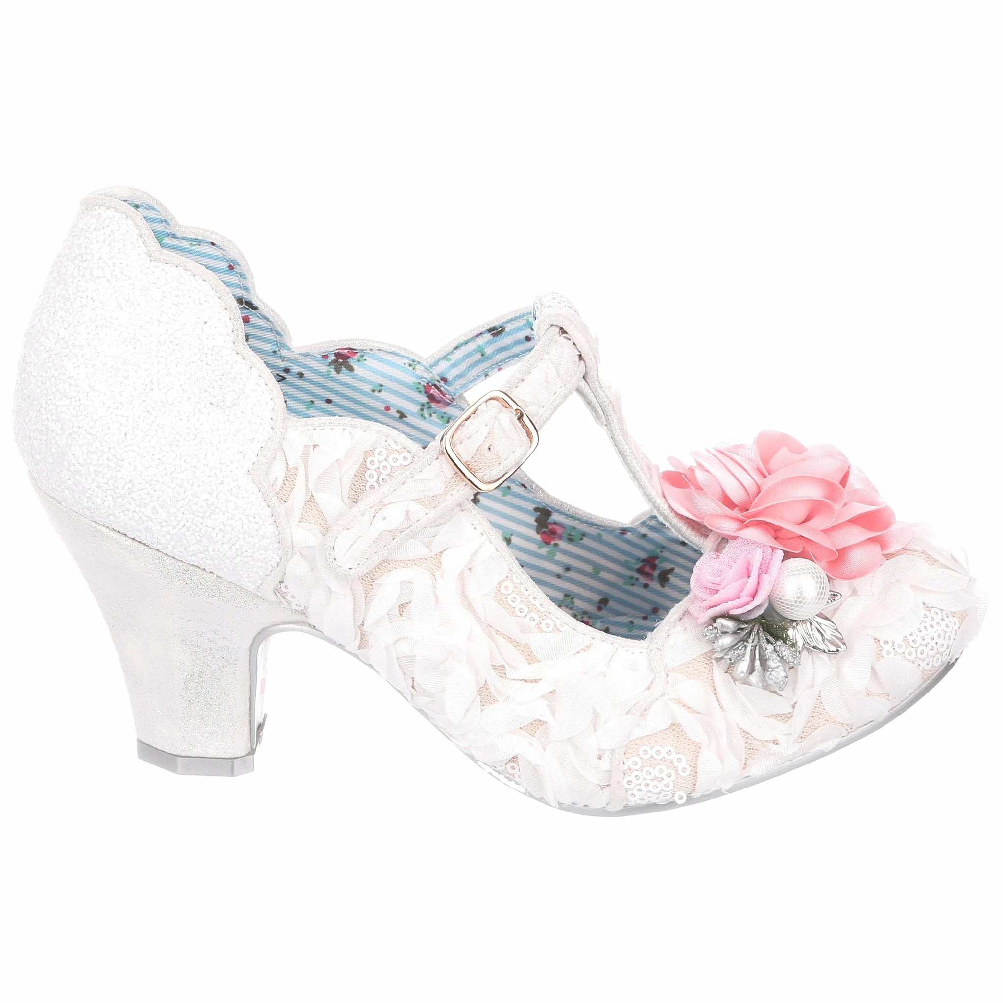 Add some glitz and glam to your toes! Beautiful white confetti and sequins cover a buff coloured base on these bridal mid heels, with a distressed iridescent faux snakeskin column heel. Fastened with a gold buckle on the t-bar, and finished with a posey of floral, pearl and trinket embellishments on the toe to add a touch of colour. Be your own decorations on your big day!