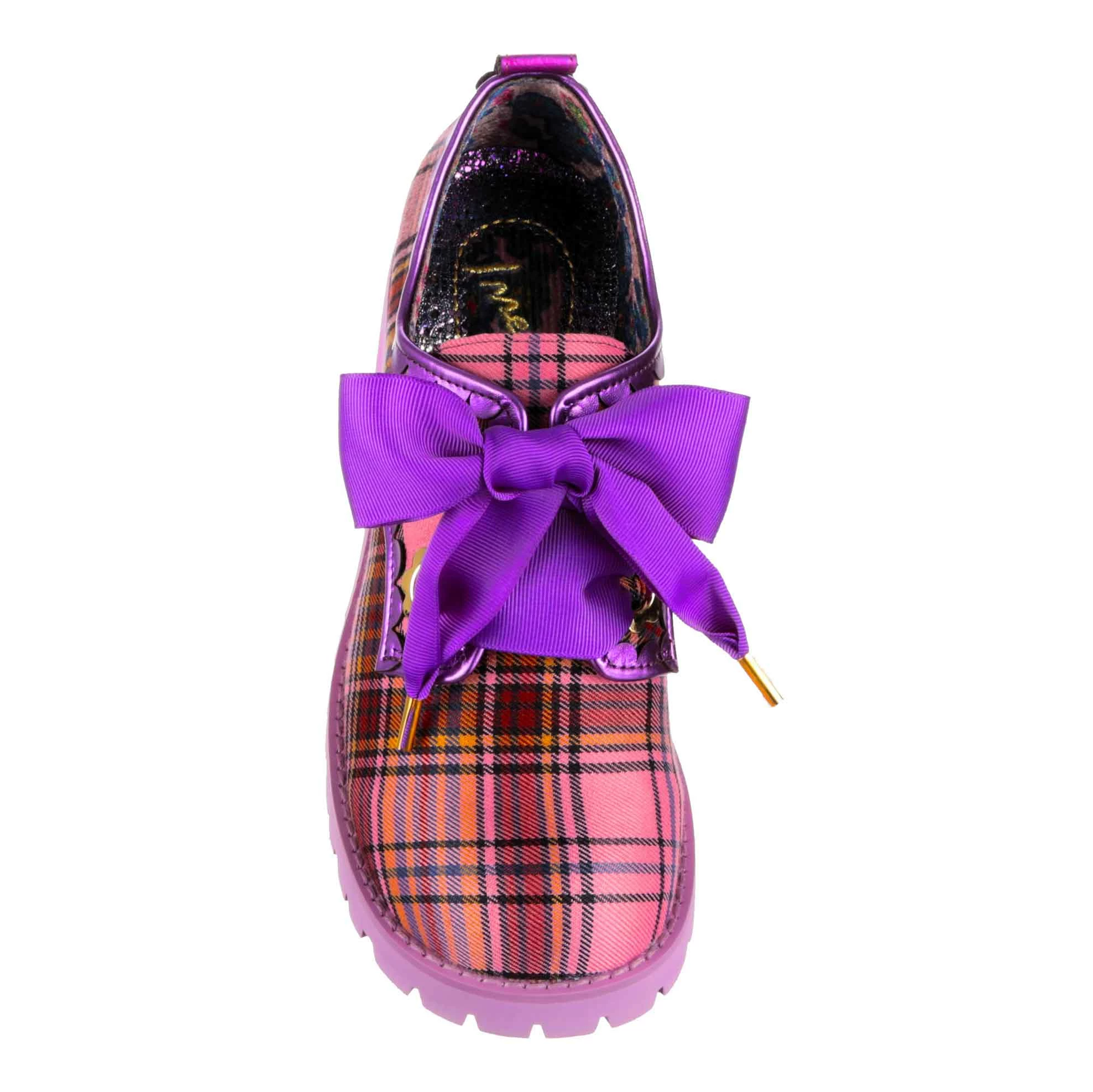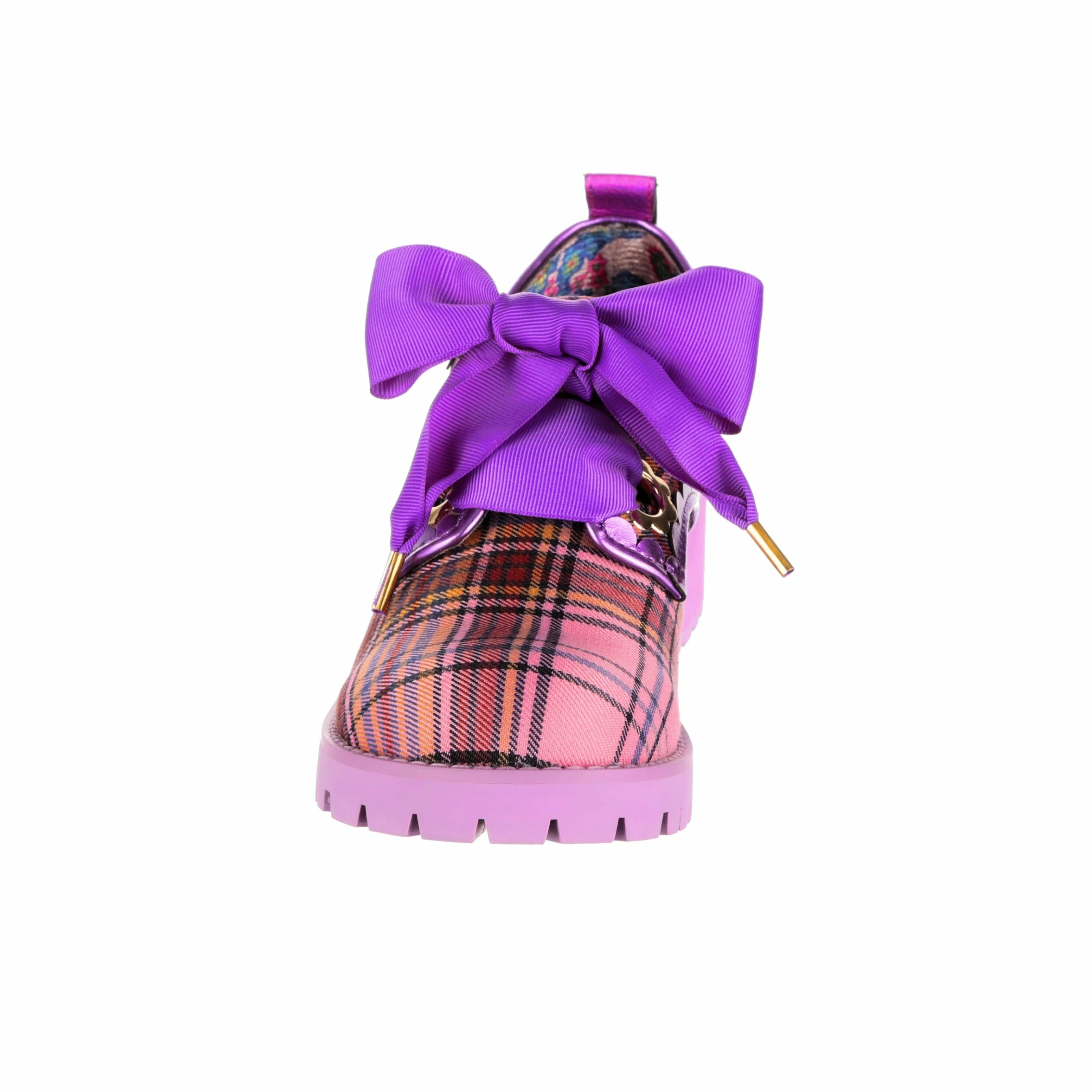 Ring ring! Phew, saved by the bell! Pink and purple tartan is matched with purple ribbon laces and lilac chunky mid heel, add to your wardrobe for a burst of colour. Grab these comfy lace ups to give your outfit a touch of 90’s vibe!