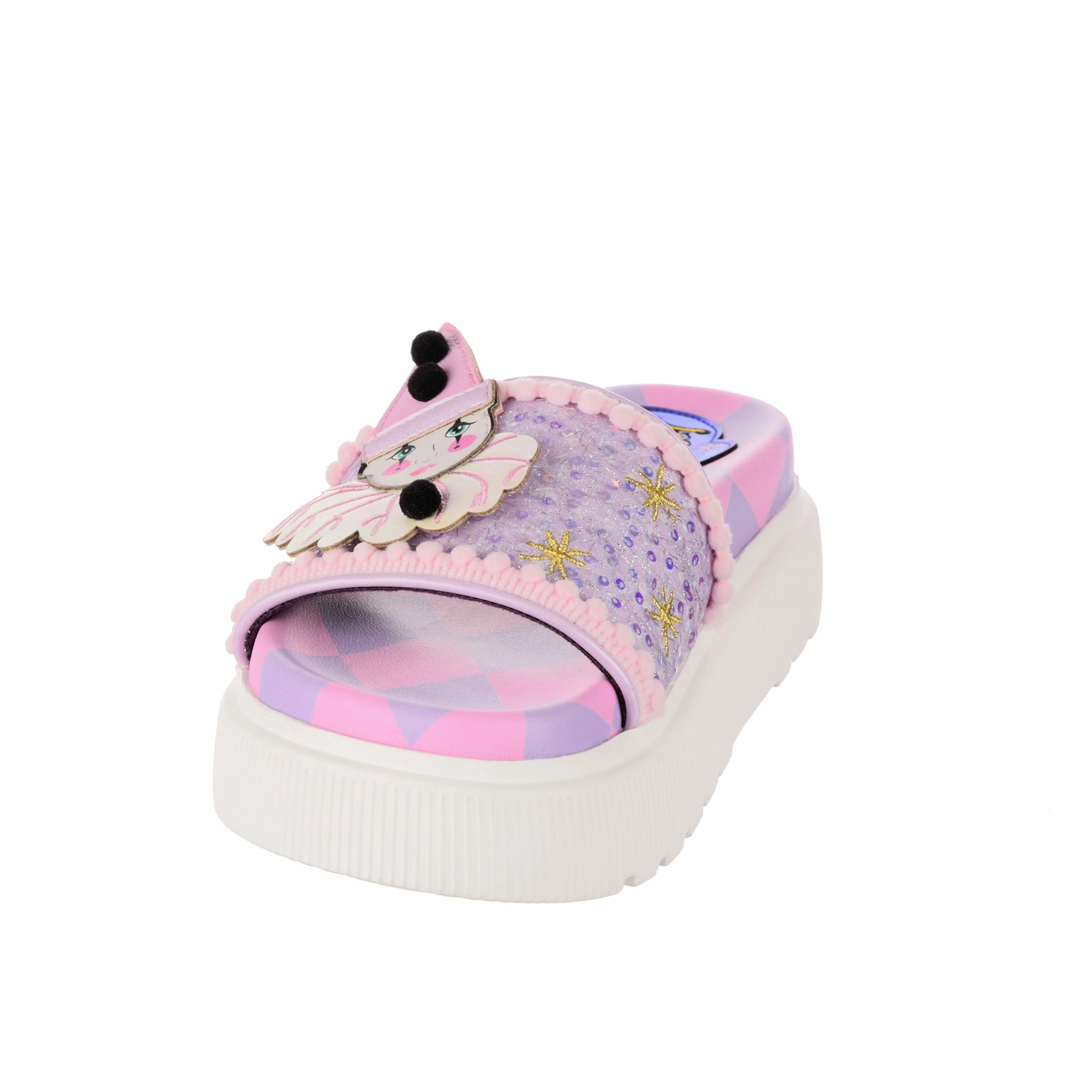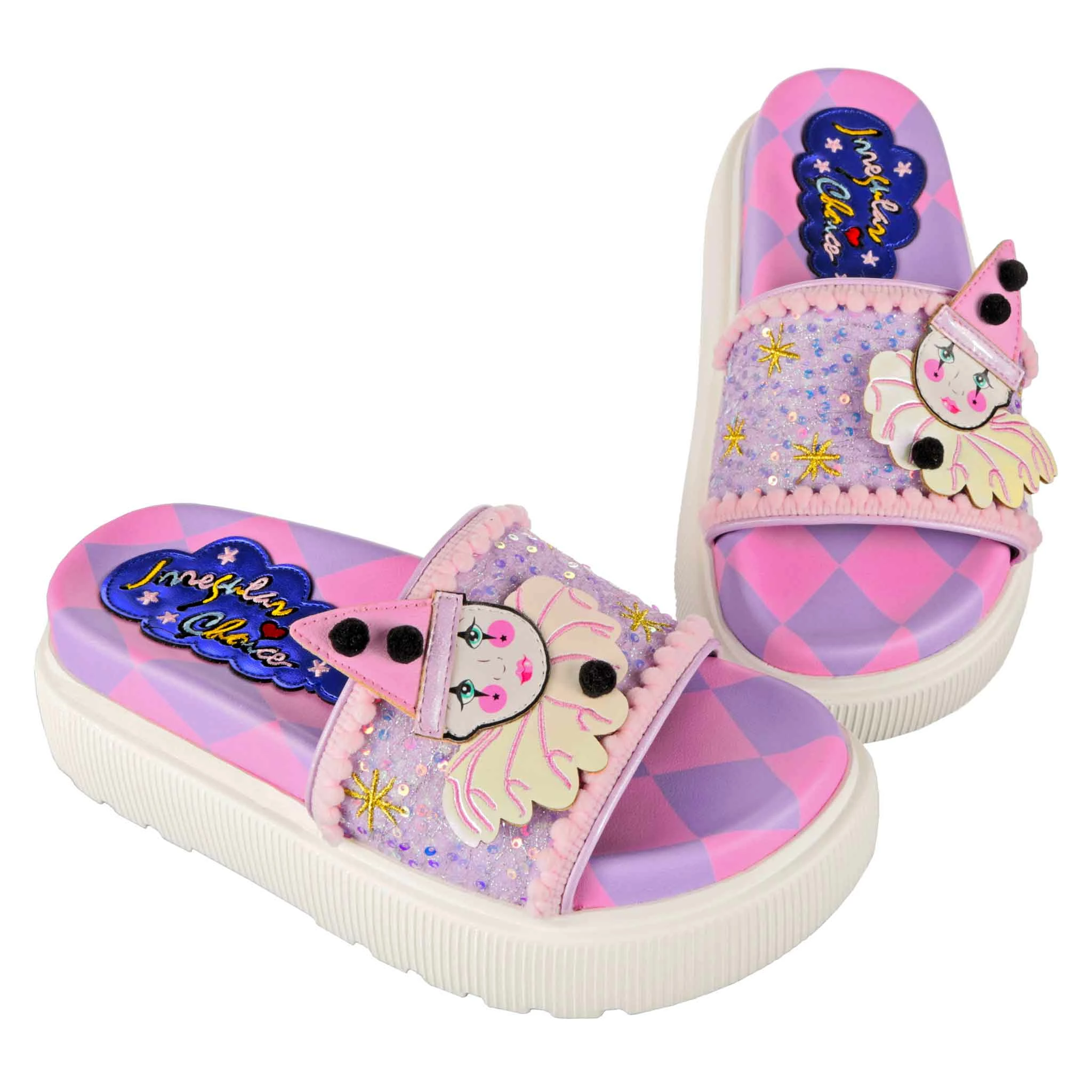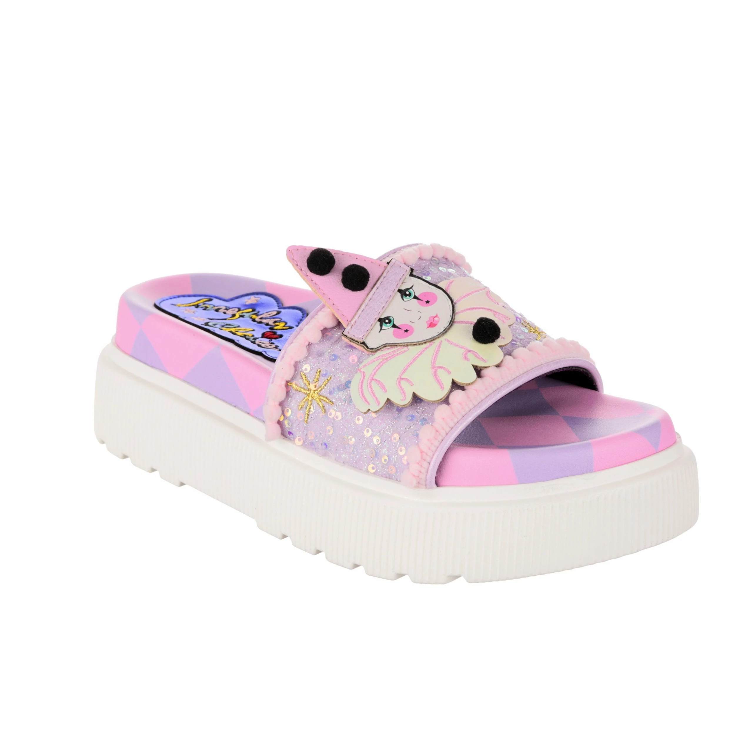 These clown slides are so cute and comfy! Slip on these purple platform sliders and you’ll be ready to entertain. The wide strap sparkles with iridescent lilac sequins and a rosy-cheeked pierrot sits waiting for their time to shine. Lightweight sandals that have an ultra bouncy sole, adding a spring to your step and the cushioned sole has a pink and purple harlequin diamond pattern that gives colour and comfort to your outfit!