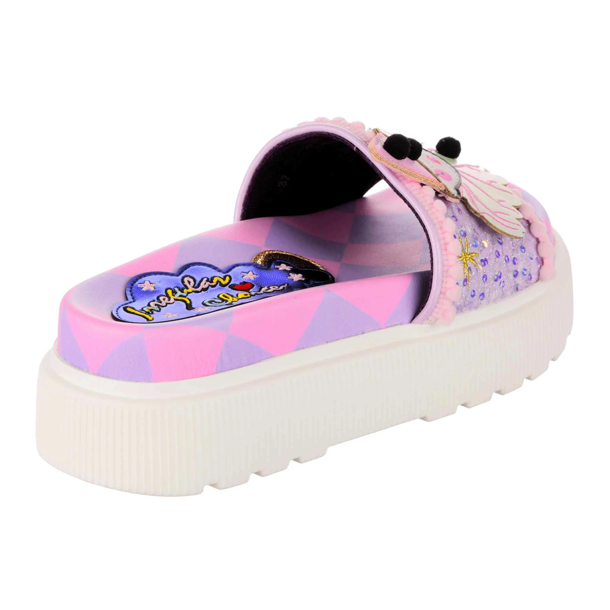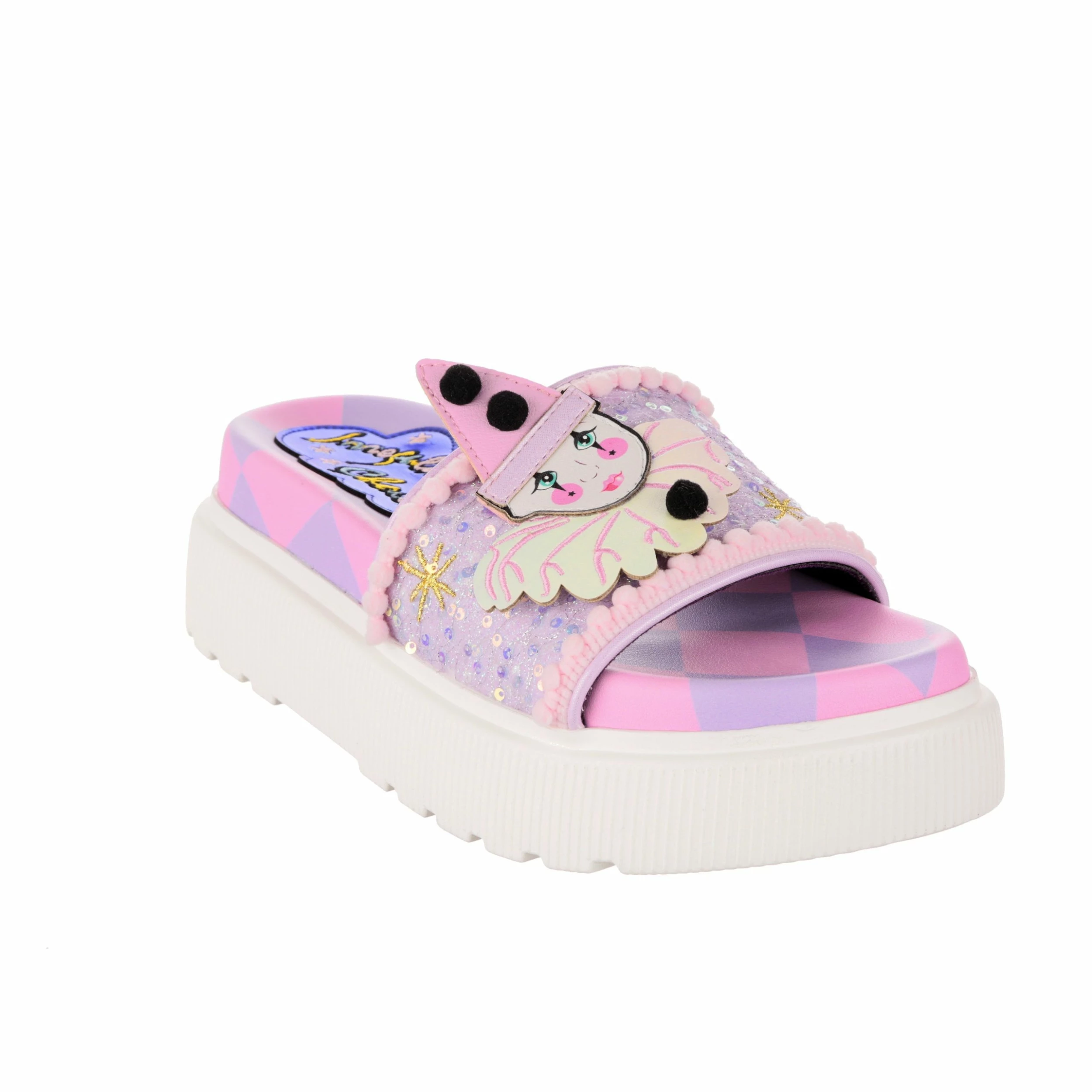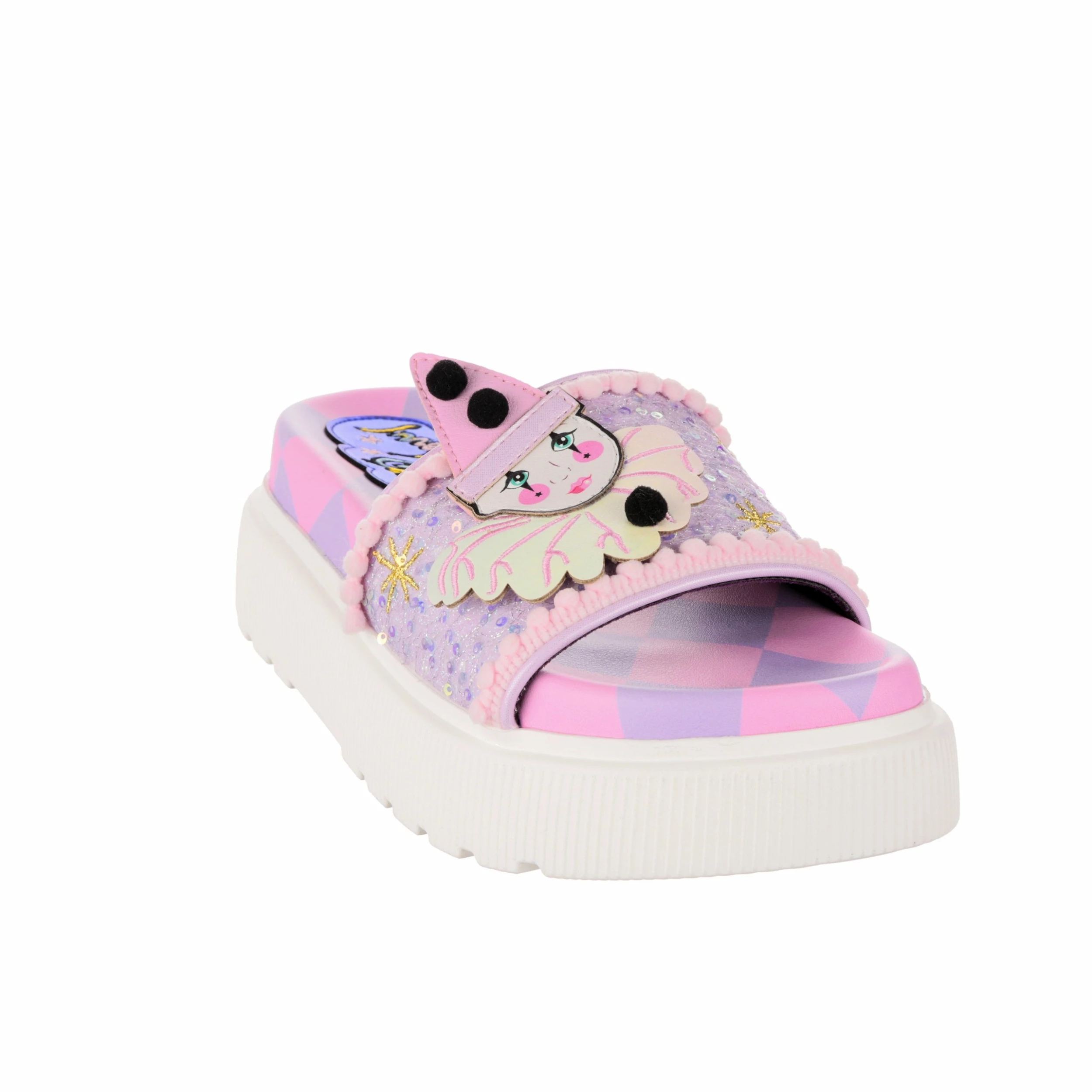 These clown slides are so cute and comfy! Slip on these purple platform sliders and you’ll be ready to entertain. The wide strap sparkles with iridescent lilac sequins and a rosy-cheeked pierrot sits waiting for their time to shine. Lightweight sandals that have an ultra bouncy sole, adding a spring to your step and the cushioned sole has a pink and purple harlequin diamond pattern that gives colour and comfort to your outfit!