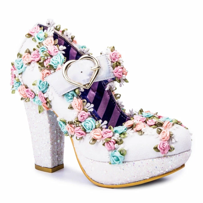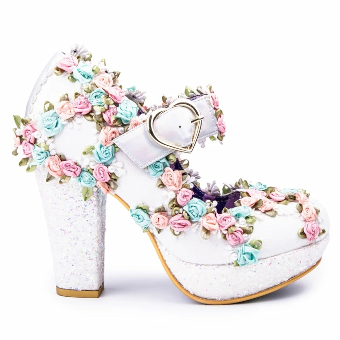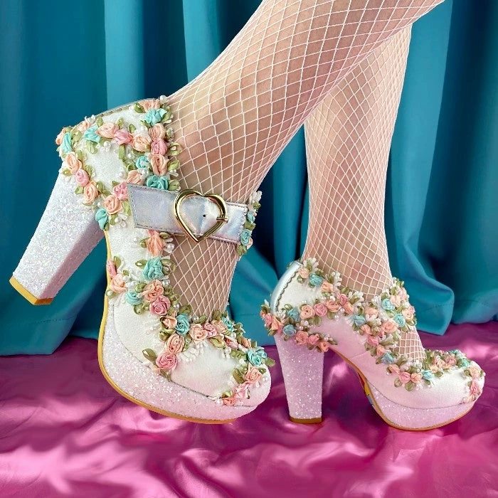 Wrap yourself in flowers and love in these darling heels! Stunning flowers criss-cross around the ivory upper in hues of pink, teal and green, adding opulence and elegance to this gorgeous pair of shoes – this is all pulled together with the creamy metallic mary jane strap that has a heart buckle. The chunky heel and platform is covered in matching glitter as the cherry on the top. Add these lovelies into your world today!