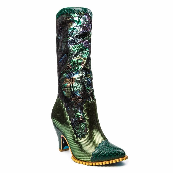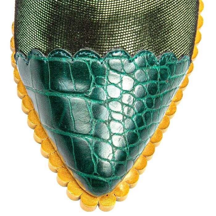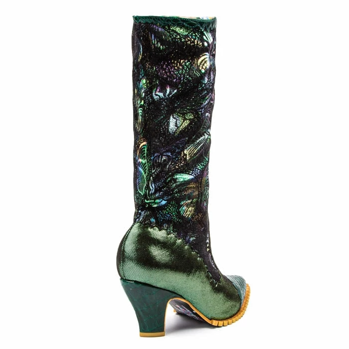Perfect for those colder months, these metallic emerald green slouchy boots have a wearable heel and pointed toe, with scalloped sole detailing for extra oomph! The main body of the boot has metallic butterflies fluttering across the fabric, blending into a textured leatherette and then an adorable scalloped toe cap to really tie it all together! An enchanting pair, ready to join your collection!