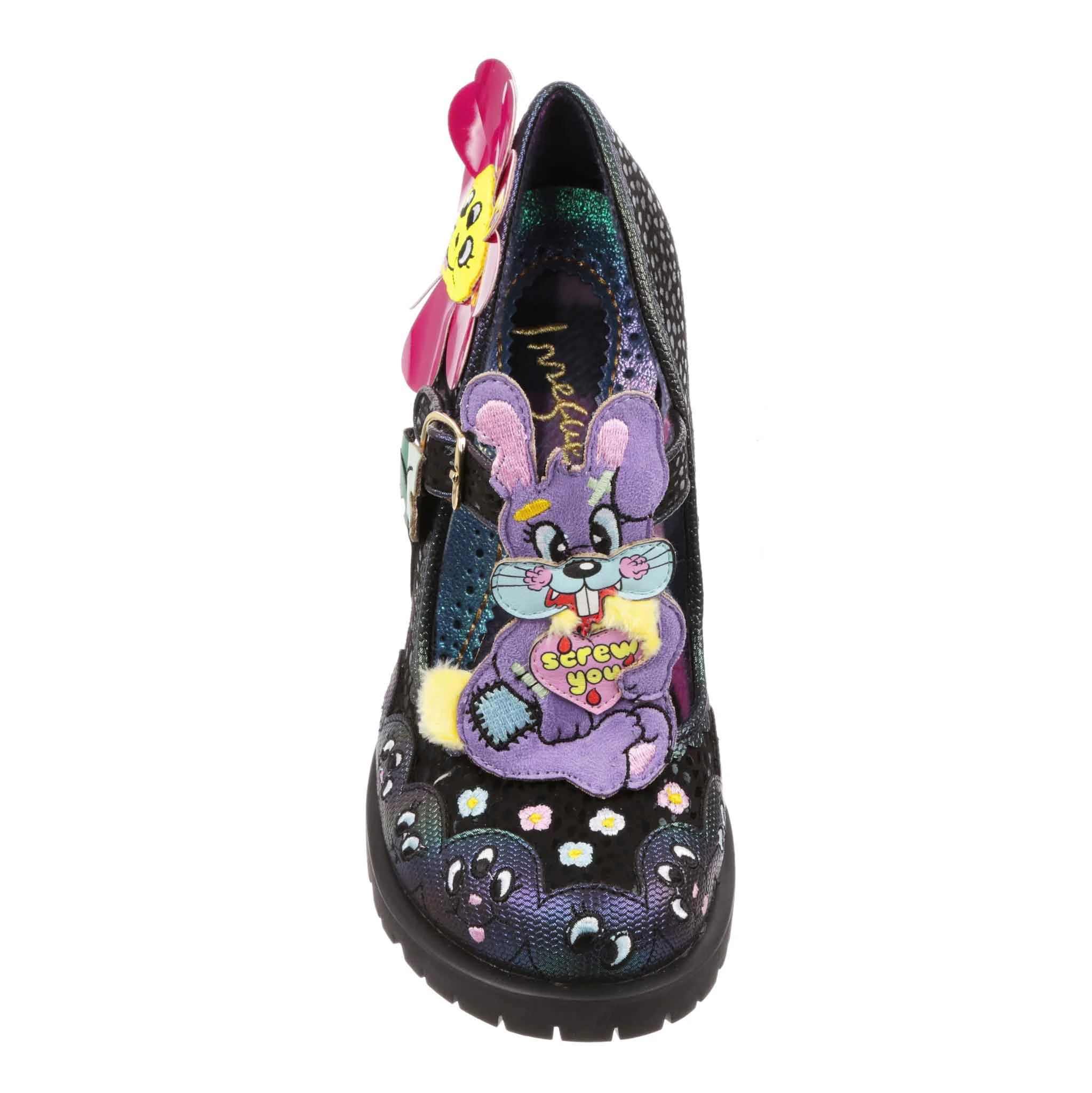 Want something cute but also spooky? Get ready to have your mind blown! This season’s character heel is a beaten-up teddy bear, with stuffing hanging out and everything, and joining them are flowers with three eyes, a scary cat, and a bunny too! All are showcased on these iridescent black T-Bars, with oil slick scalloping along the toe – also featuring faces! These are definitely conversation starters!