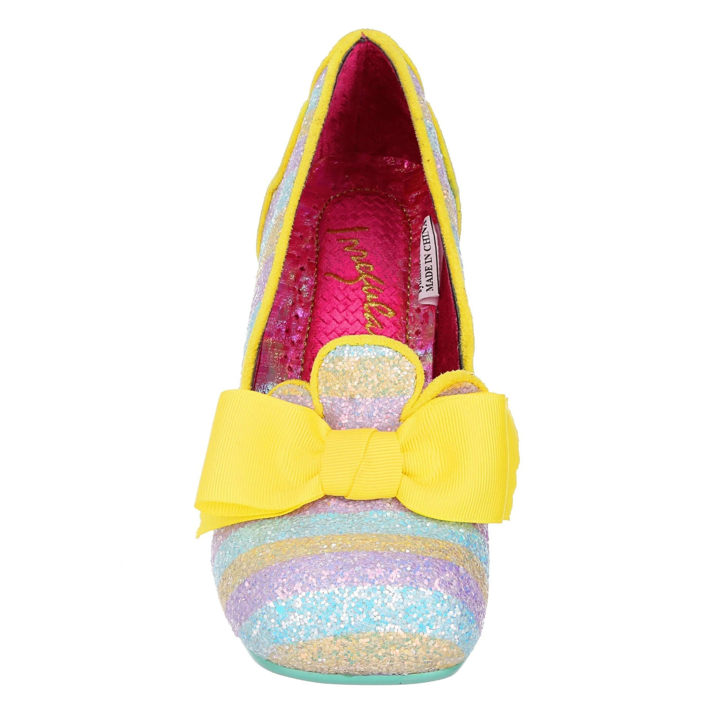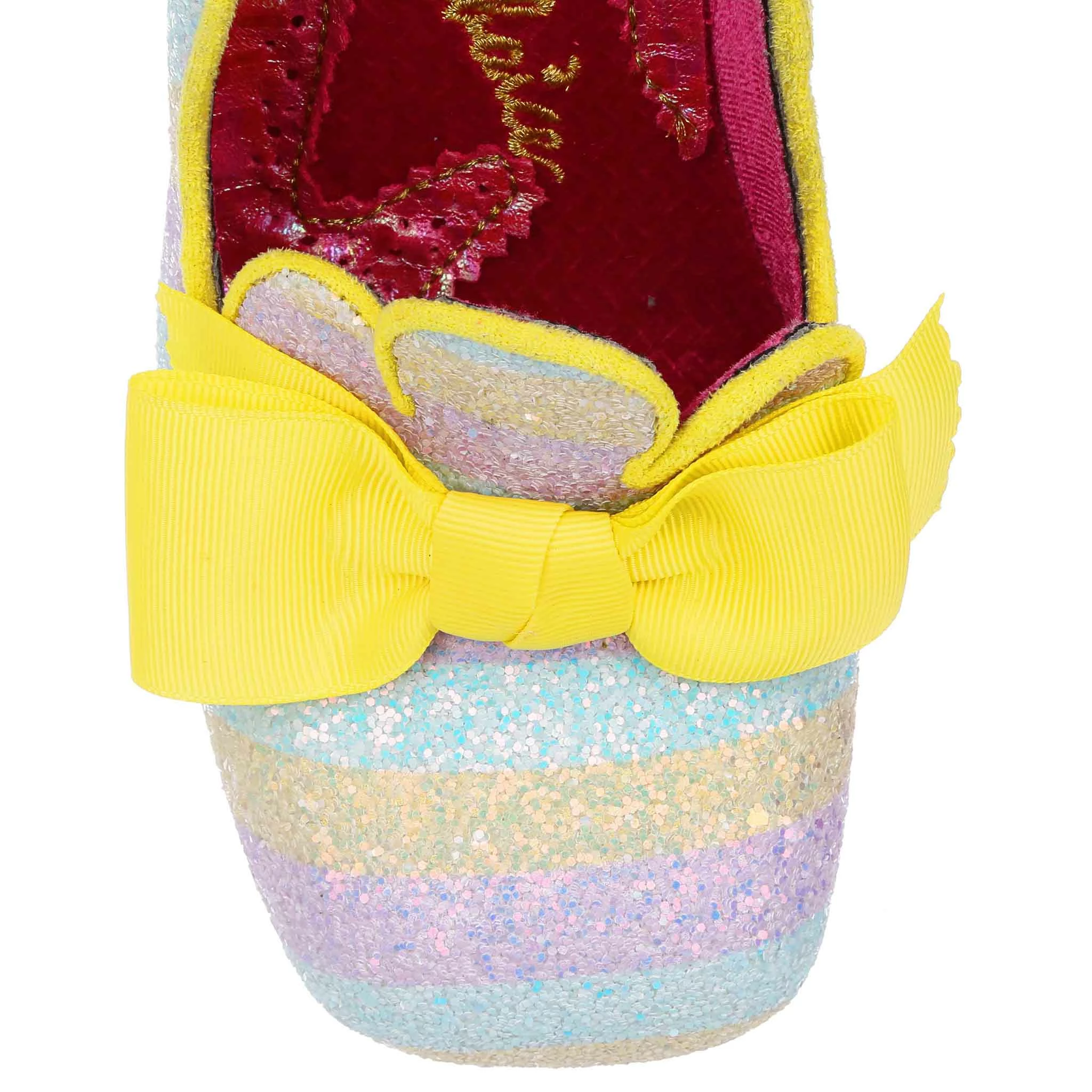 Feel like royalty in these regal heels! Featuring a shimmering yellow fleur de lis on the heel of the upper and tongue of the shoe, these bow topped lovelies are accented with a gorgeous curving heel to really give that opulent feeling all over! The pastel striped glitter upper is perfect to pair with all your favourite bright clothes, or even a more muted outfit so that they can really pop! Give them a whirl, why not?