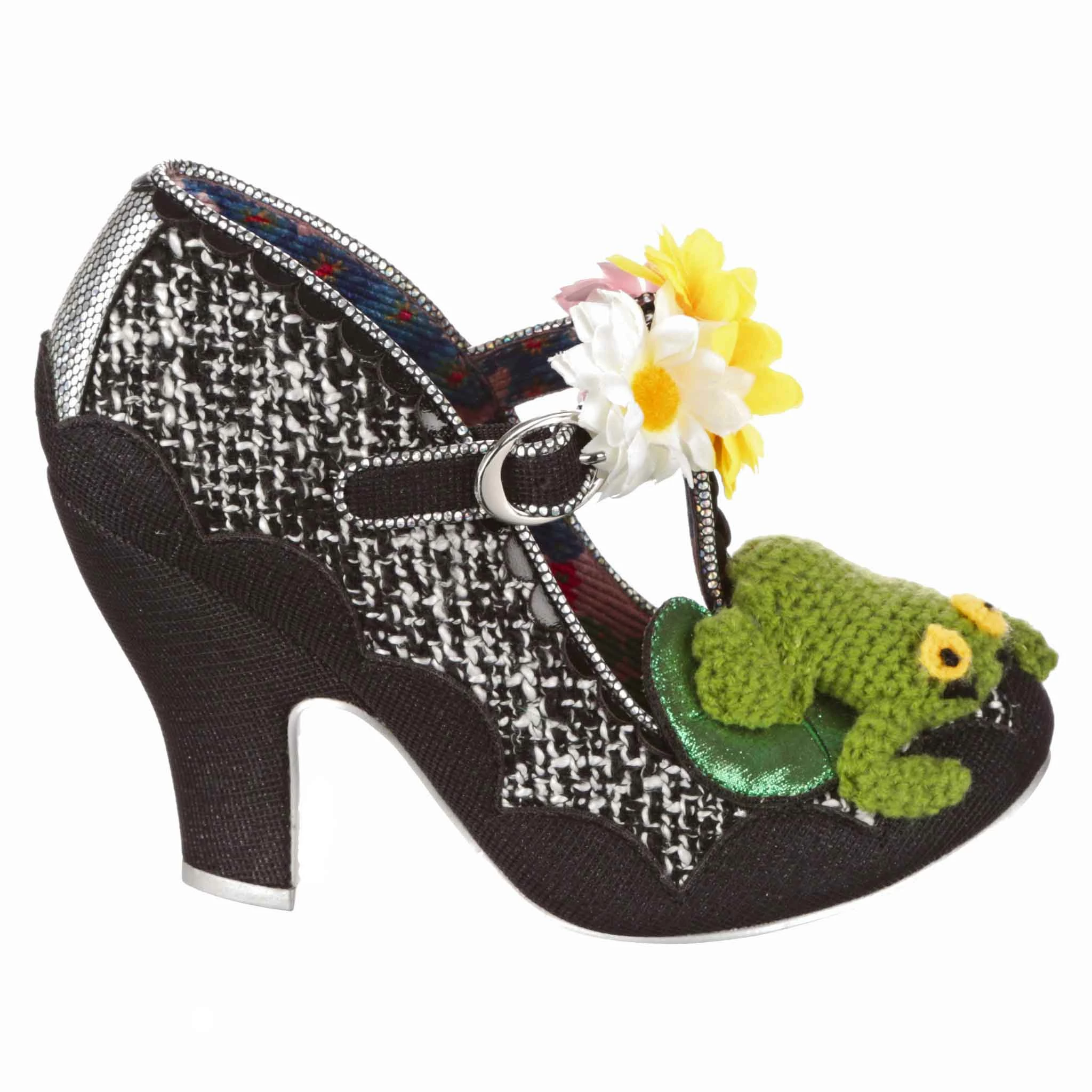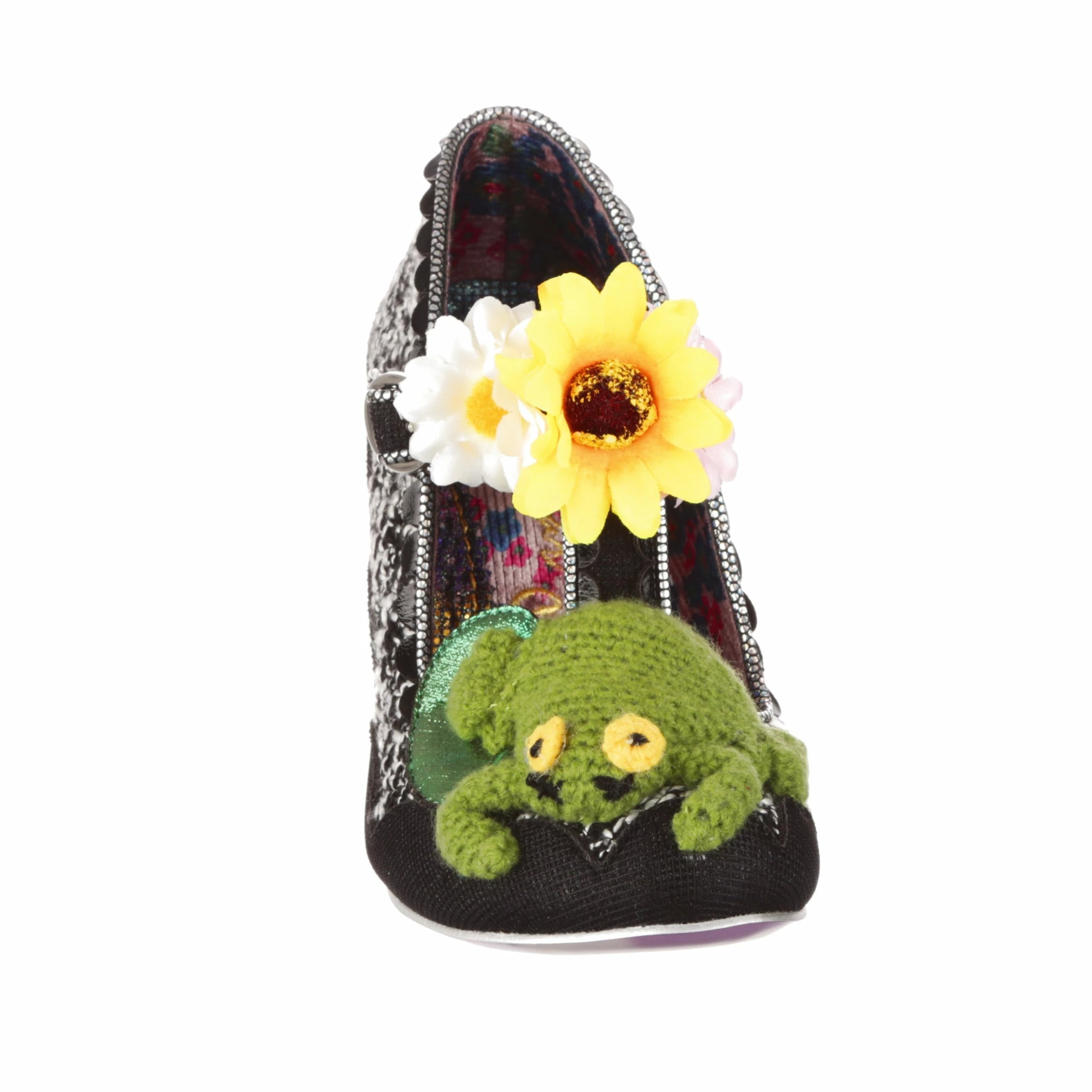 The hoppiest heels ever! Black high heels with a t-bar strap is decorated with blue glitter, bright flowers and lily pads, and on one toe is Lily the frog, who is ready to leapfrog you to best-dressed! Each Lily the frog is hand-crocheted with love, so they all look a bit different which adds to their charm and personality! What adventures will you take Lily on?