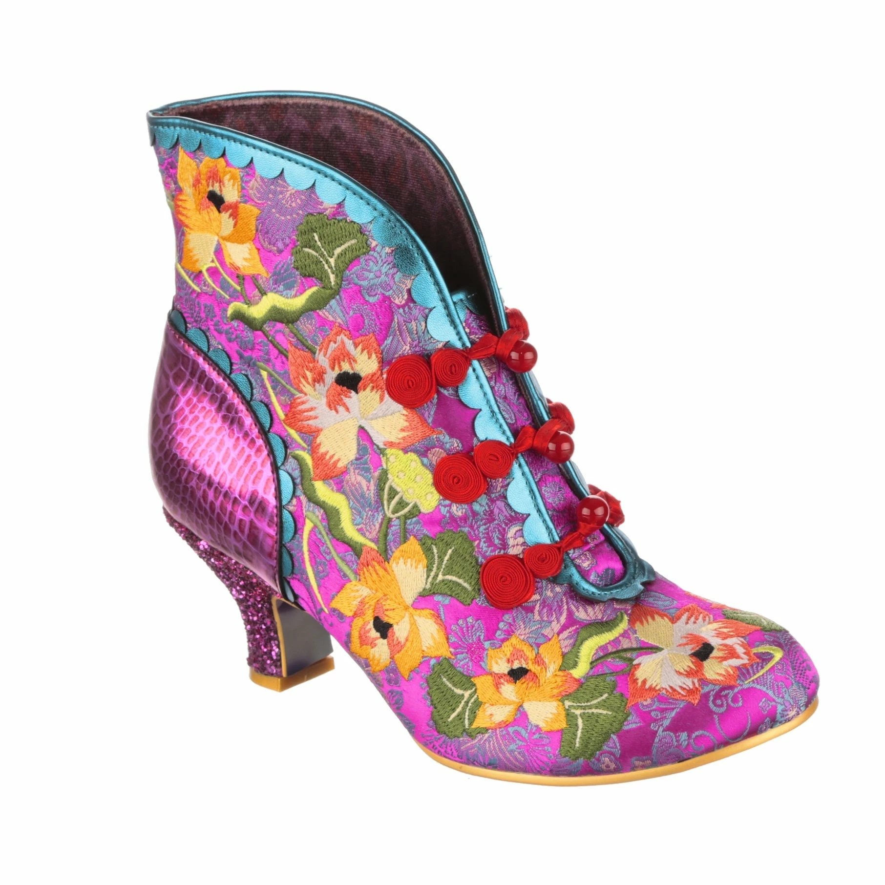 Time for some fierce florals! Bright and sassy silk-like pink brocade low heel boots are brought to life with large embroidered florals down the side and on the toe. The metallic blue scalloping and red frog closures make these ankle boots feel like the epitome of luxury!