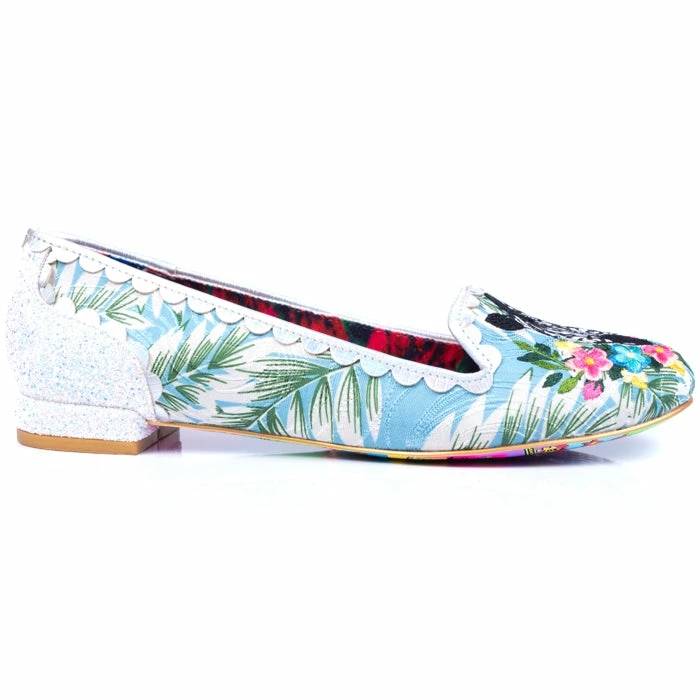 Born to be wild! Unleash your inner spirit animal in a pair of these fierce flats. Featuring a leaf printed upper complete with a glittering low heel and cute embroidered giraffe and zebra on the toe.