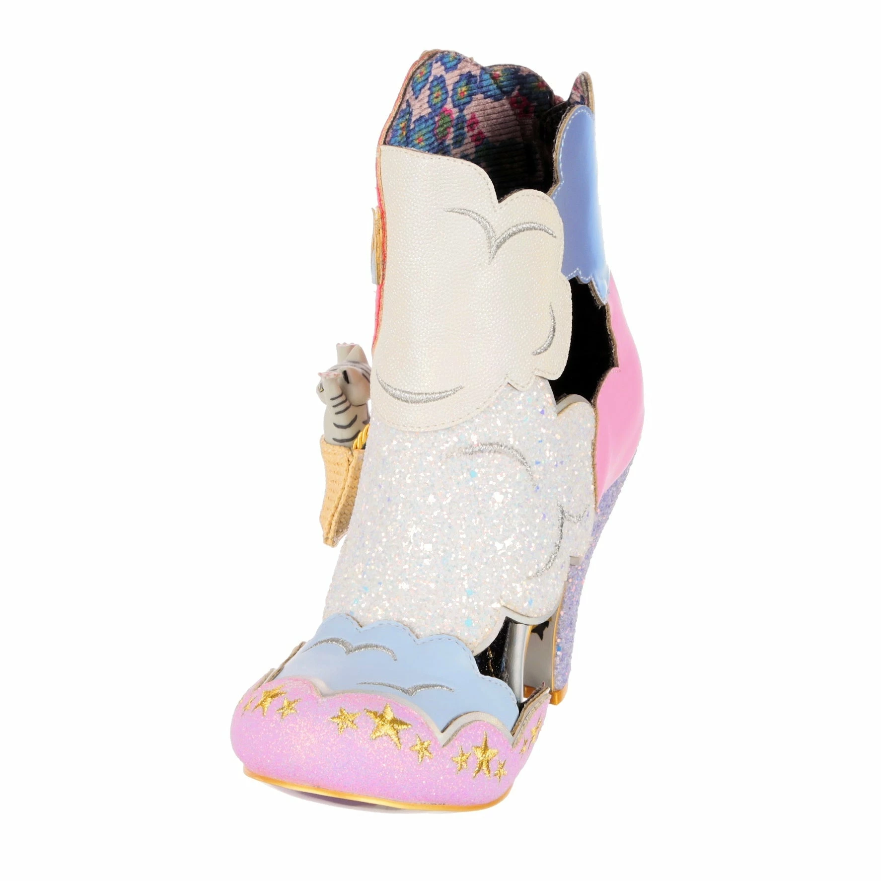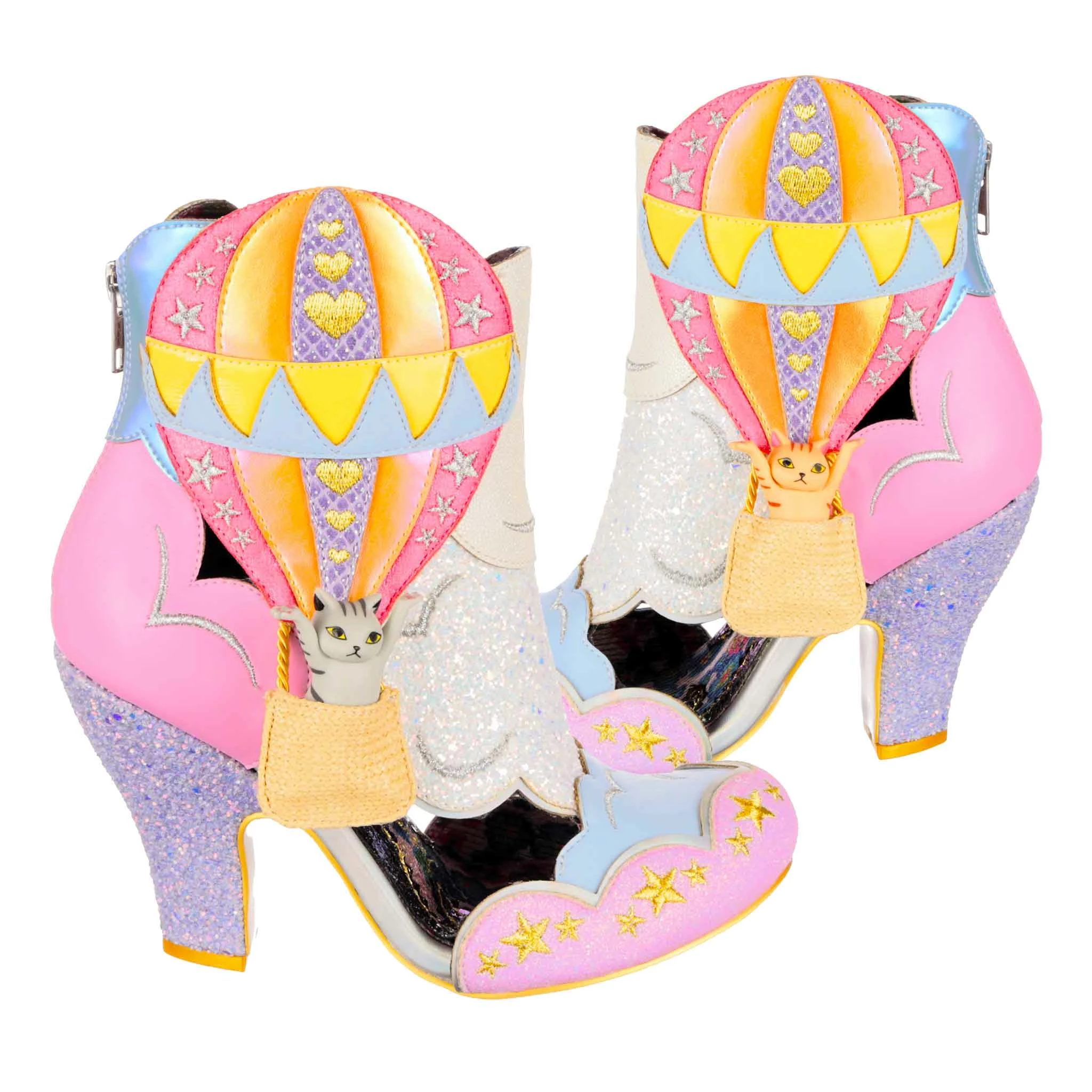 Hop in the basket and let’s go for a ride! Bright pastels make up colourful clouds that cover these high heel boots with cheeky cut outs and an easy fastening zip at the back. Cute cat Phineas Mog is having the time of their life in the hot air balloon applique on the side. Grab life by the whiskers and get a pair now!