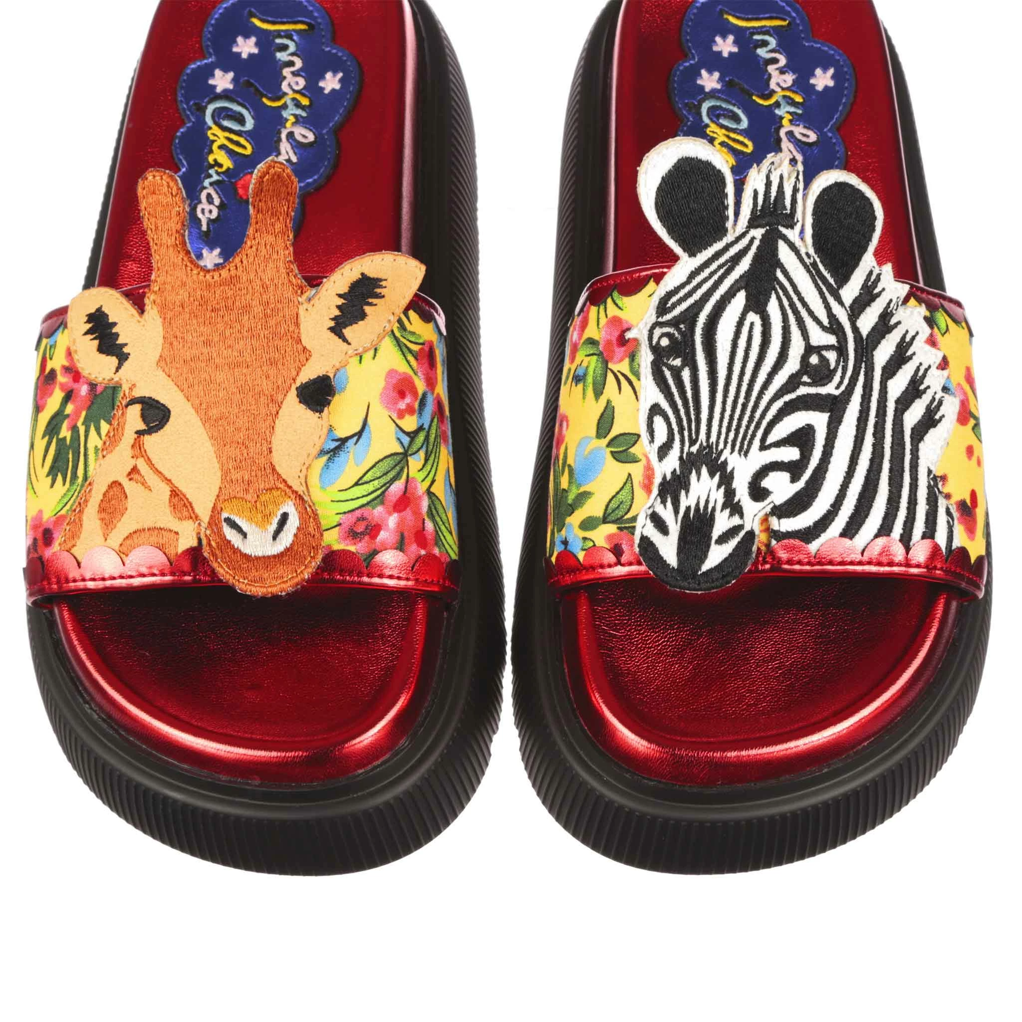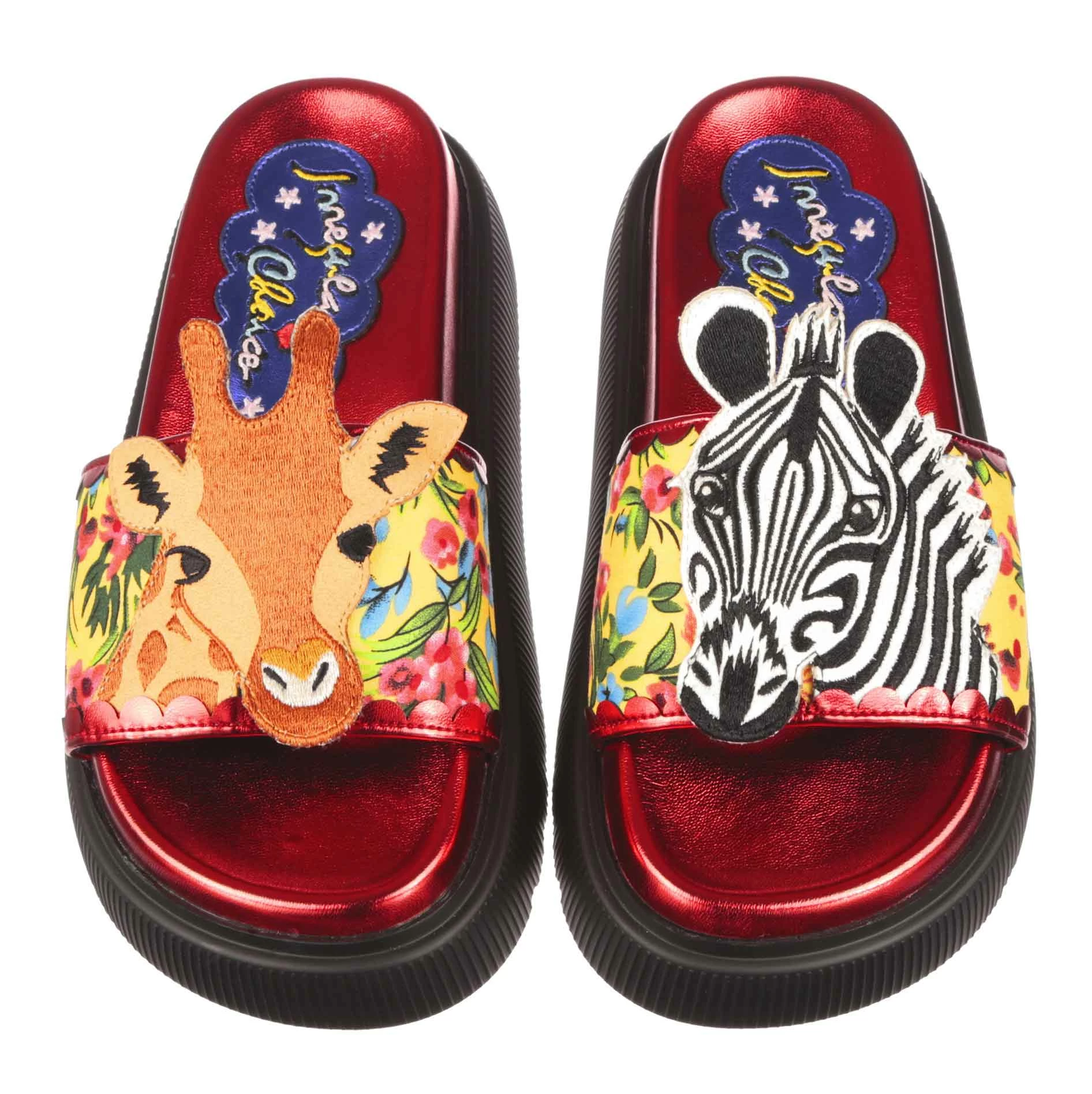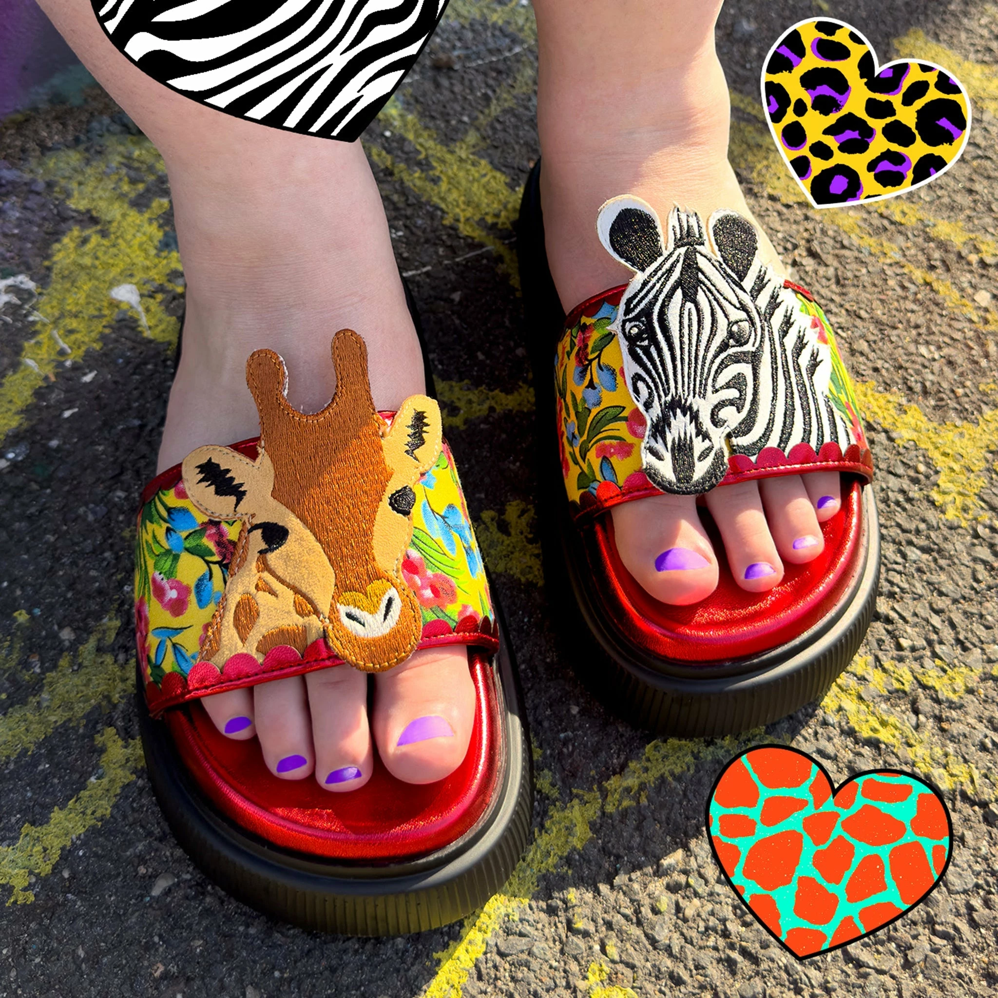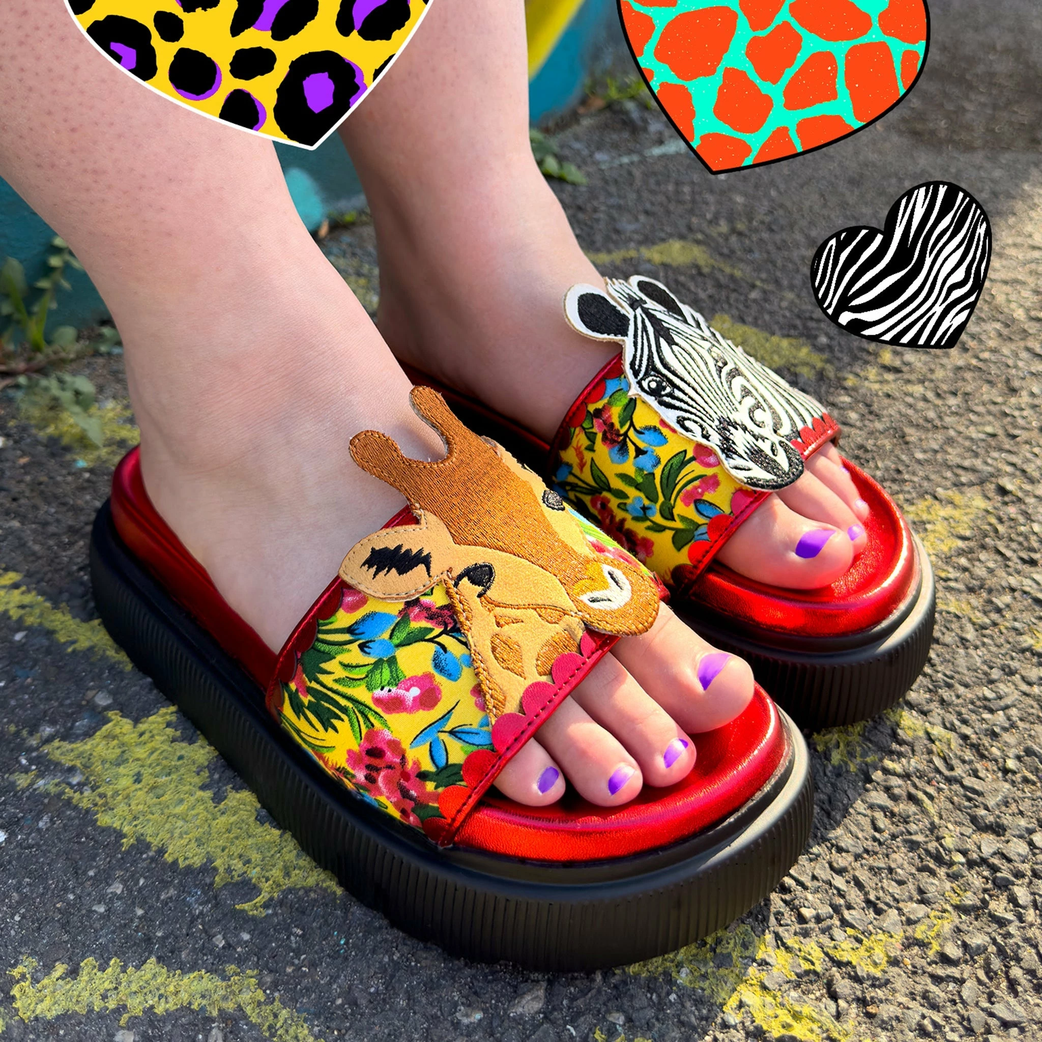 Time to say haaaay to the herbivores! Serve yourself a big slice of safari chic in these chunky flatform slider sandals – perfect for the savannah or the supermarket. Featuring embroidered applique designs of our favourite African vegetarians – a giraffe and a zebra – on a bright floral fabric. These lightweight sandals that have an ultra bouncy sole which will surely add a spring(bok) to your step!