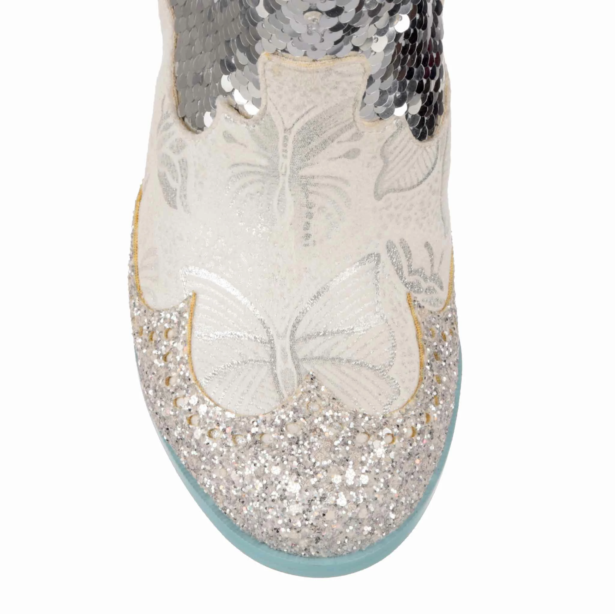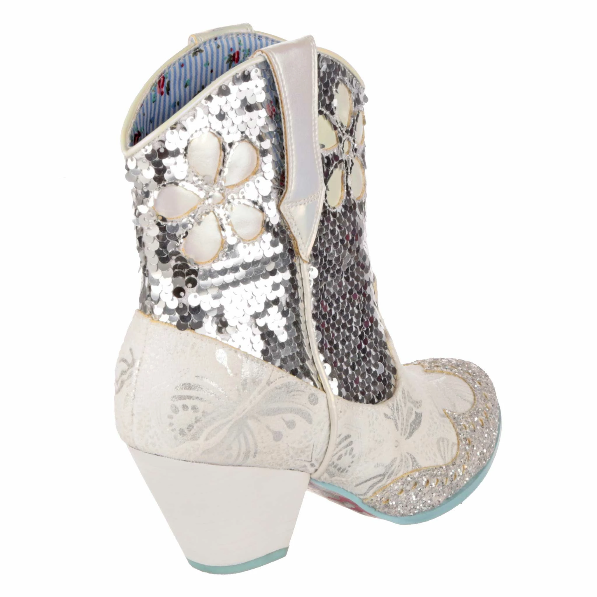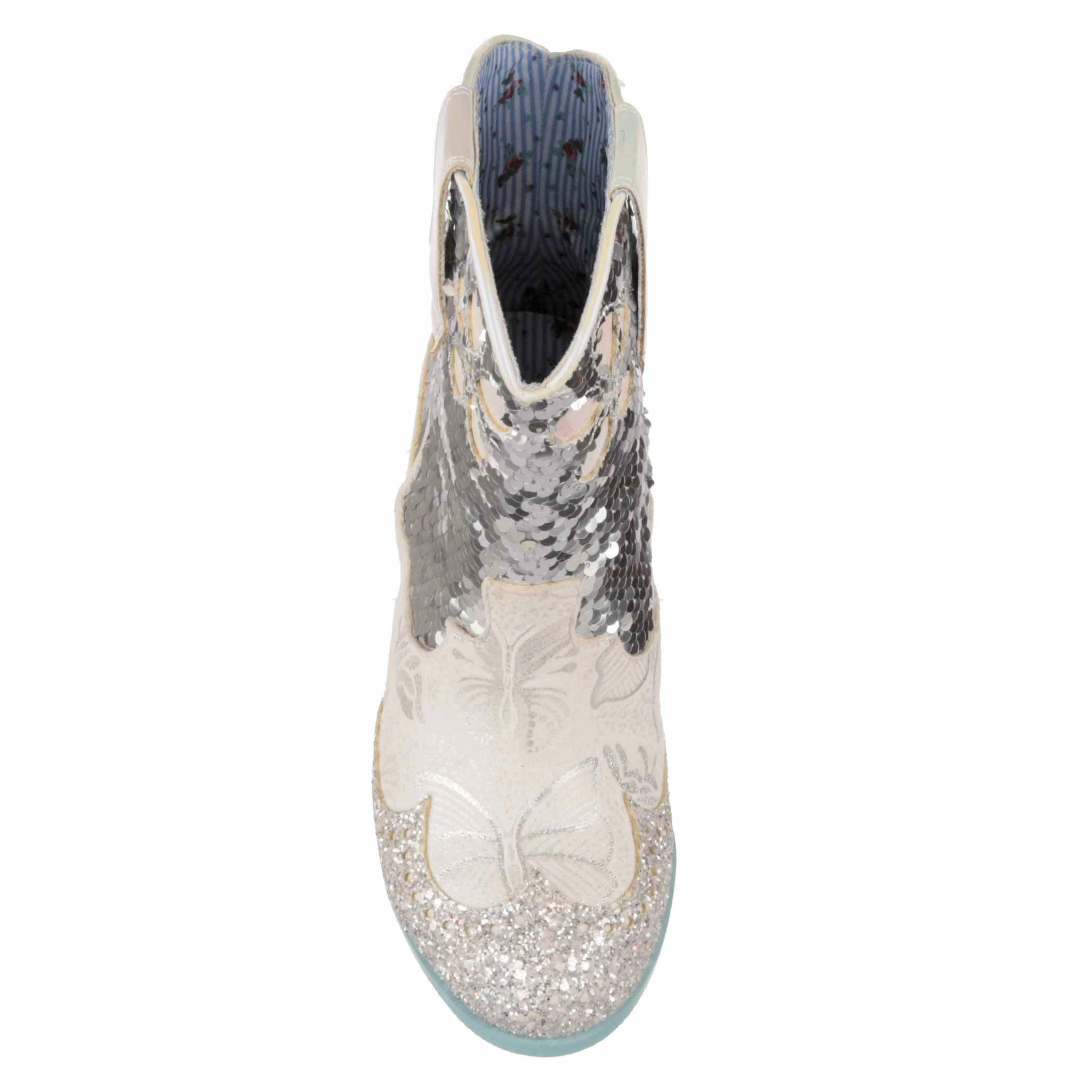 Planning a wedding hoedown? Then giddy up partner and grab a pair of our sparkly white and silver bridal cowboy boots that’ll definitely bring the party to your big day. Calf length boots covered in a mix of silver sequins, glitter and butterfly print, these cuban heeled beauties will have you bootscooting your way down the aisle and into the night. Pull on using the handy tabs and this cowgirl is ready to be wed!