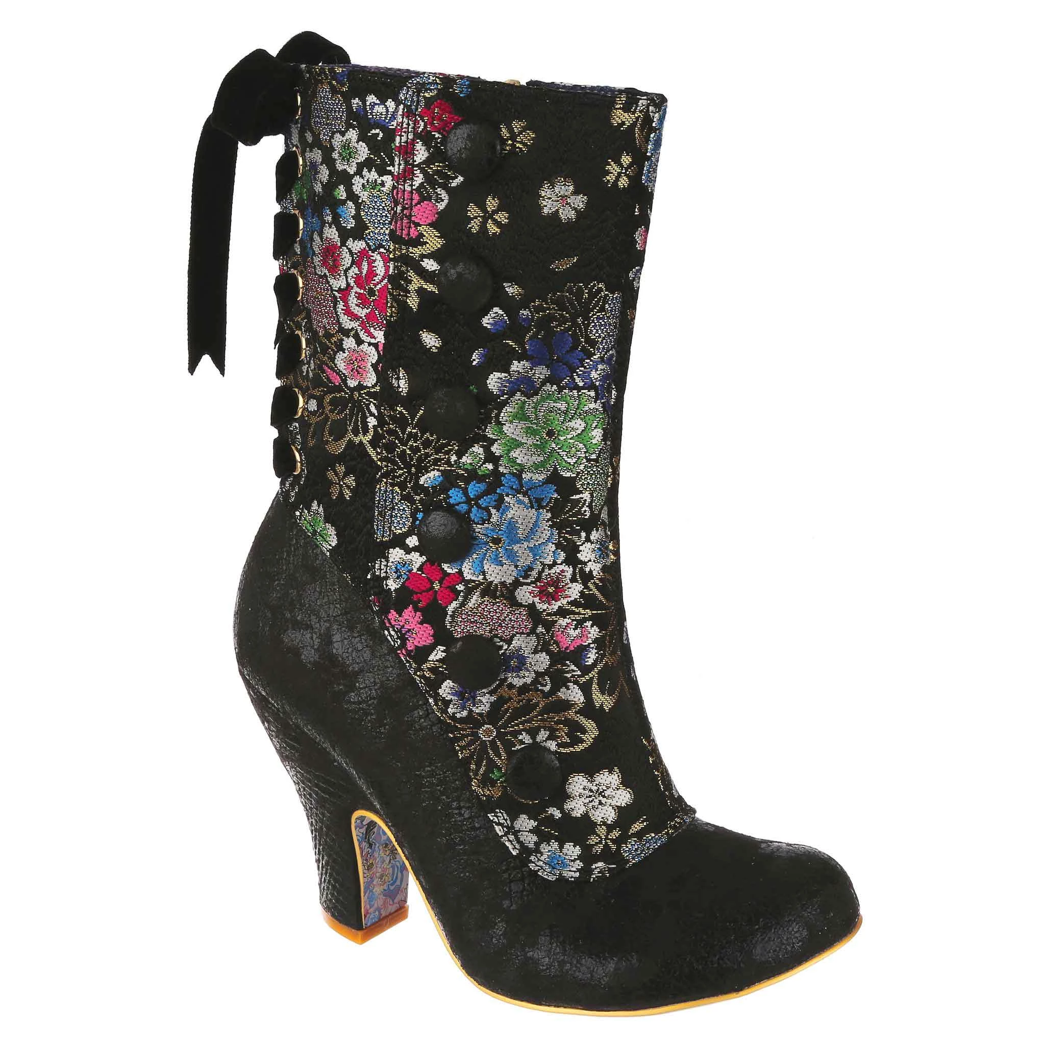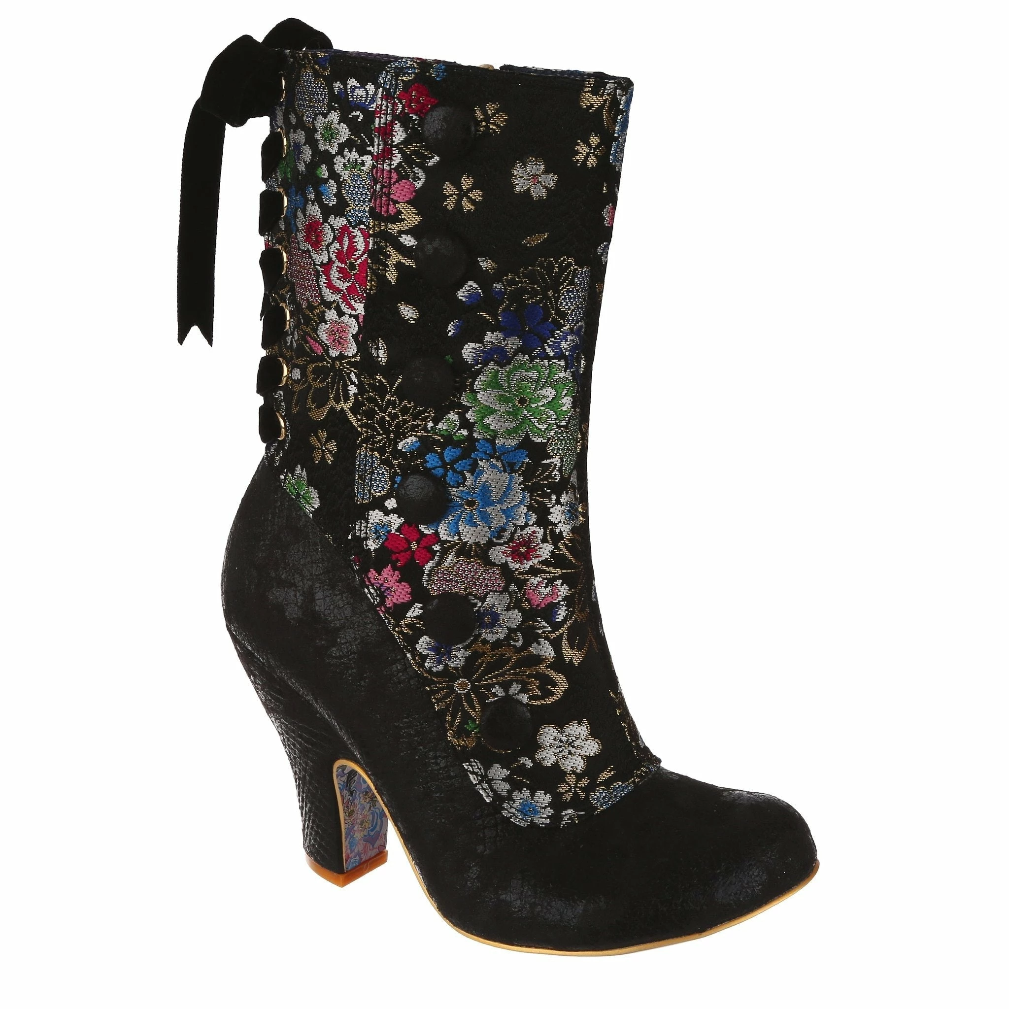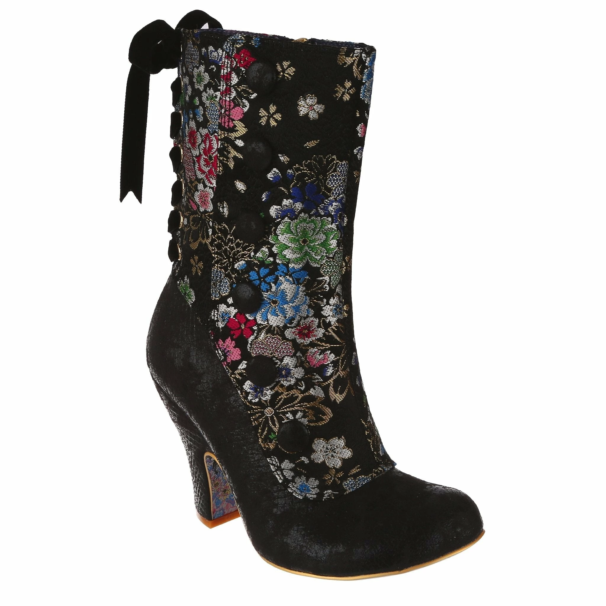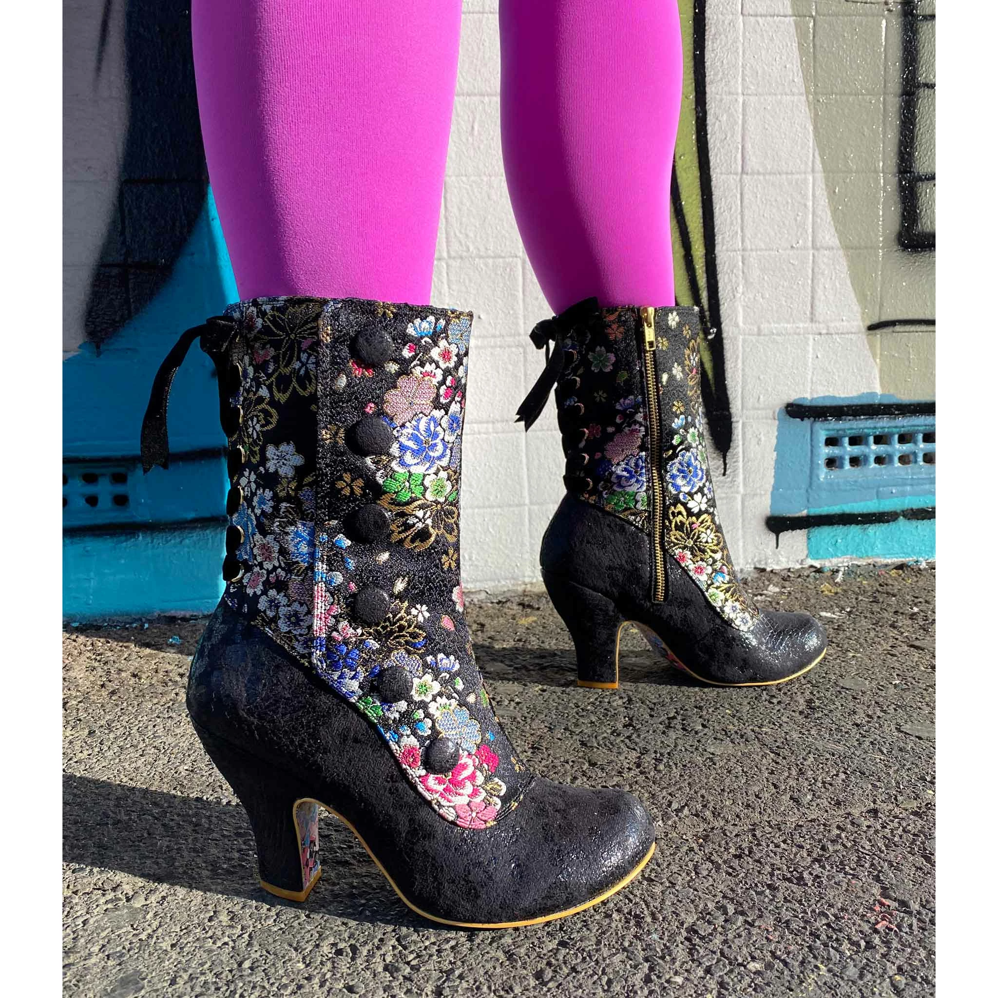 Feel like a queen in these calf high heeled boots! Regal metallic floral fabric in opulent gold, blue, green and pink creates a spats style top of the boot, with a black ribbon laces up the back so it can be loosened to your perfect fit. Below the spats is a wet look black reptile print fabric that matches the covered buttons and continues onto the heel, making a sophisticated and cohesive style. Finished with a zip fastening, slip these beauties on and get strutting!