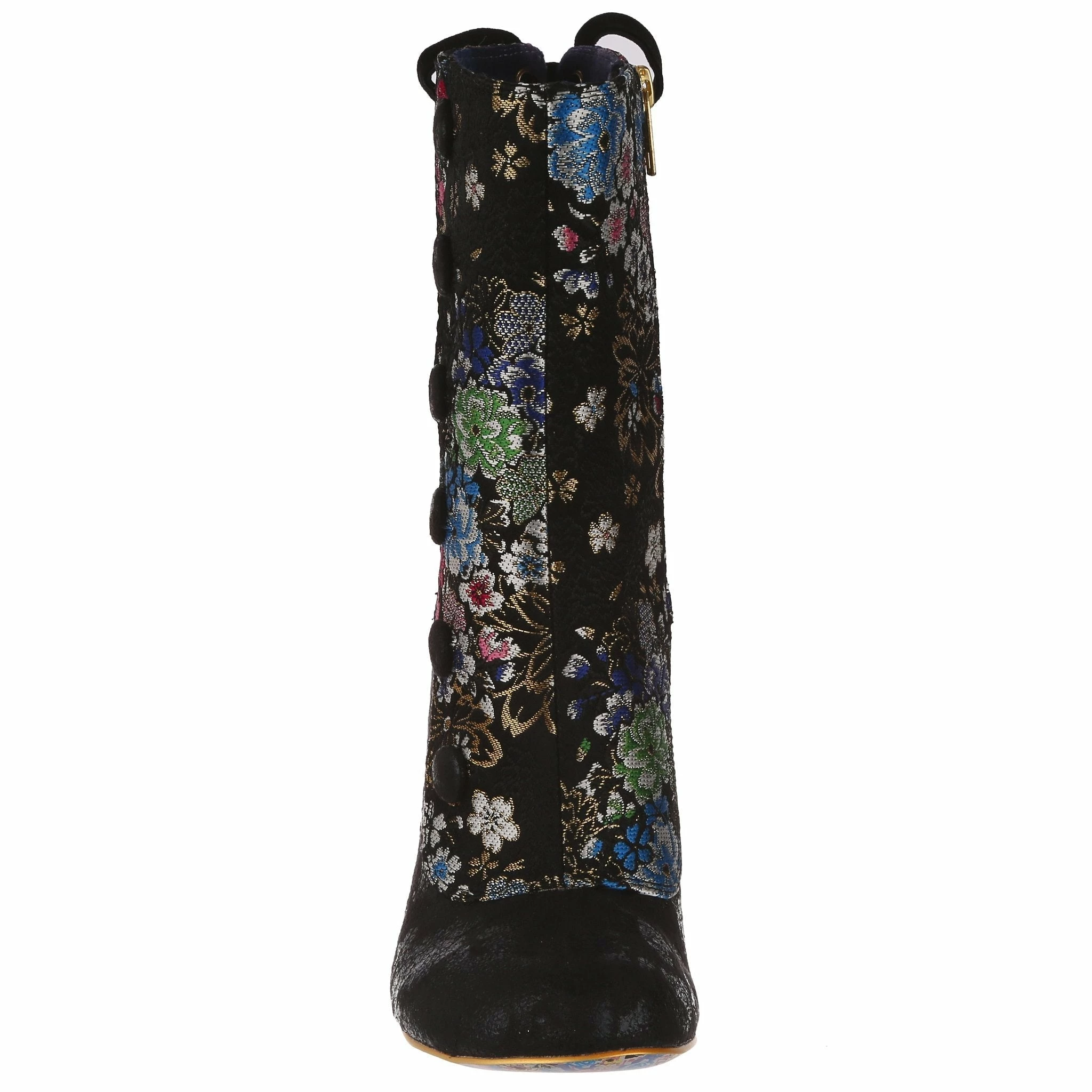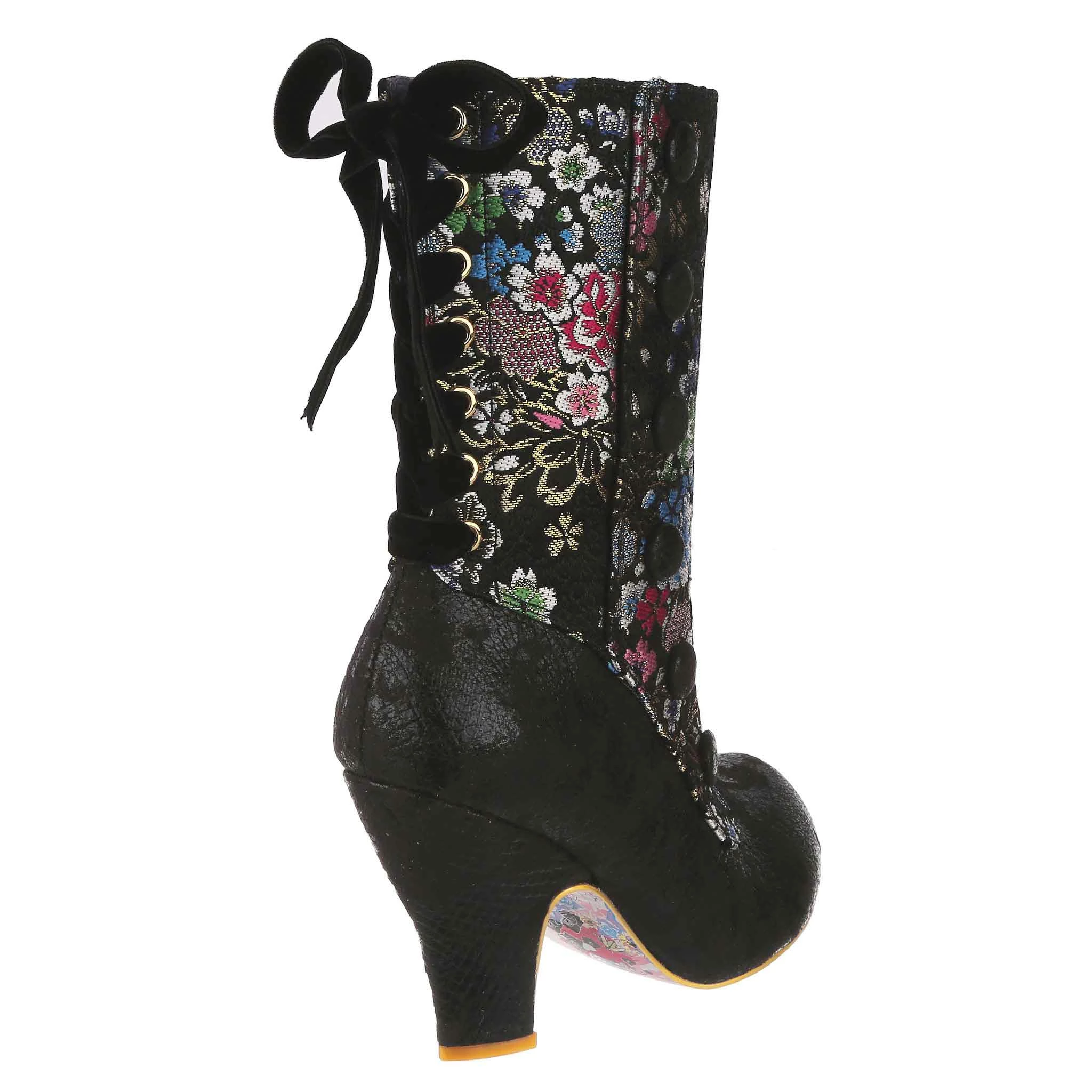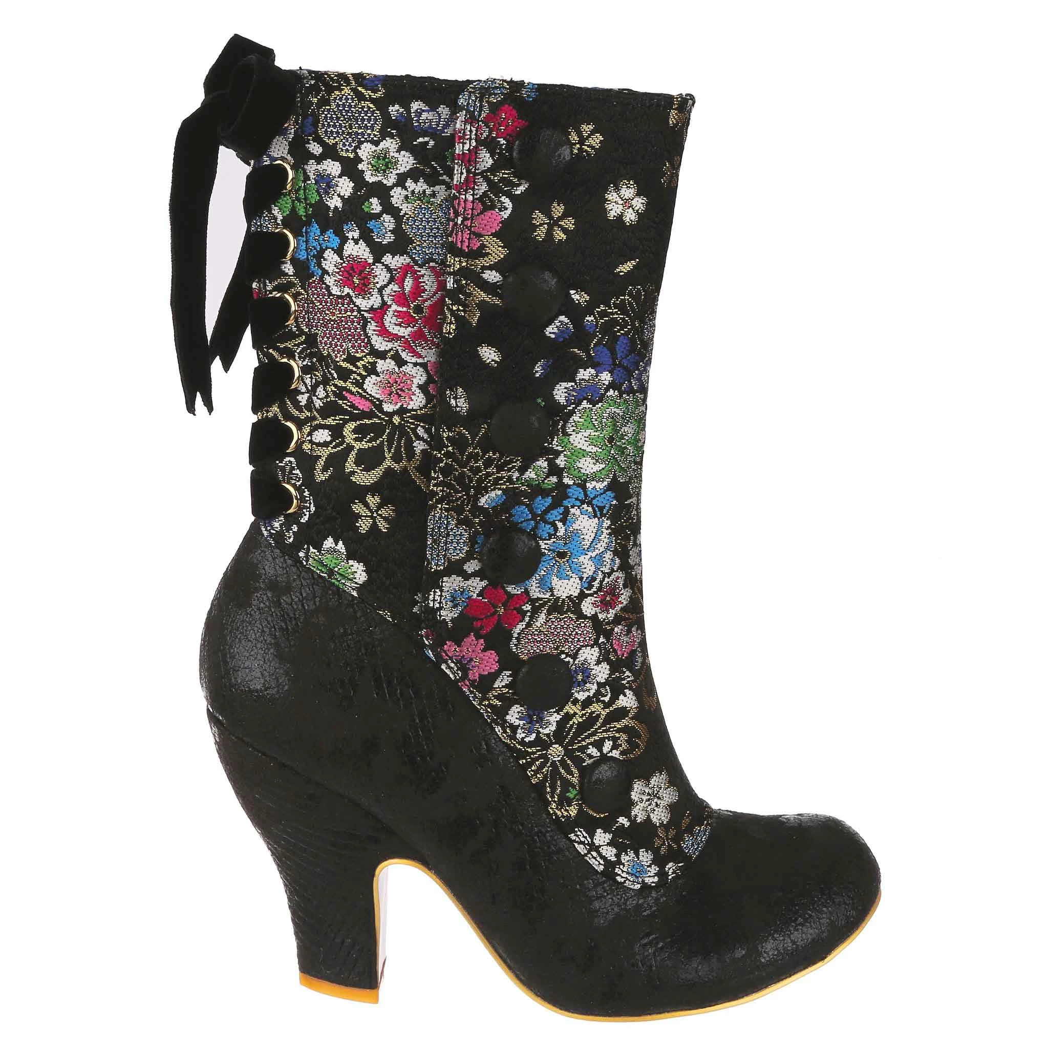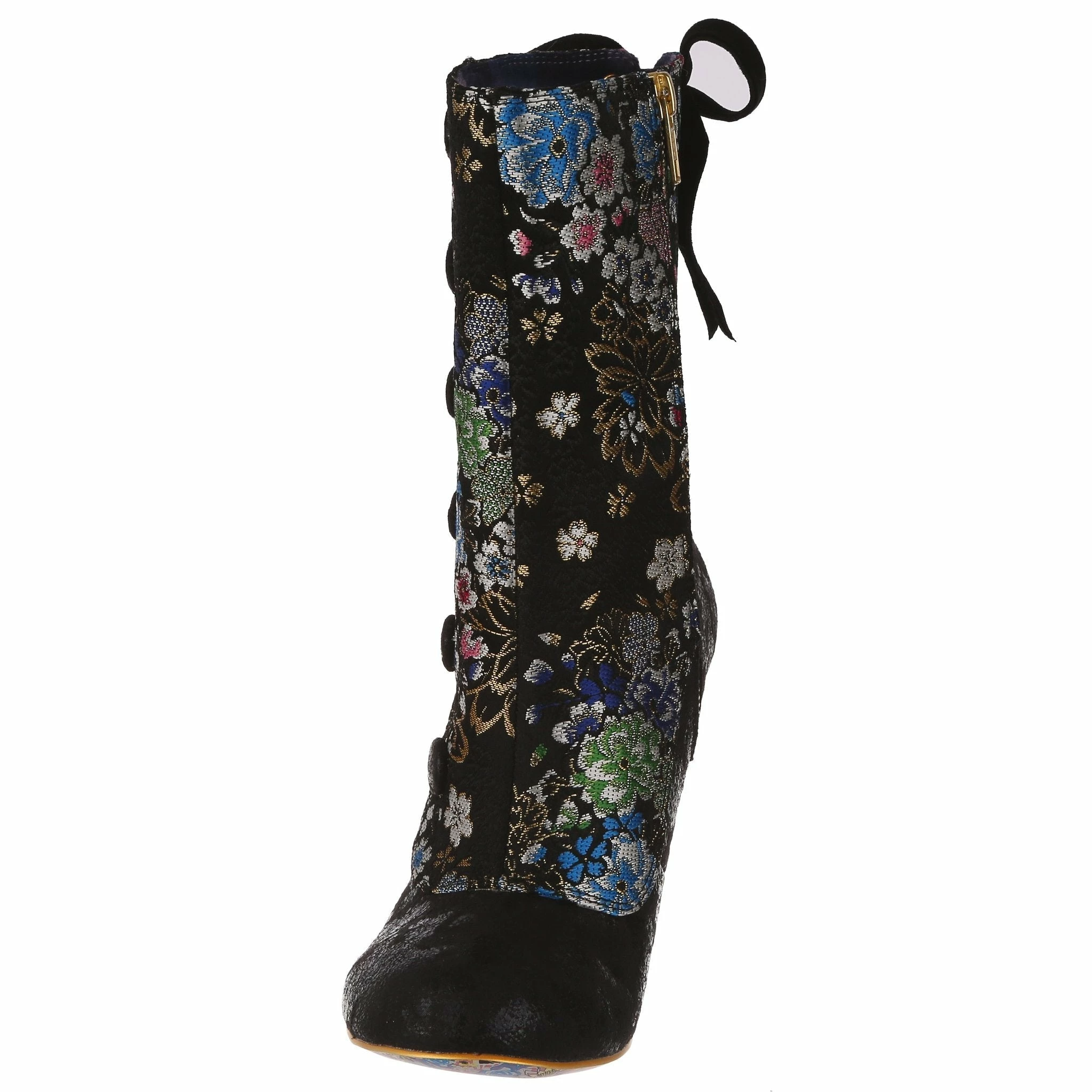 Feel like a queen in these calf high heeled boots! Regal metallic floral fabric in opulent gold, blue, green and pink creates a spats style top of the boot, with a black ribbon laces up the back so it can be loosened to your perfect fit. Below the spats is a wet look black reptile print fabric that matches the covered buttons and continues onto the heel, making a sophisticated and cohesive style. Finished with a zip fastening, slip these beauties on and get strutting!