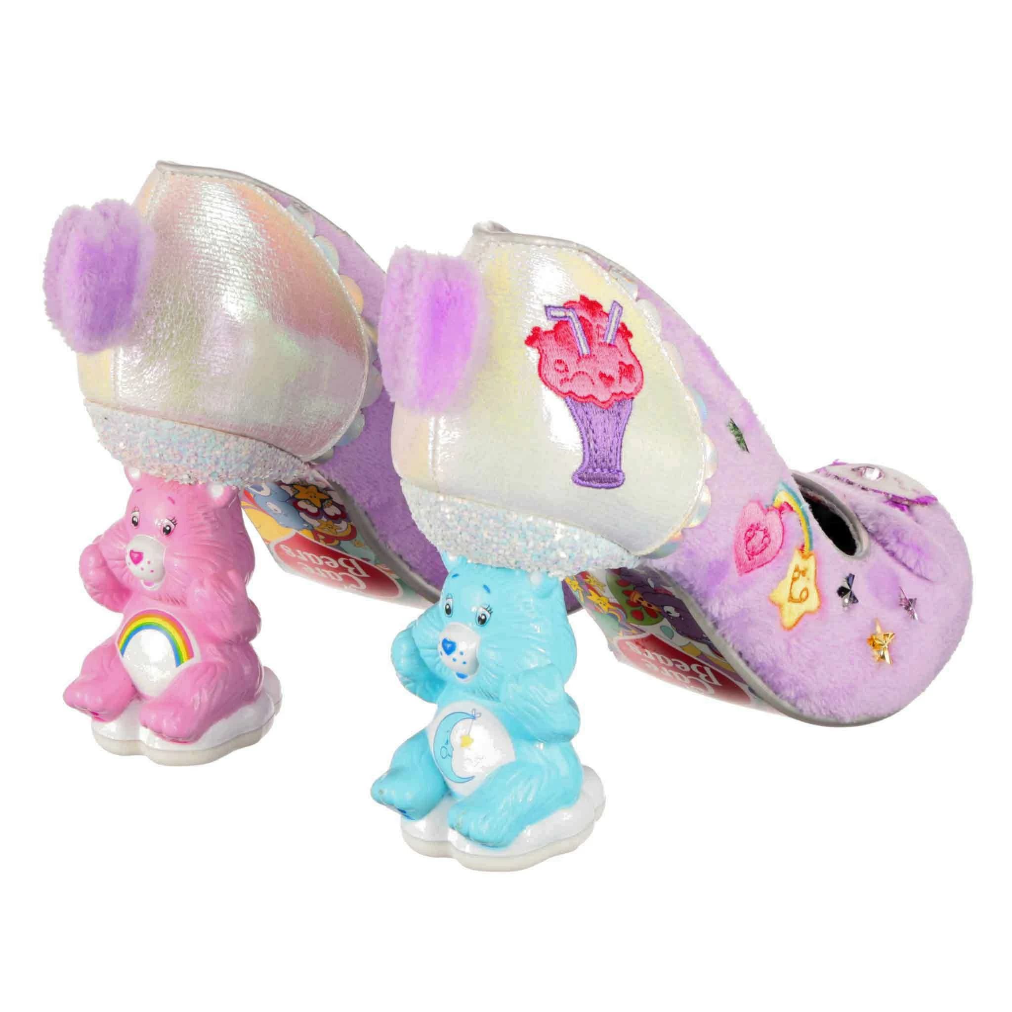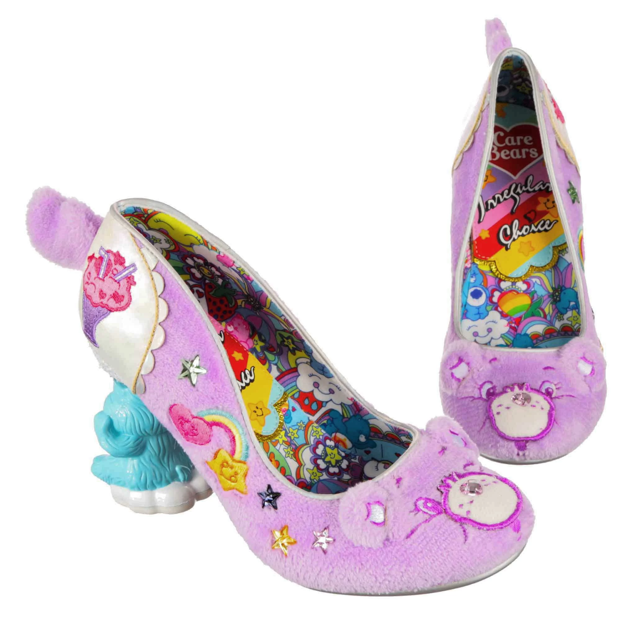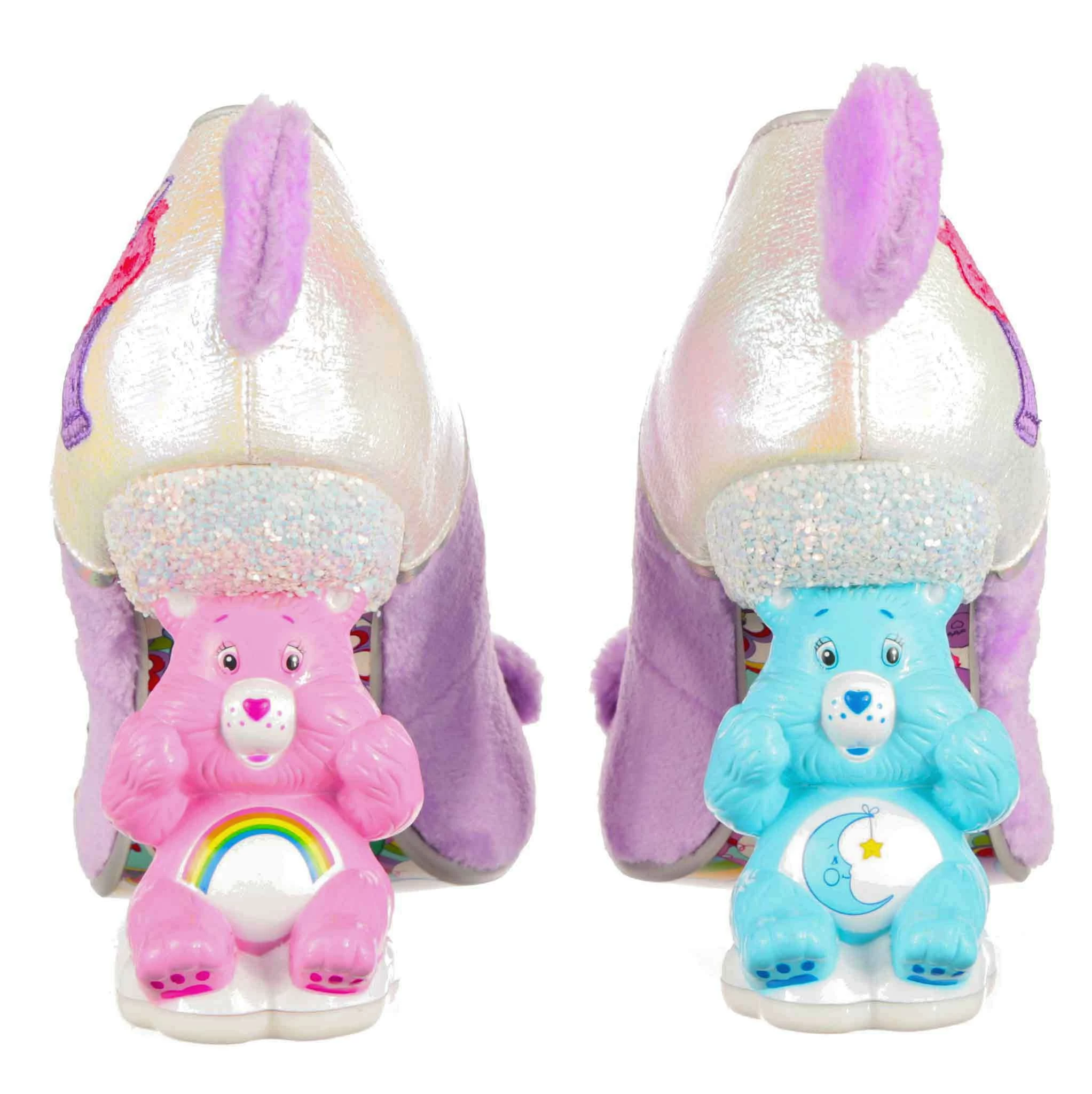 Get cuddly with Share Bear in these super snuggly concept heels! Super soft lilac faux fur covers the upper, and on the toe is Share Bear’s adorable face – complete with a sparkly love heart gem for a nose, and sweet little ears! Didn’t think these shoes could get any more magical? Both shoes feature a stand-out Care Bears concept heel – one of Bedtime Bear and one of Cheer Bear – and cute little faux fur tail. Dreams really do come true!