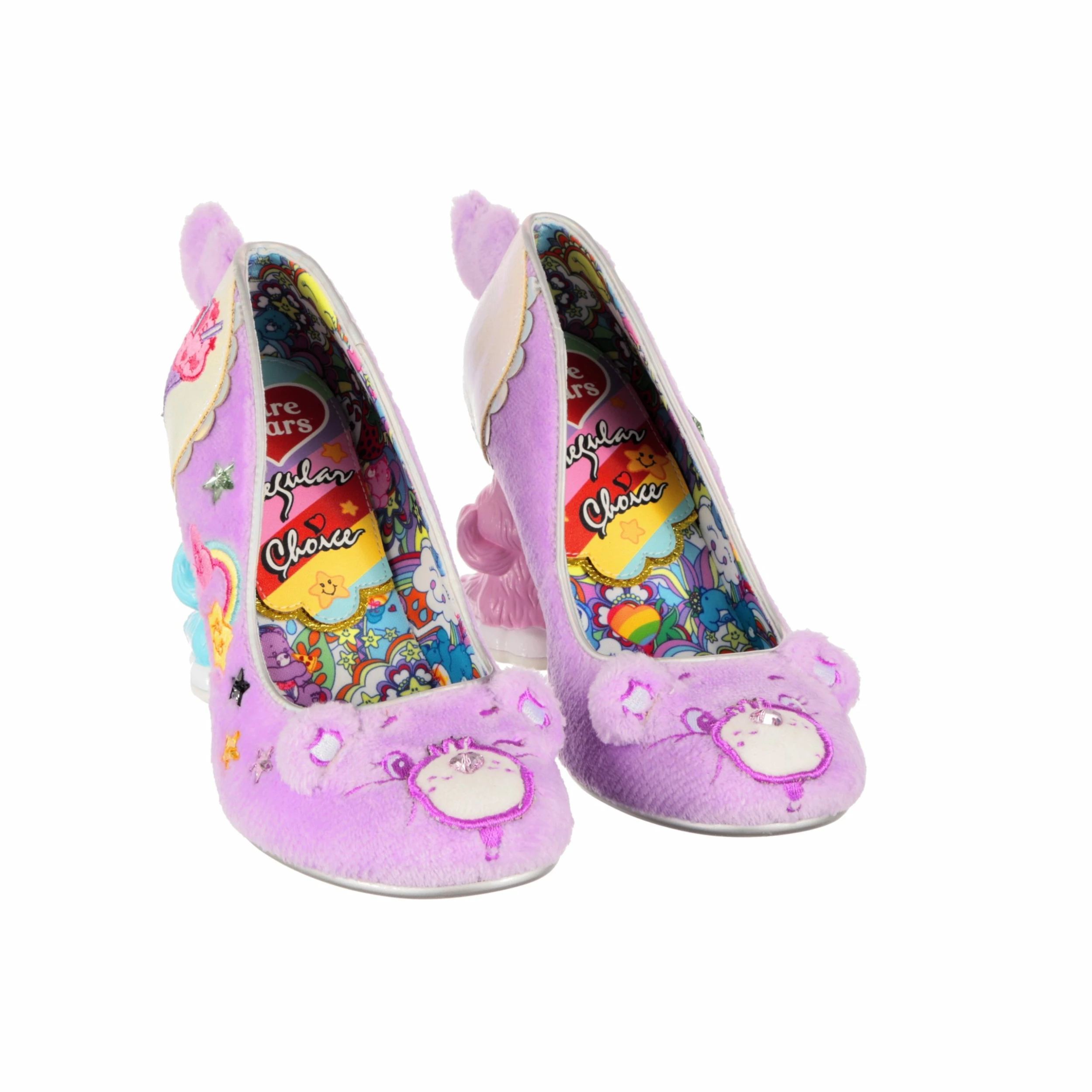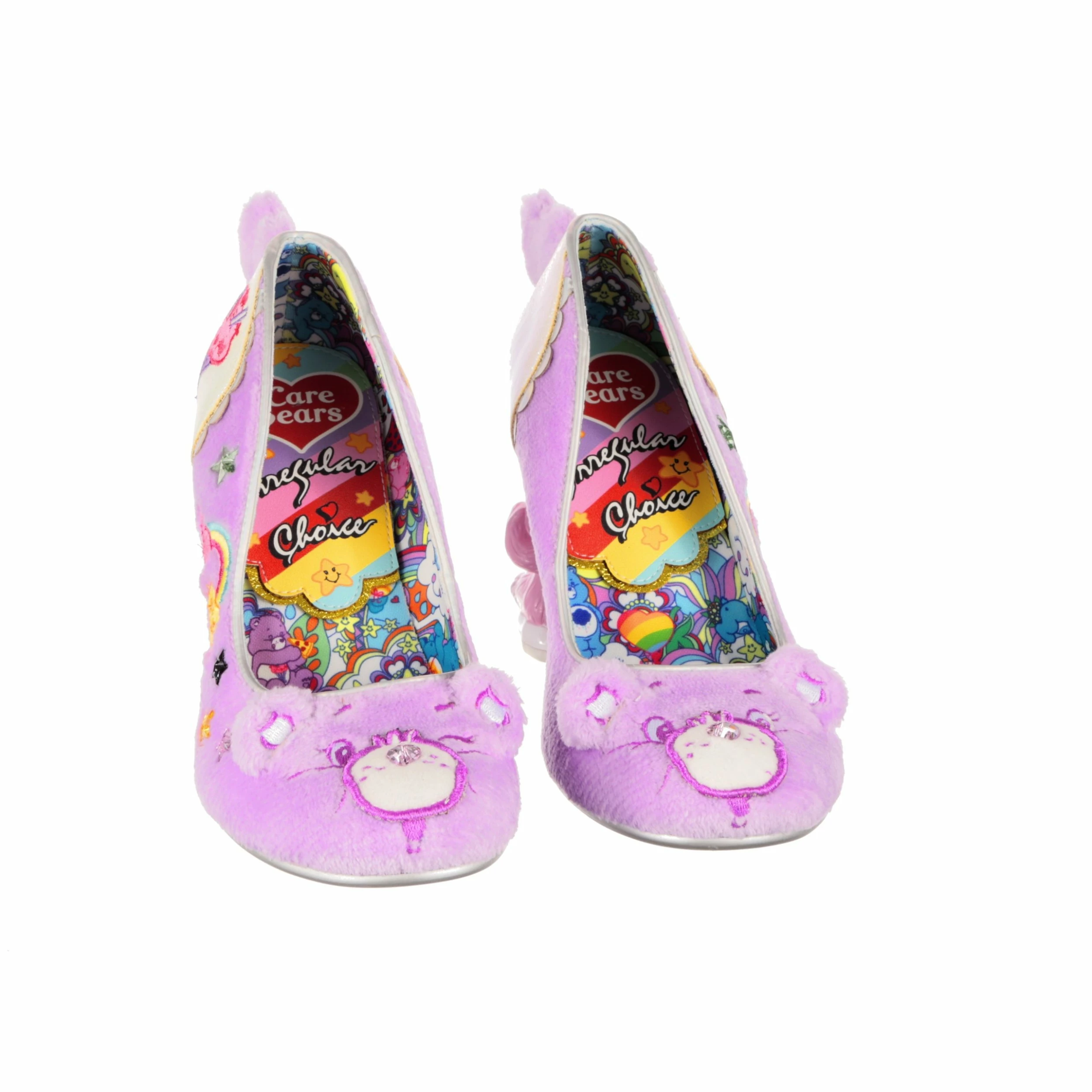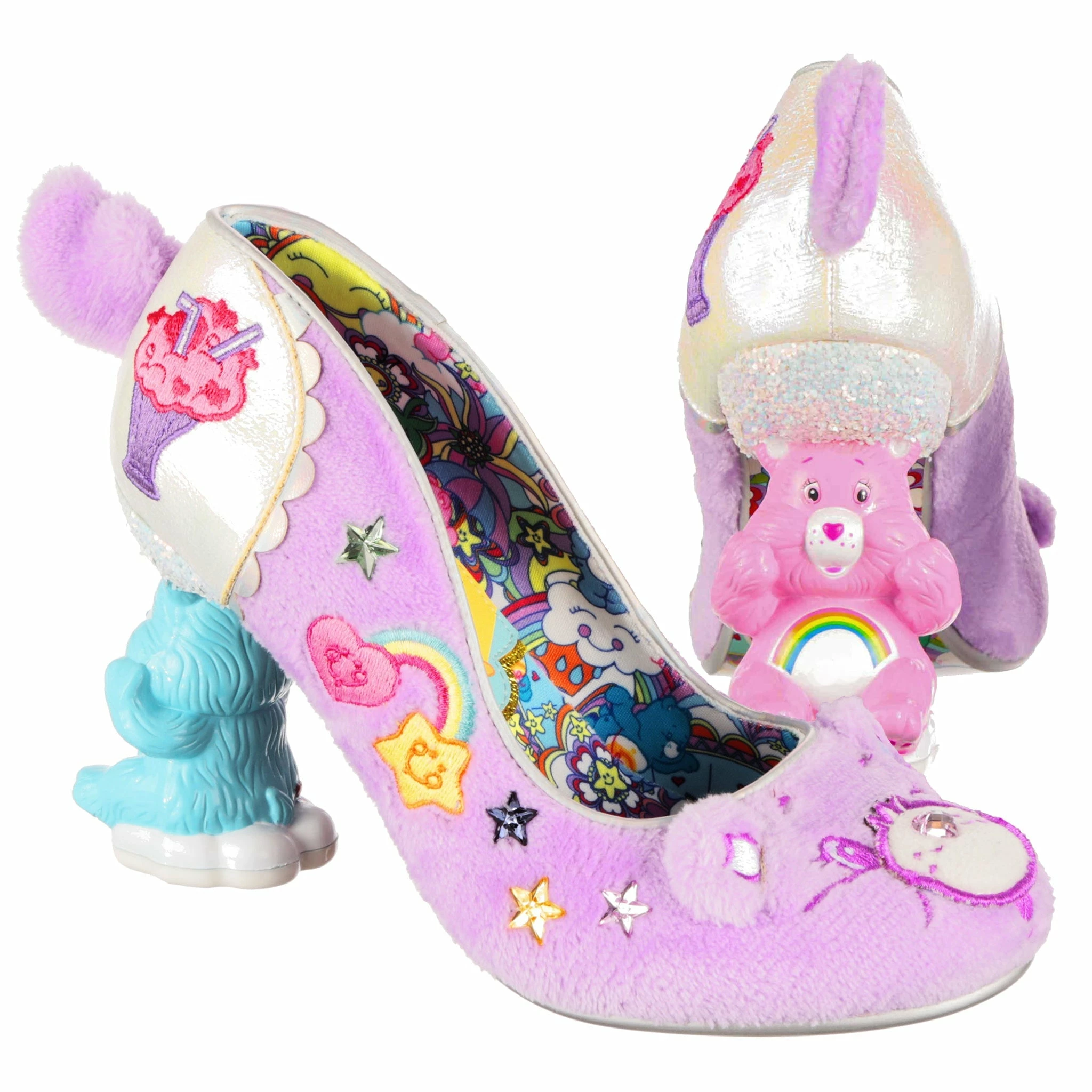 Get cuddly with Share Bear in these super snuggly concept heels! Super soft lilac faux fur covers the upper, and on the toe is Share Bear’s adorable face – complete with a sparkly love heart gem for a nose, and sweet little ears! Didn’t think these shoes could get any more magical? Both shoes feature a stand-out Care Bears concept heel – one of Bedtime Bear and one of Cheer Bear – and cute little faux fur tail. Dreams really do come true!