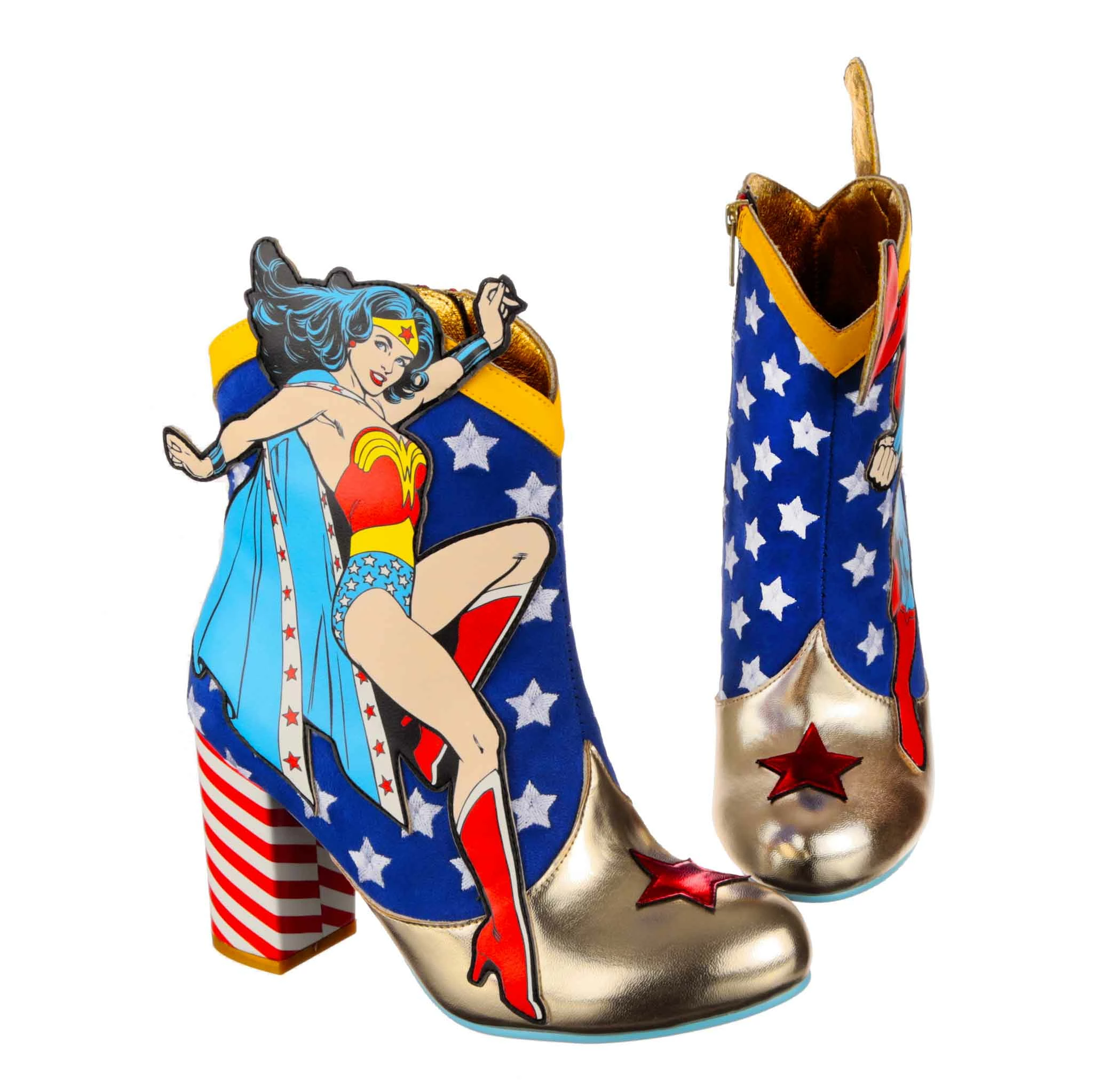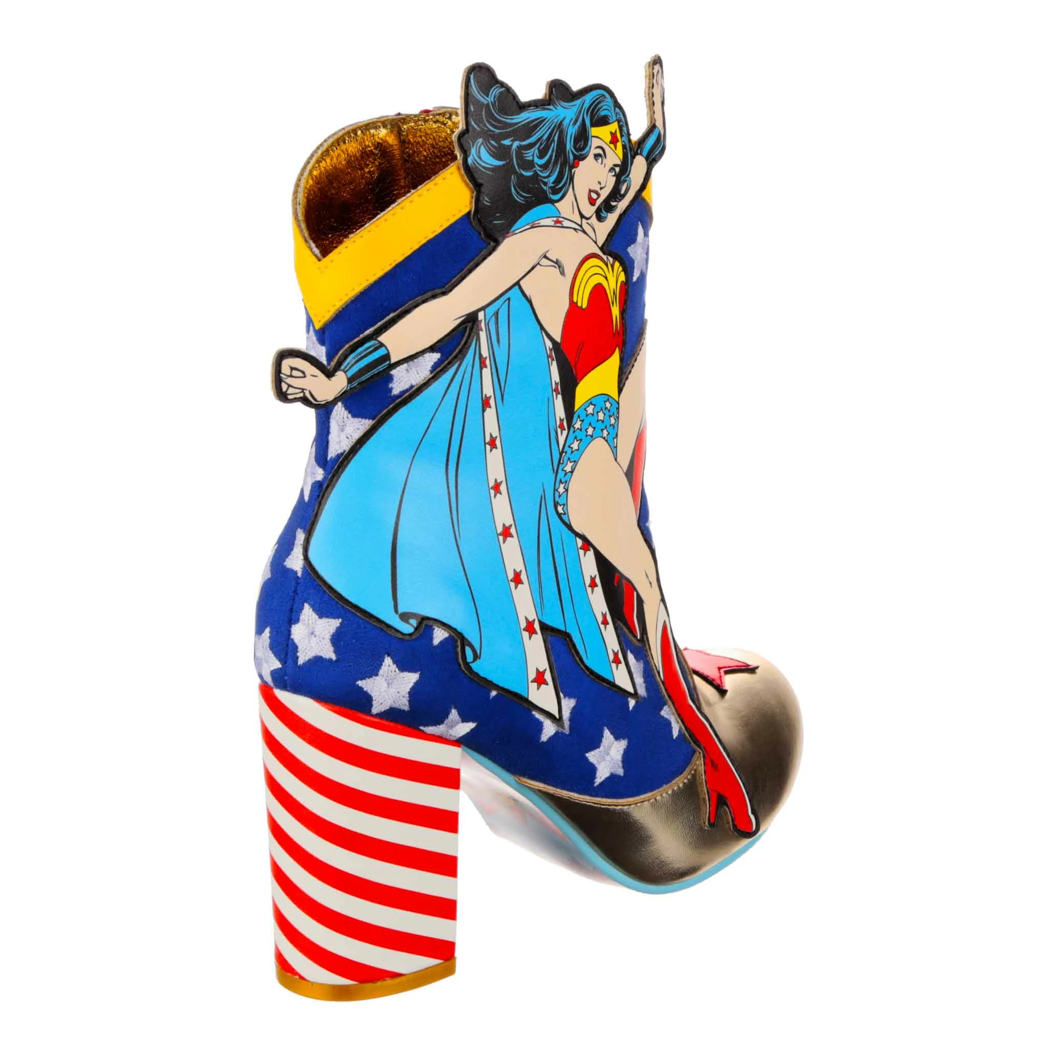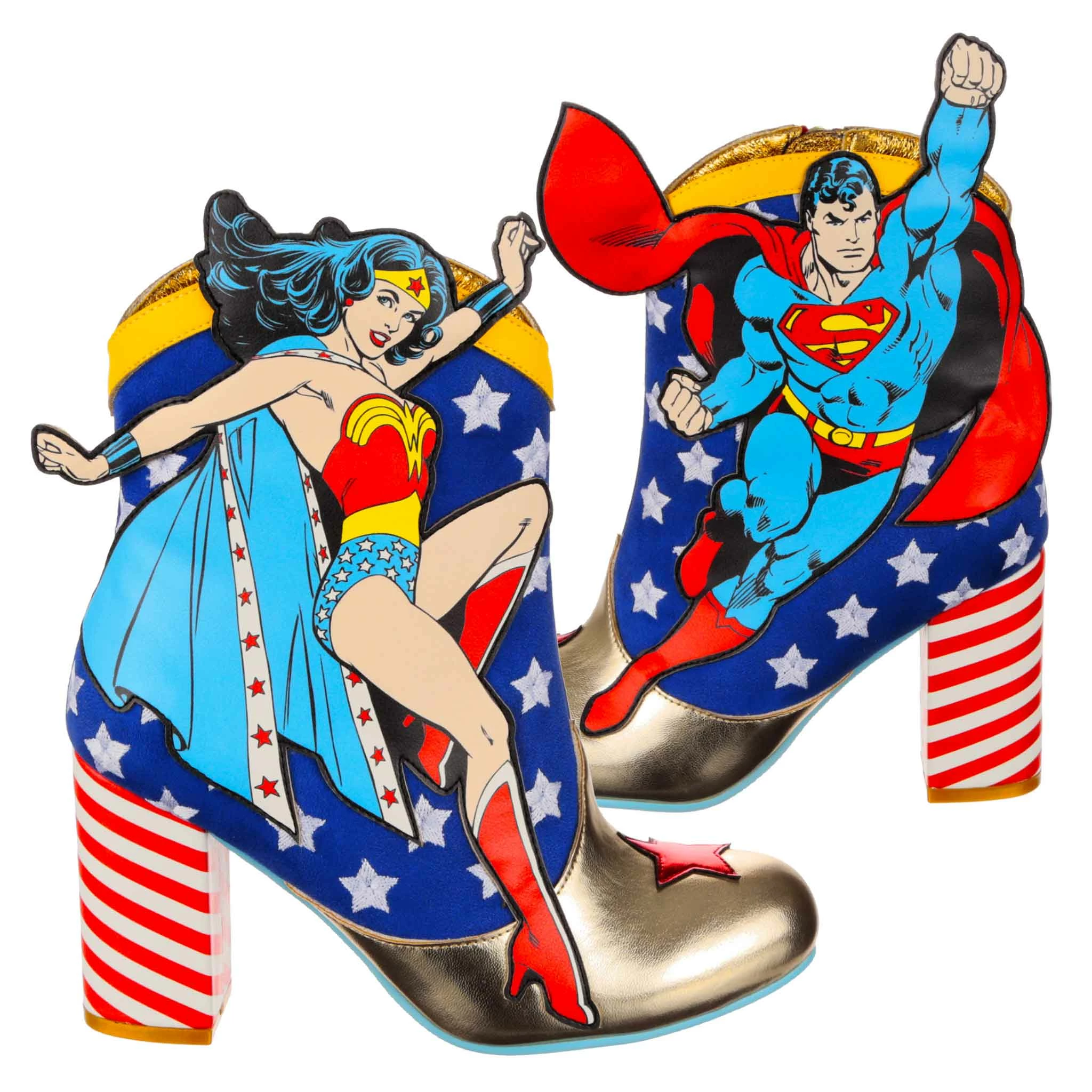 These super high heeled boots were made to celebrate Wonder Woman and Superman! Each pair features a classic comic book applique graphic of Wonder Woman and Superman, ready to take flight or join the fight! These ankle boots feature a high block heel, inside zip fastening, and a star-spangled blue upper with red candy striping and gold detailing, perfect for any fans of the DC Super Heroes!