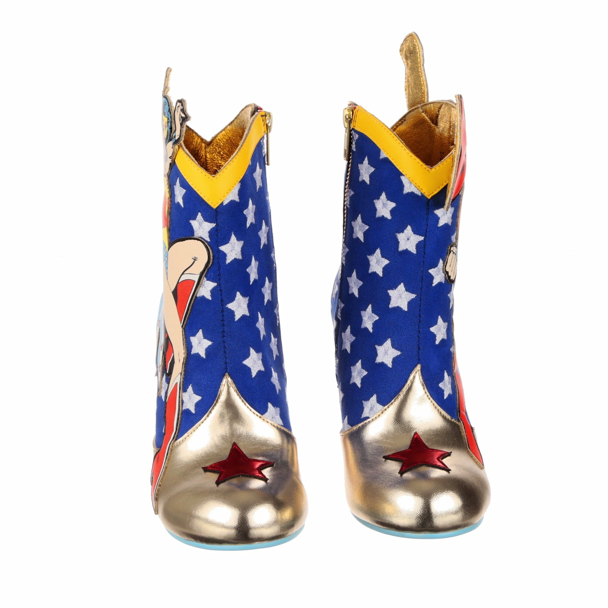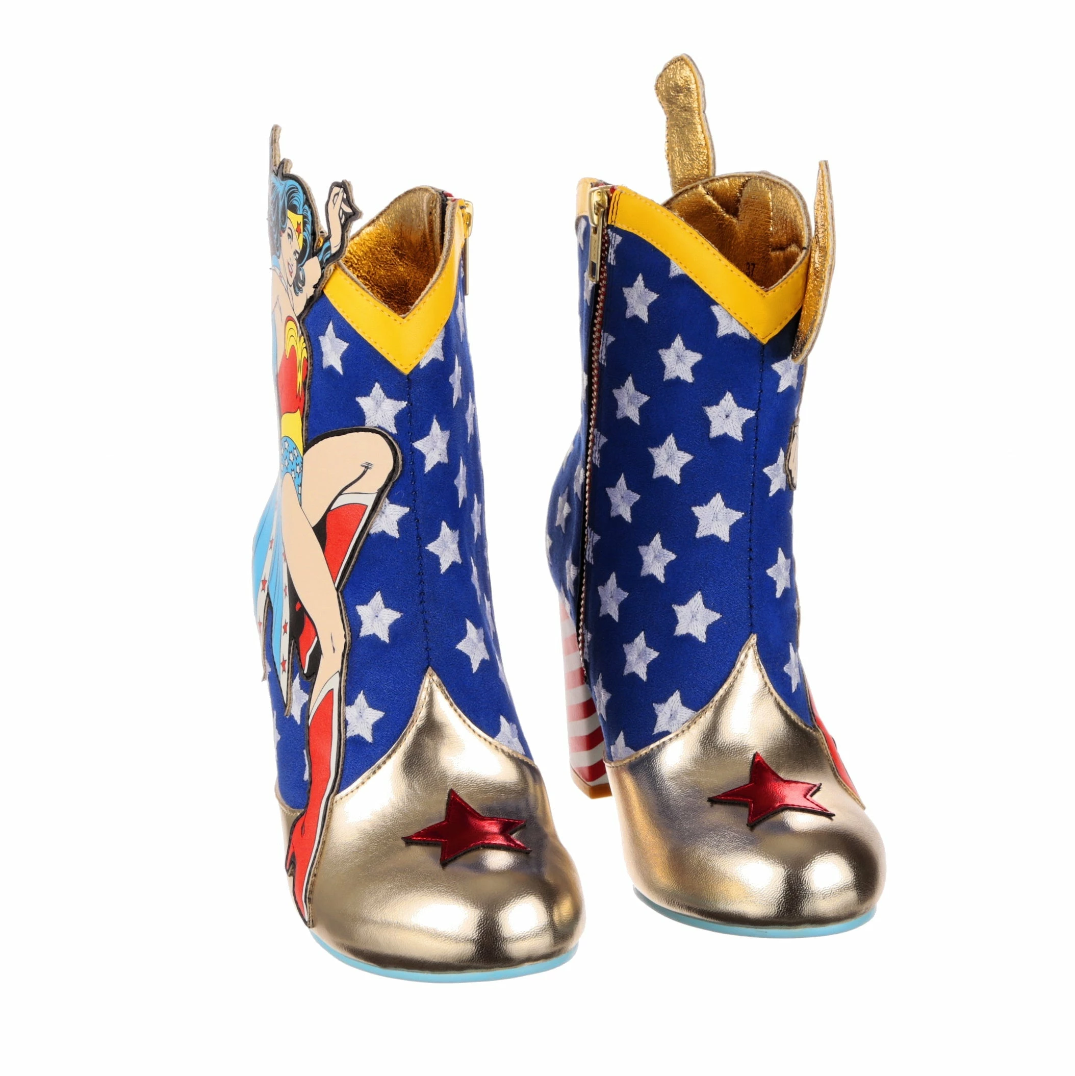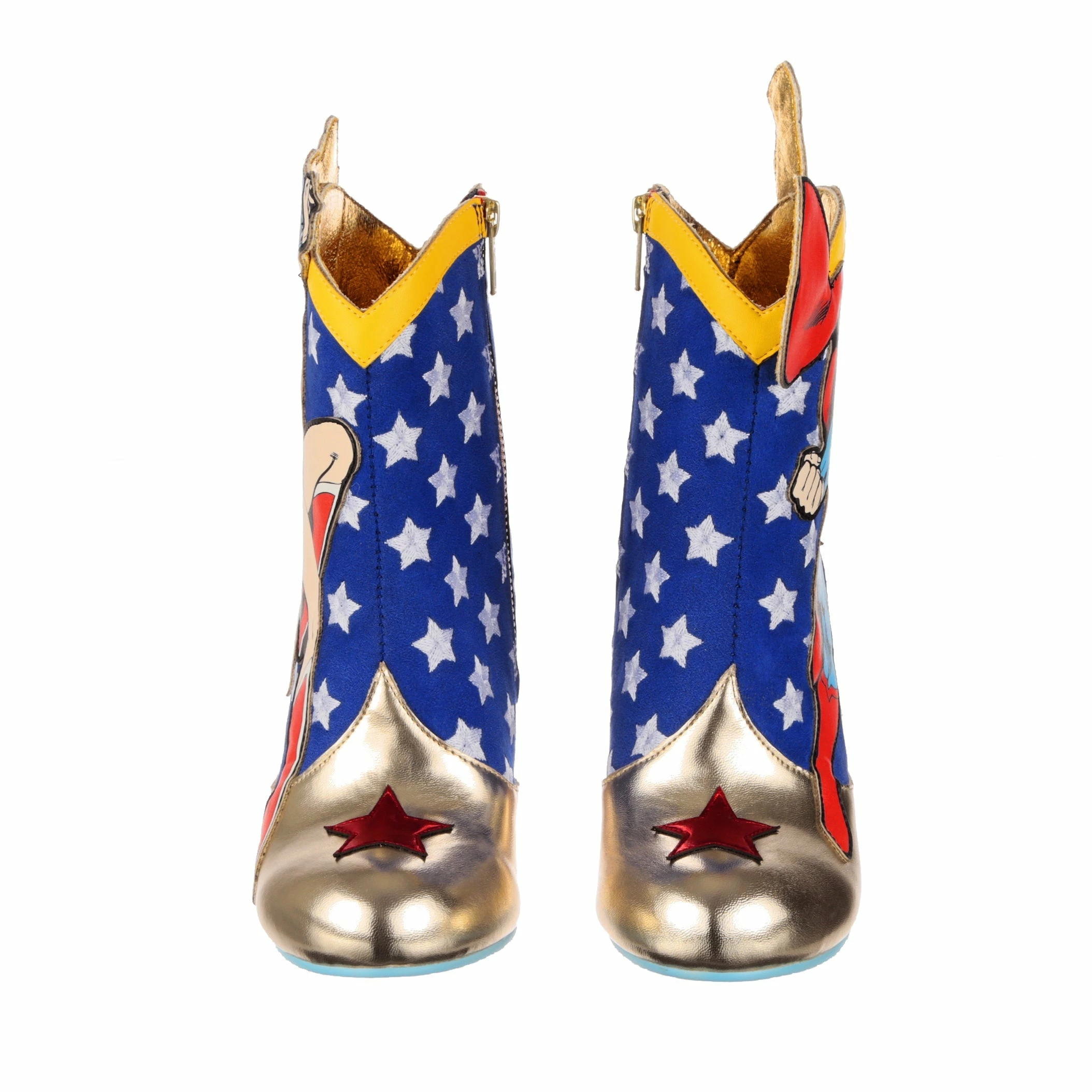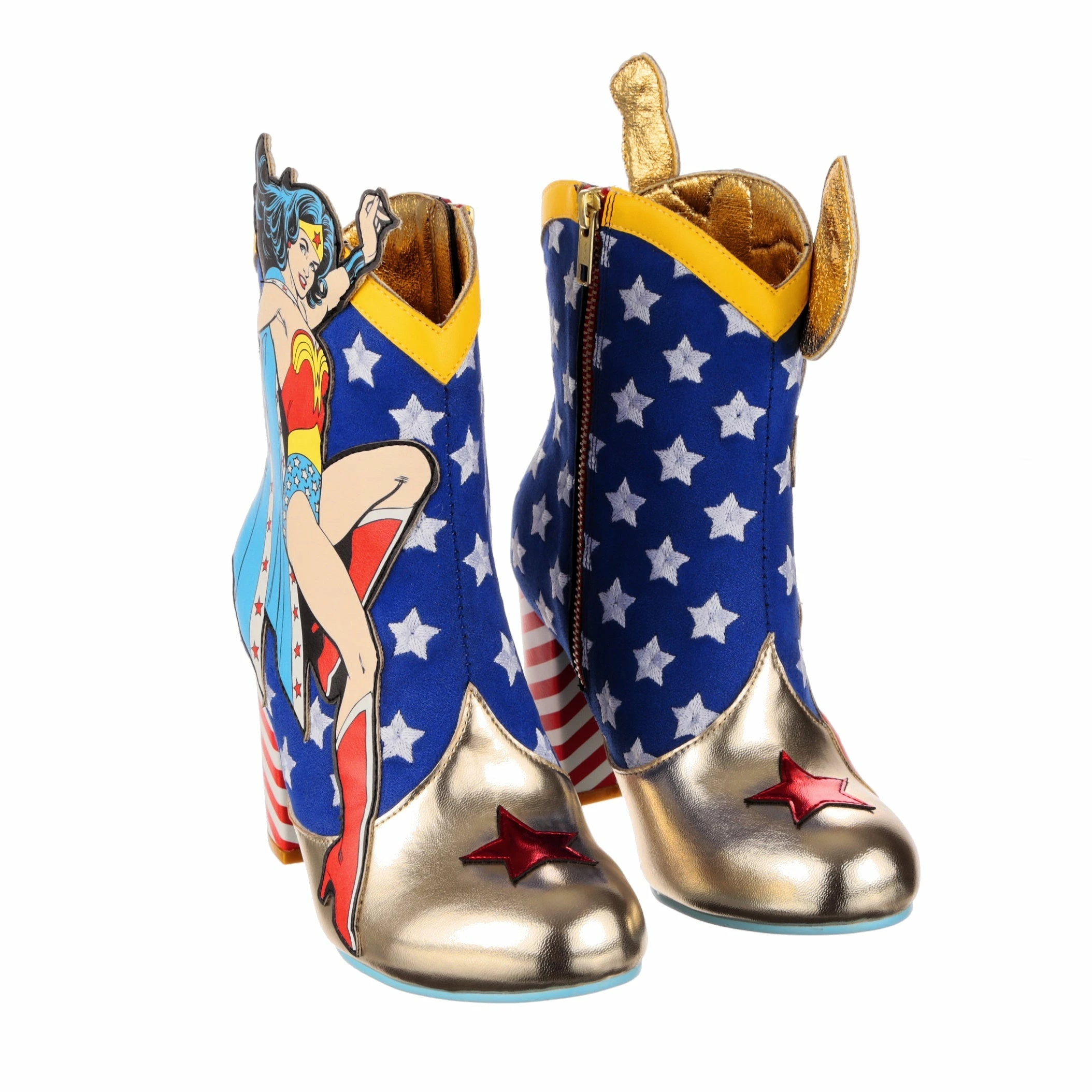 These super high heeled boots were made to celebrate Wonder Woman and Superman! Each pair features a classic comic book applique graphic of Wonder Woman and Superman, ready to take flight or join the fight! These ankle boots feature a high block heel, inside zip fastening, and a star-spangled blue upper with red candy striping and gold detailing, perfect for any fans of the DC Super Heroes!