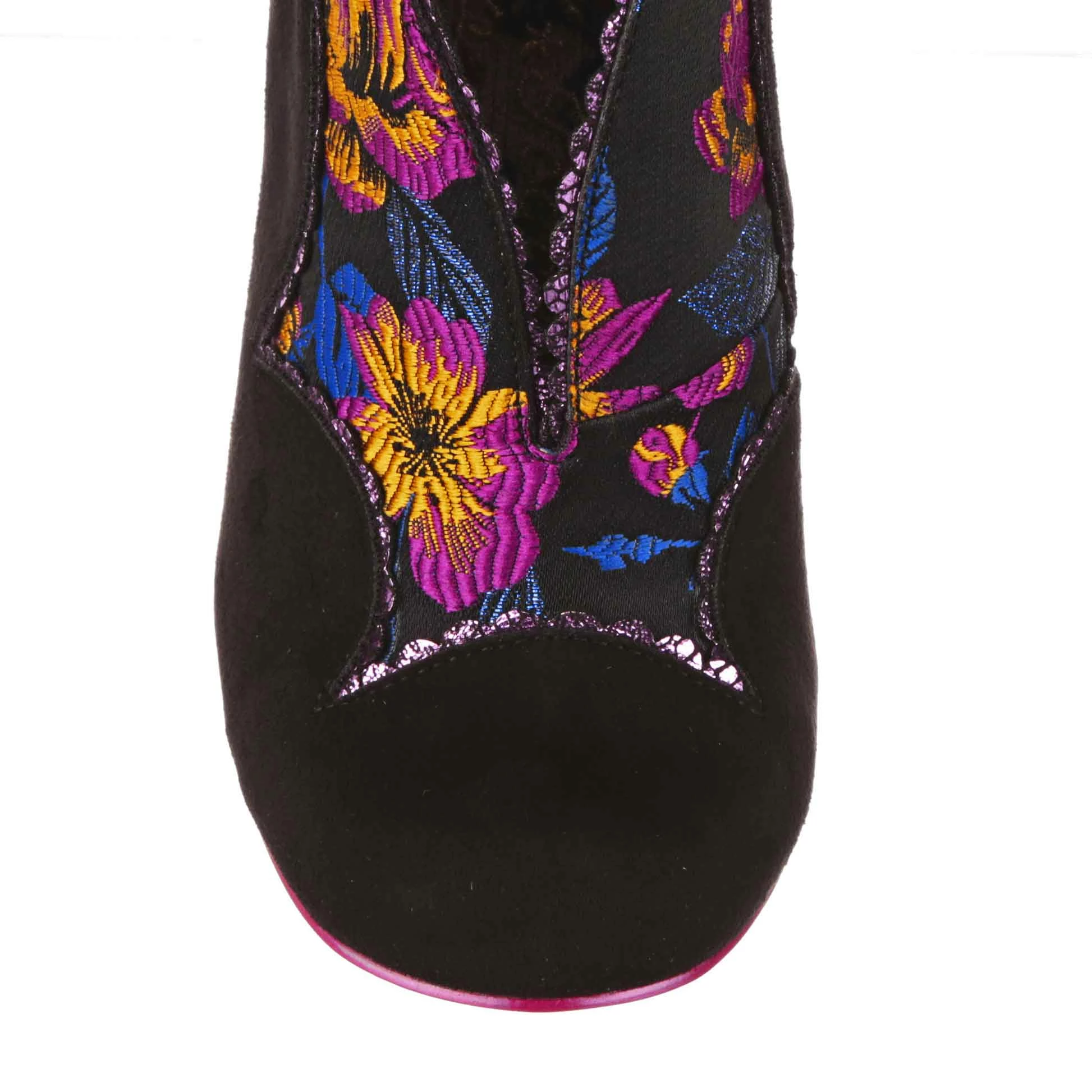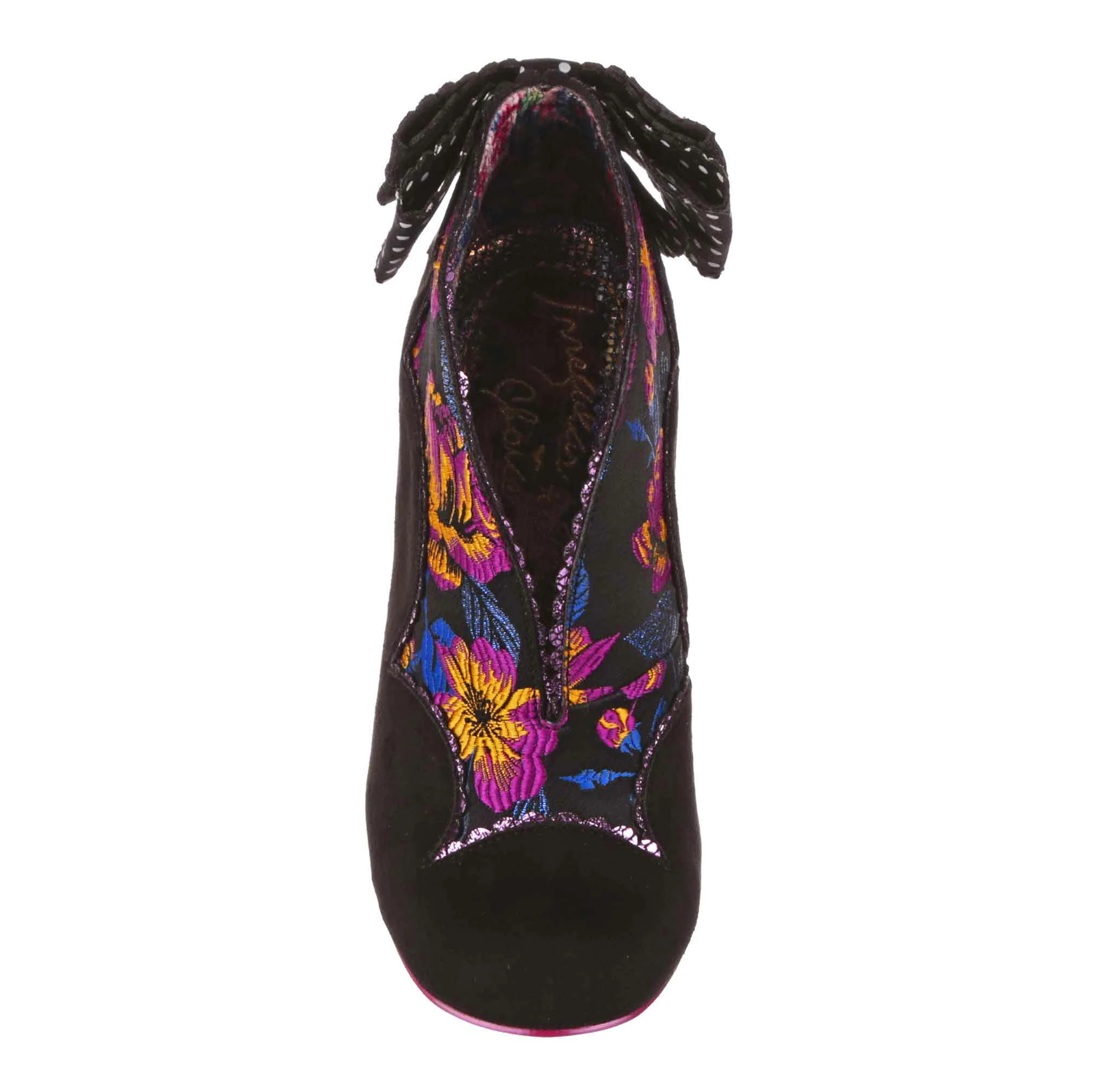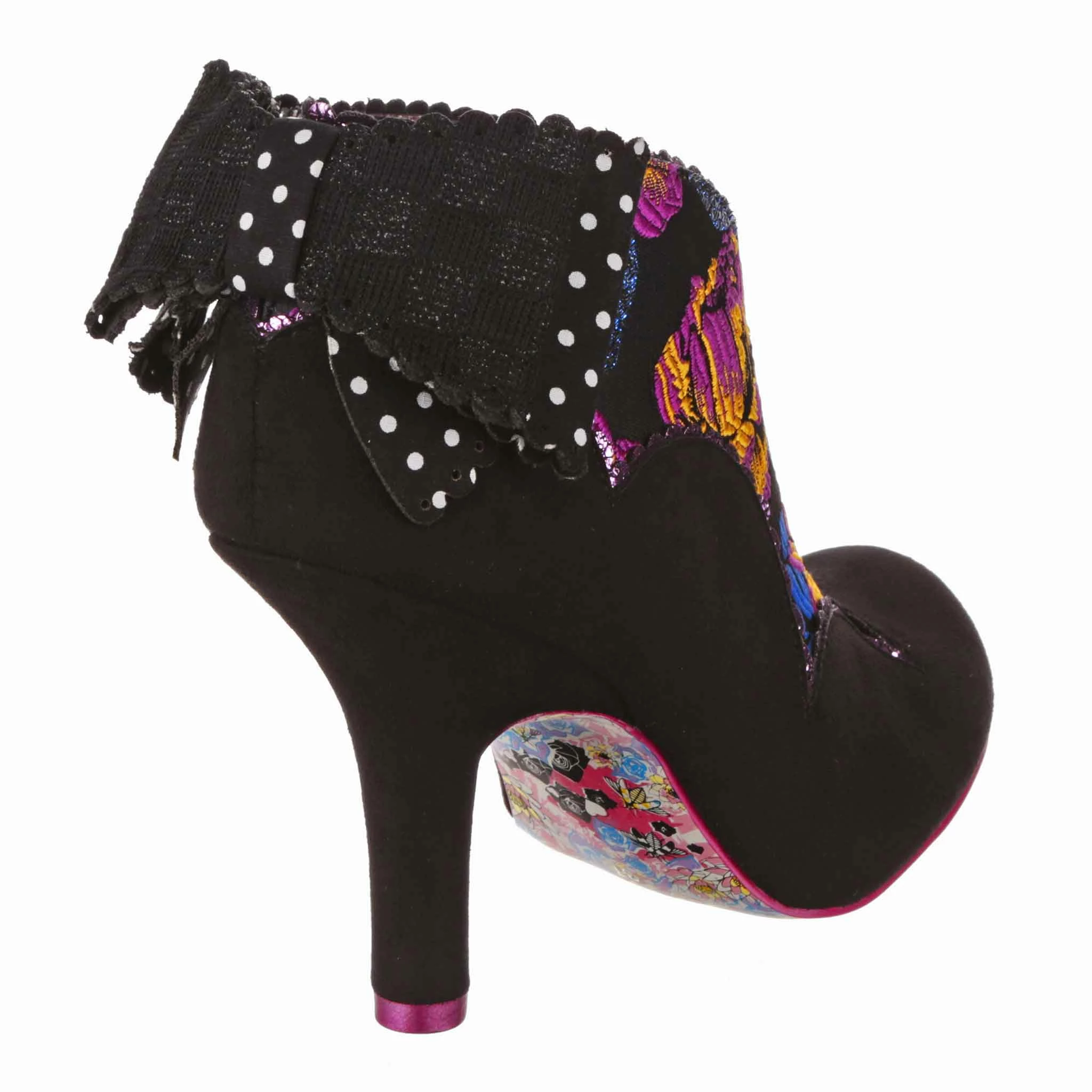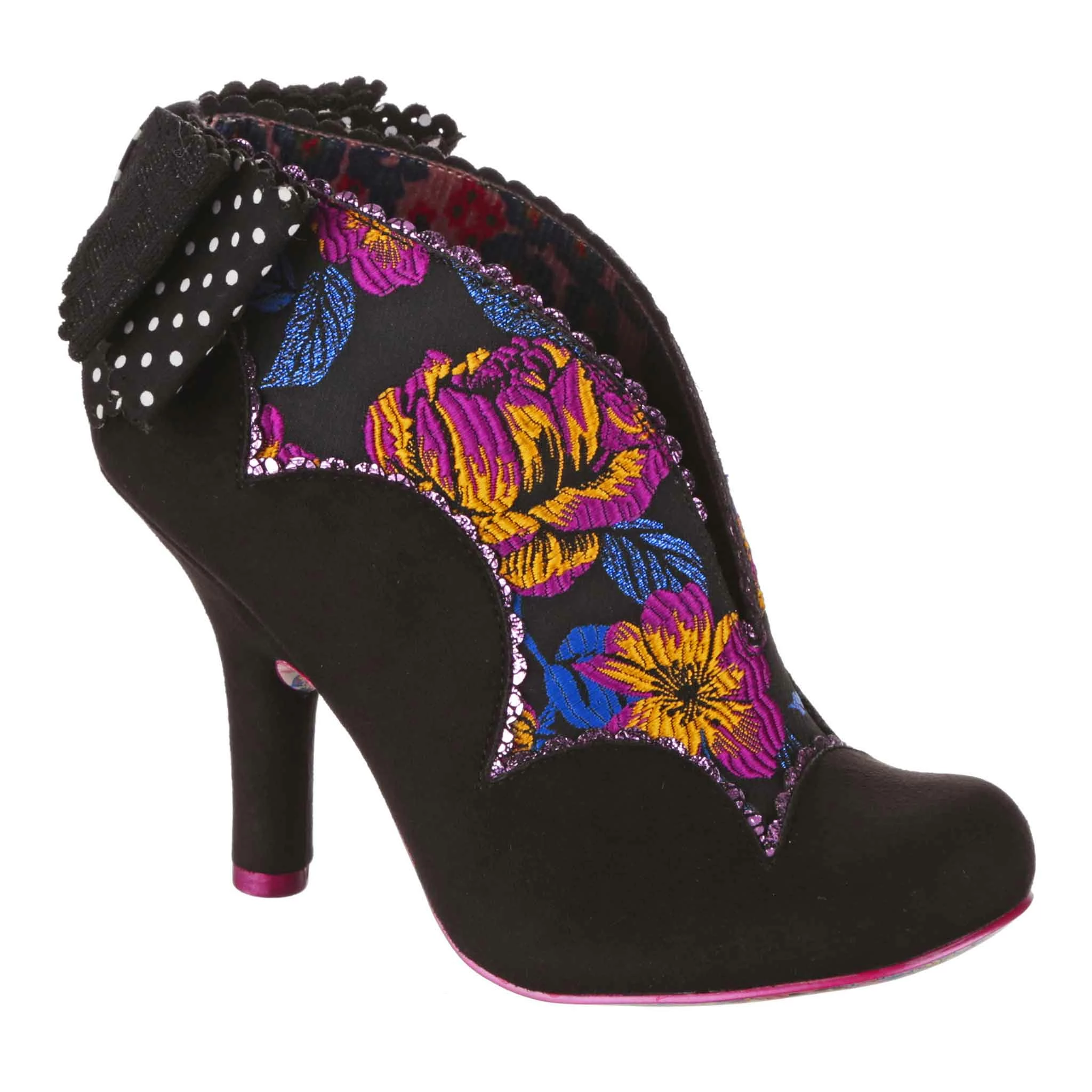 This perfect little shoe belongs in a patisserie! Luxurious black material is paired with a floral fabric that looks right at home on these vintage inspired high heels, all decorated with metallic scalloping. An elaborate bow sits on the back of the heel, in black woven and polkadot printed fabric for an extra bit of va va voom!